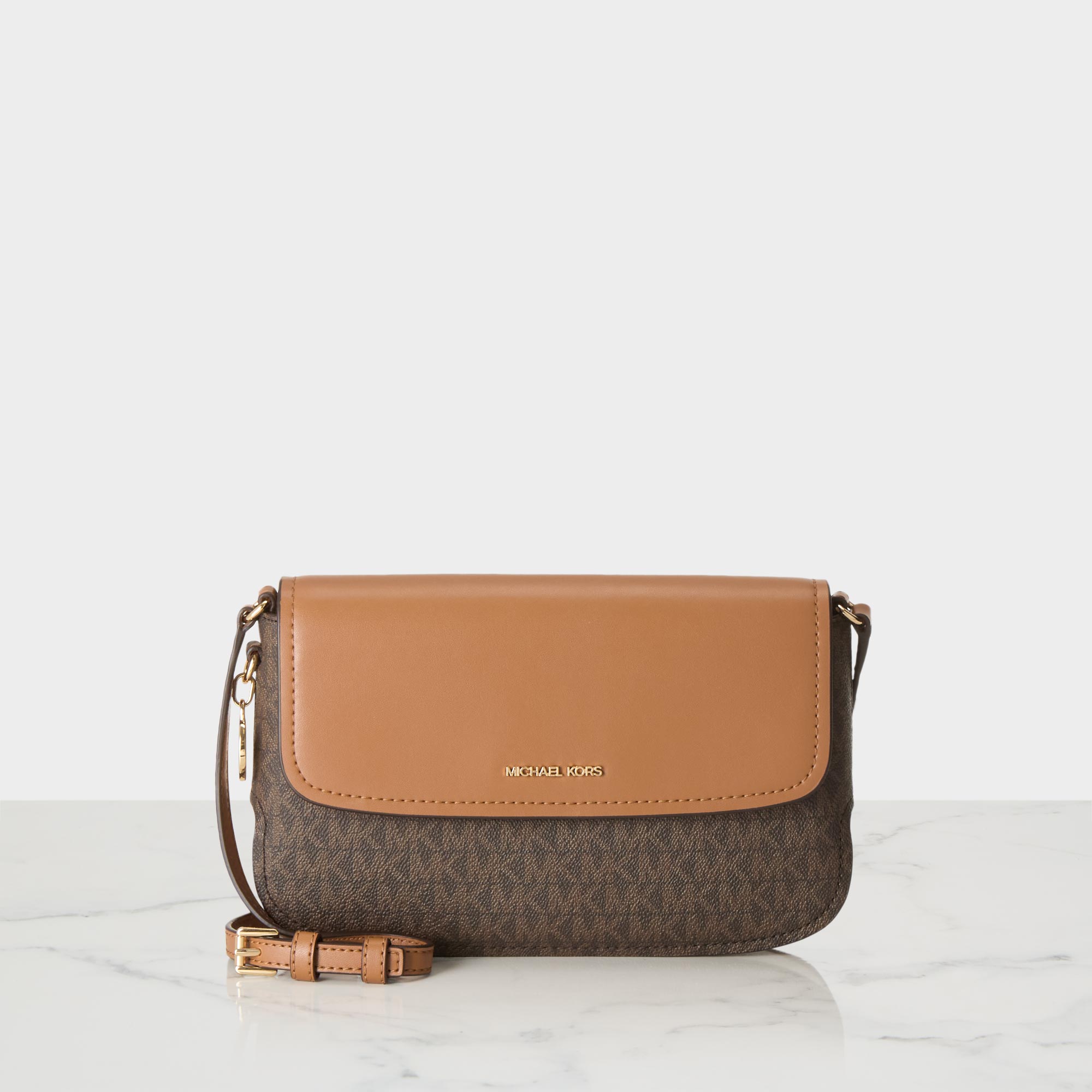 • Foldover flap closure, magnetic snap-button fastening, gold-tone hardware, front logo lettering, MK logo motif, adjustable crossbody strap, hanging MK logo bag charm, tonal stitching, grained finish