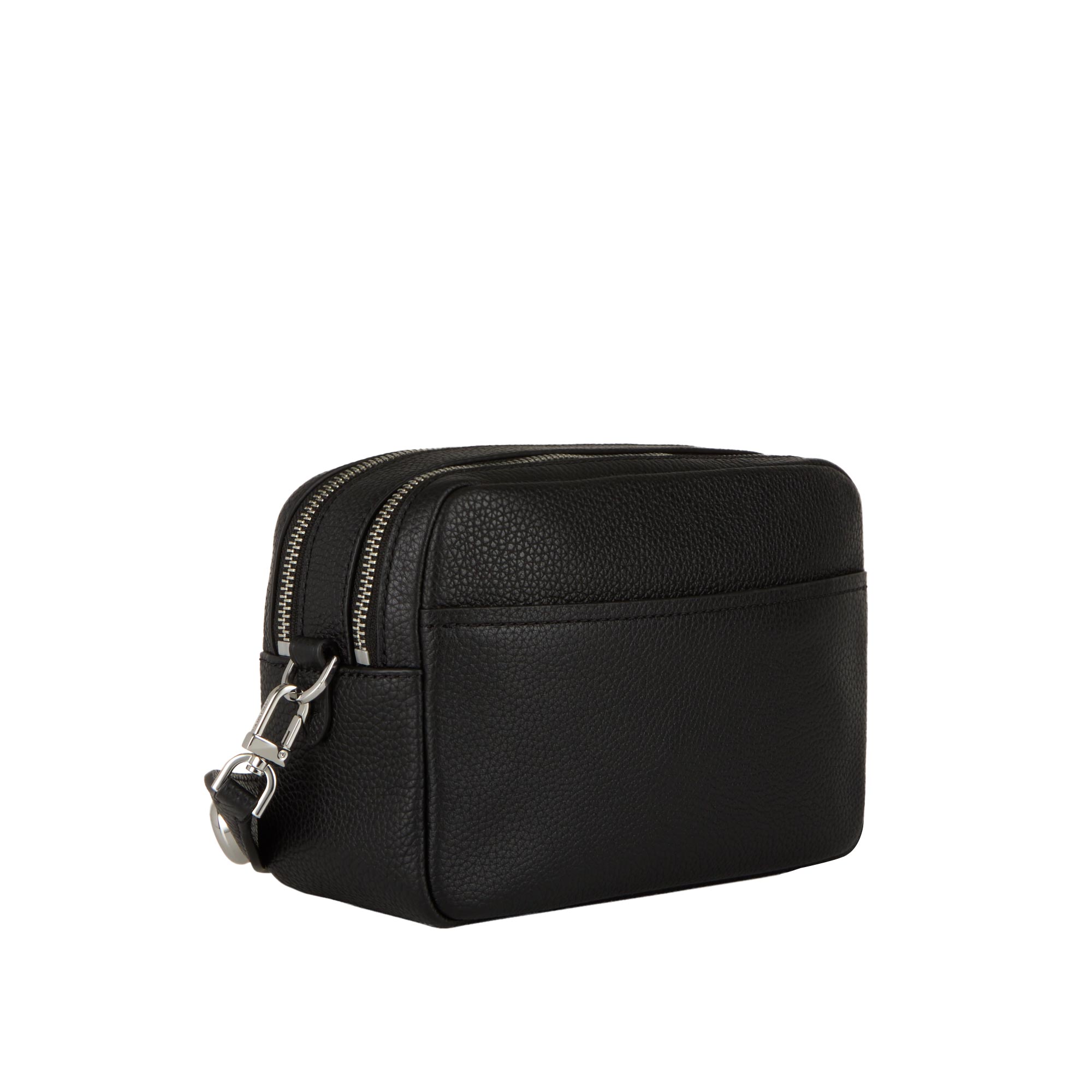 - Dual top zip fastening, detachable chain strap, adjustable studded crossbody strap, one rear slip pocket, logo lettering on the front, silver-tone hardware, textured finish