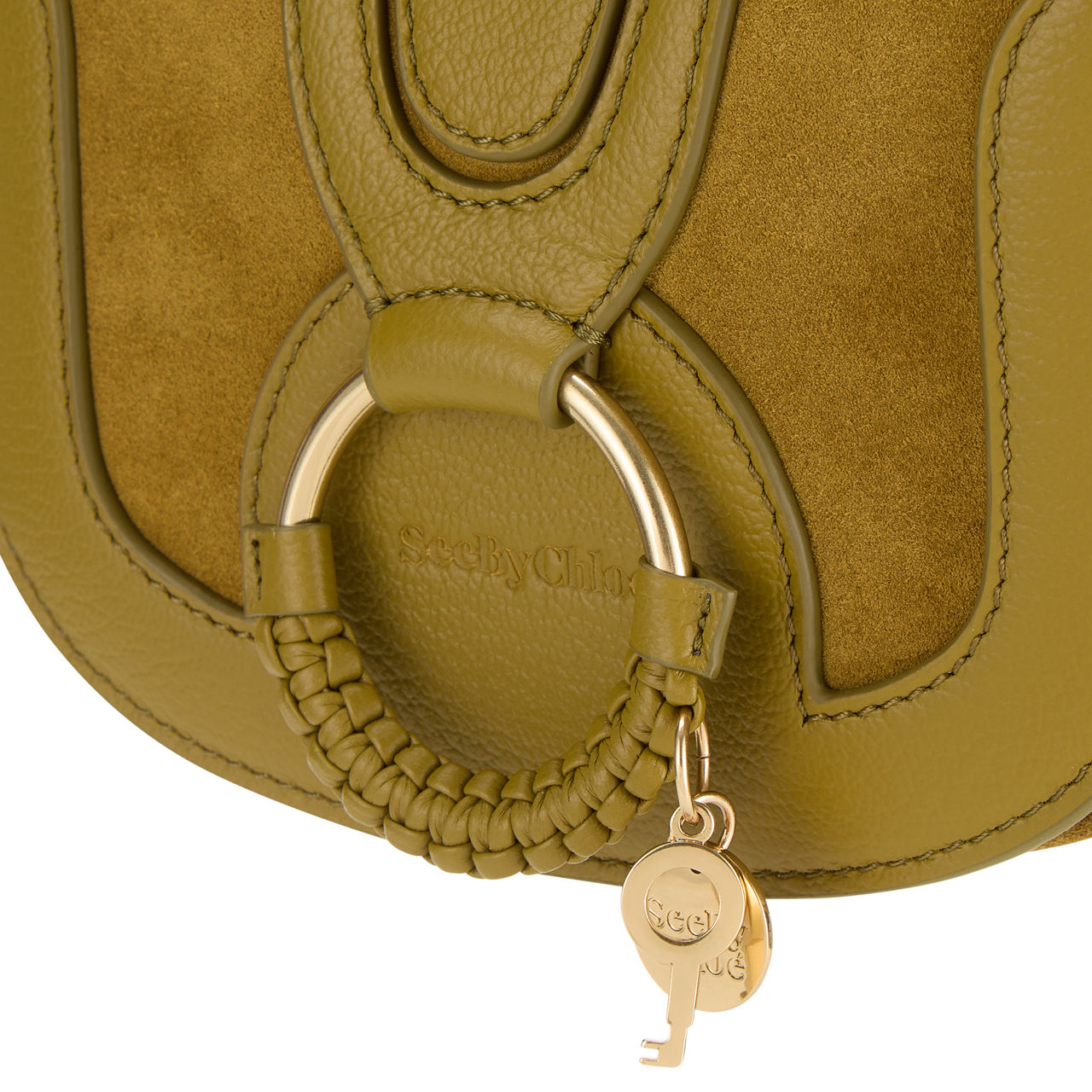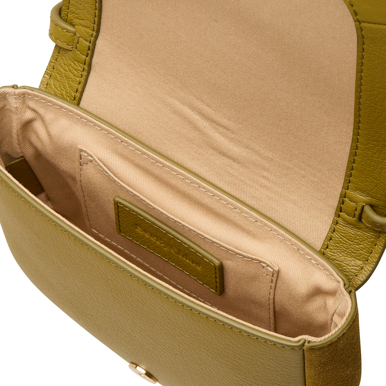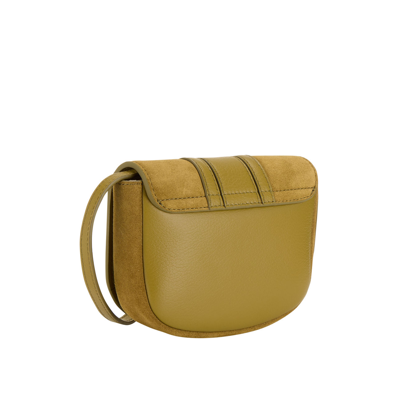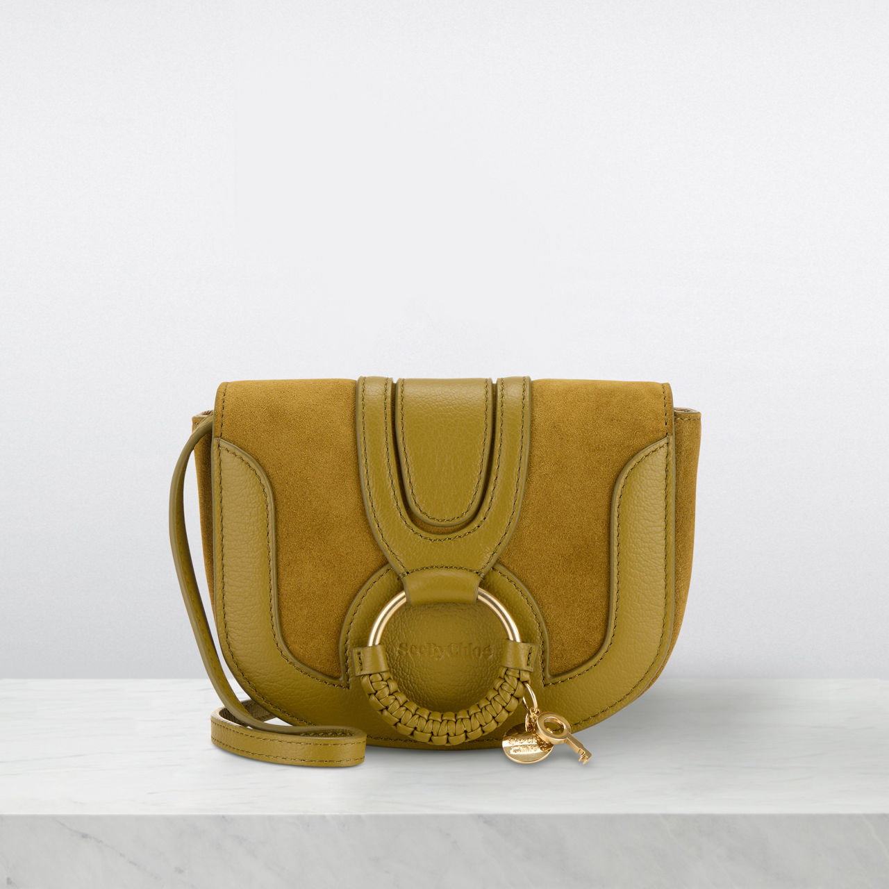 - Flap closure with magnetic snap fastening, one main compartment, one interior flat pocket, gold-tone hardware, adjustable strap, signature ring with braided detail, lined, grained leather and suede finish