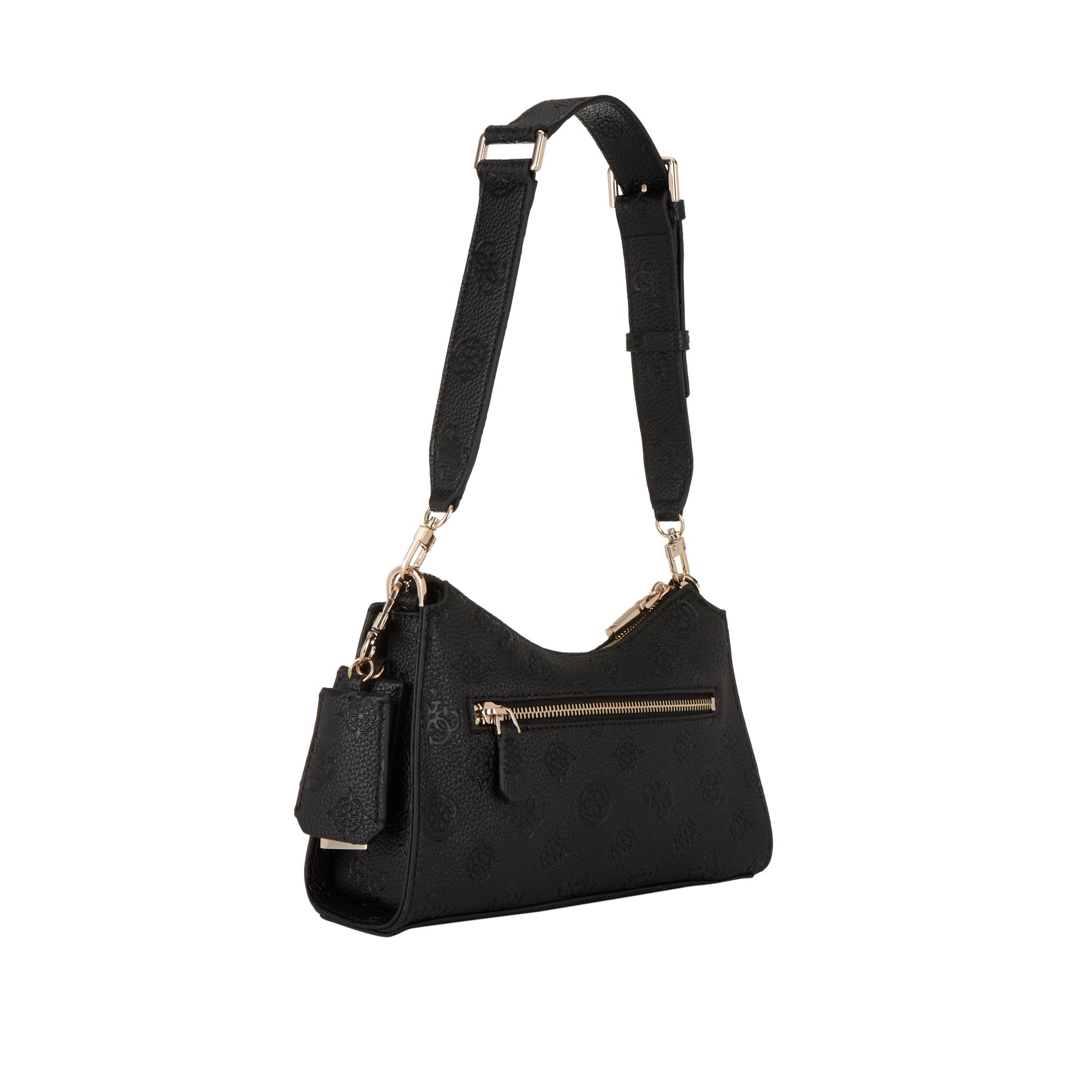 - Top zip fastening, adjustable shoulder strap, removable key tag, triangle logo detail, one rear pocket with zip fastening, gold-tone hardware, debossed Peony logo pattern, textured finish, structured silhouette