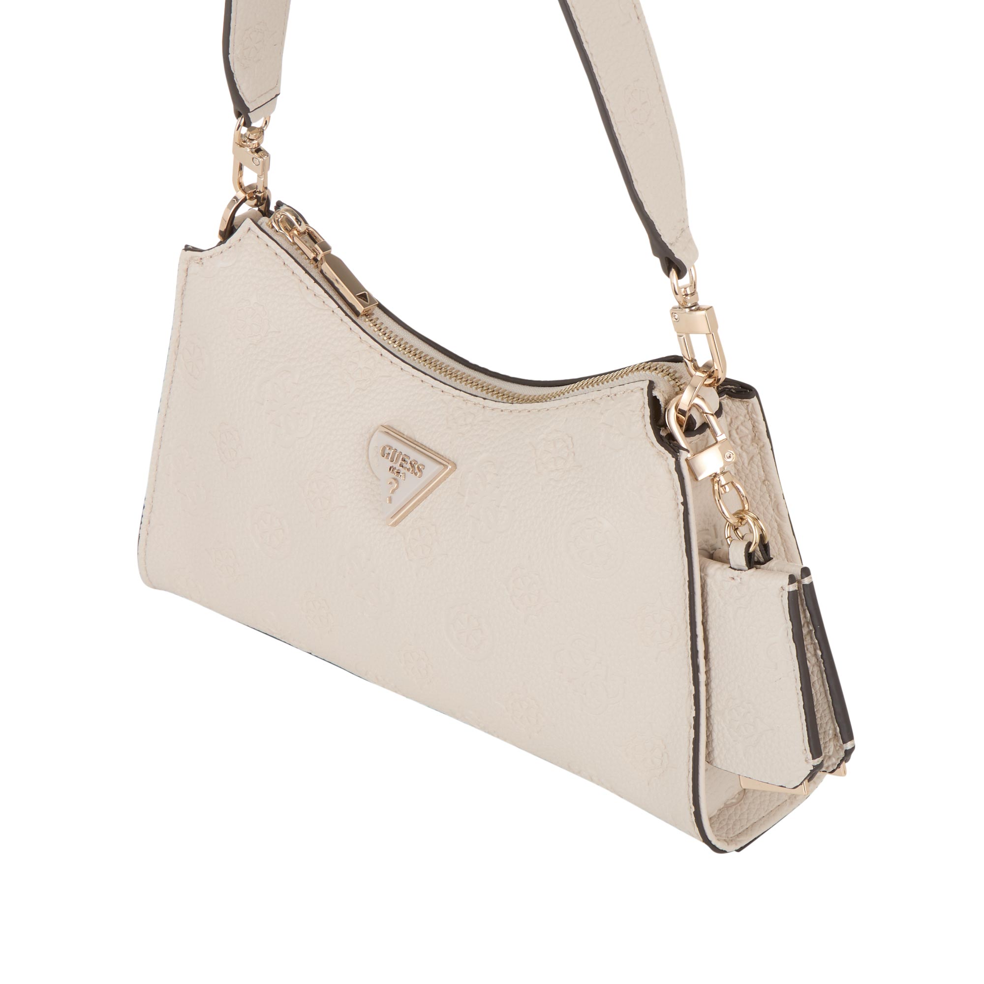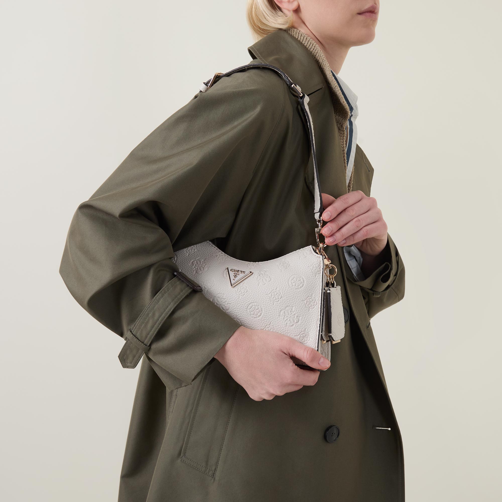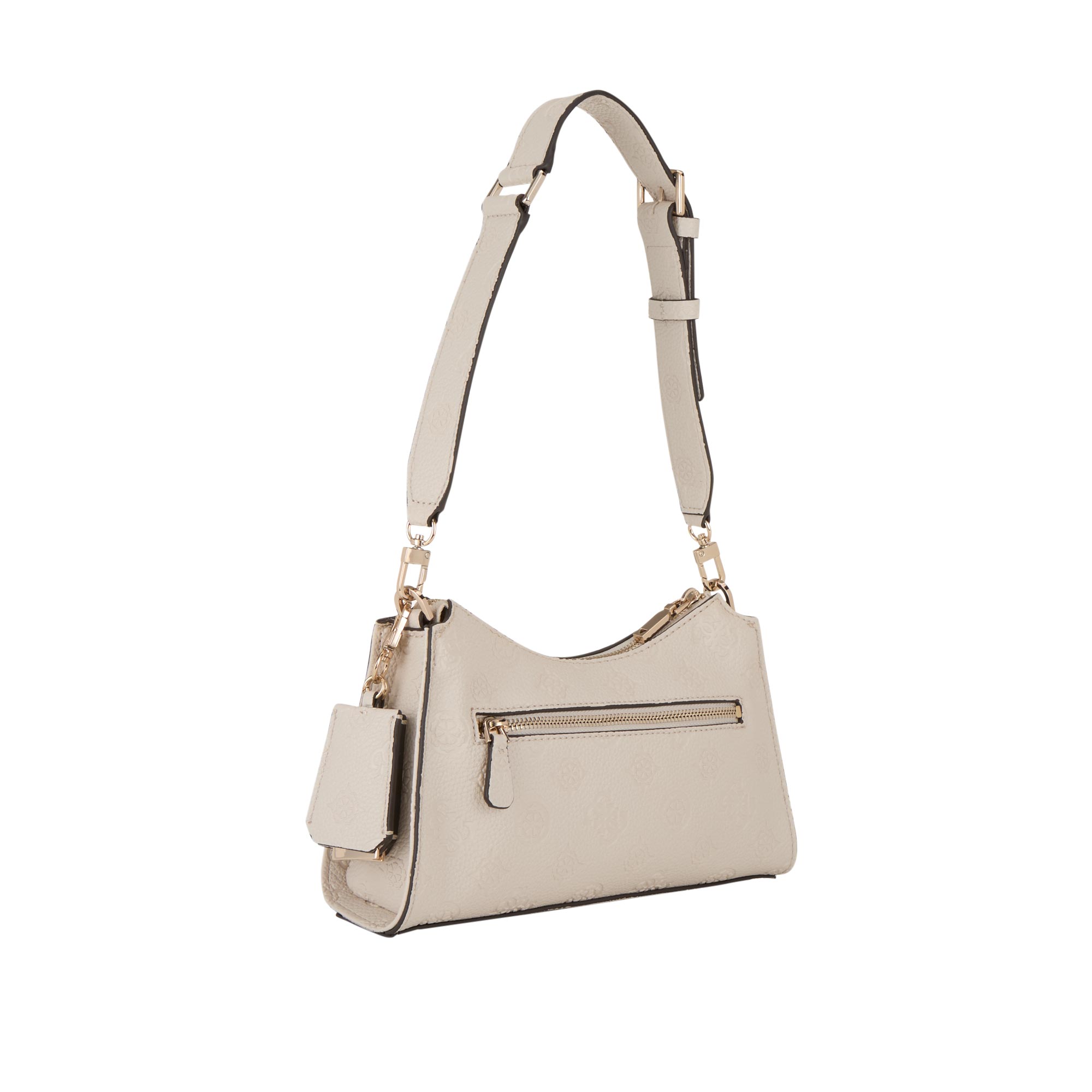 - Top zip fastening, adjustable shoulder strap, removable key tag, triangle logo detail, one rear pocket with zip fastening, gold-tone hardware, debossed Peony logo pattern, textured finish, structured silhouette