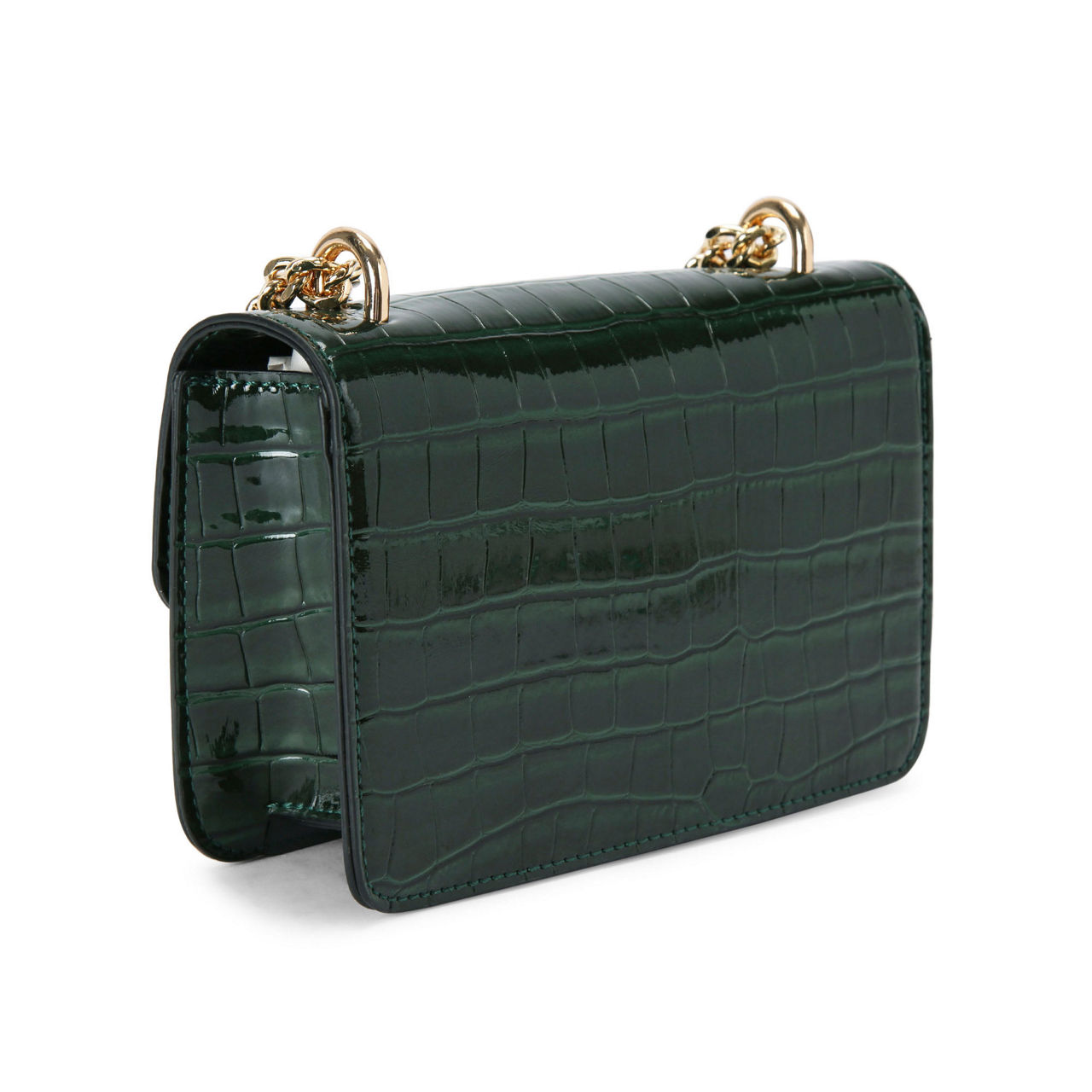 - Patent exterior, large croc print finish, gold-tone hardware, branded plate, front flap fastening, chain shoulder strap