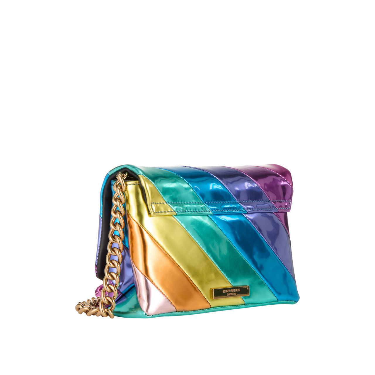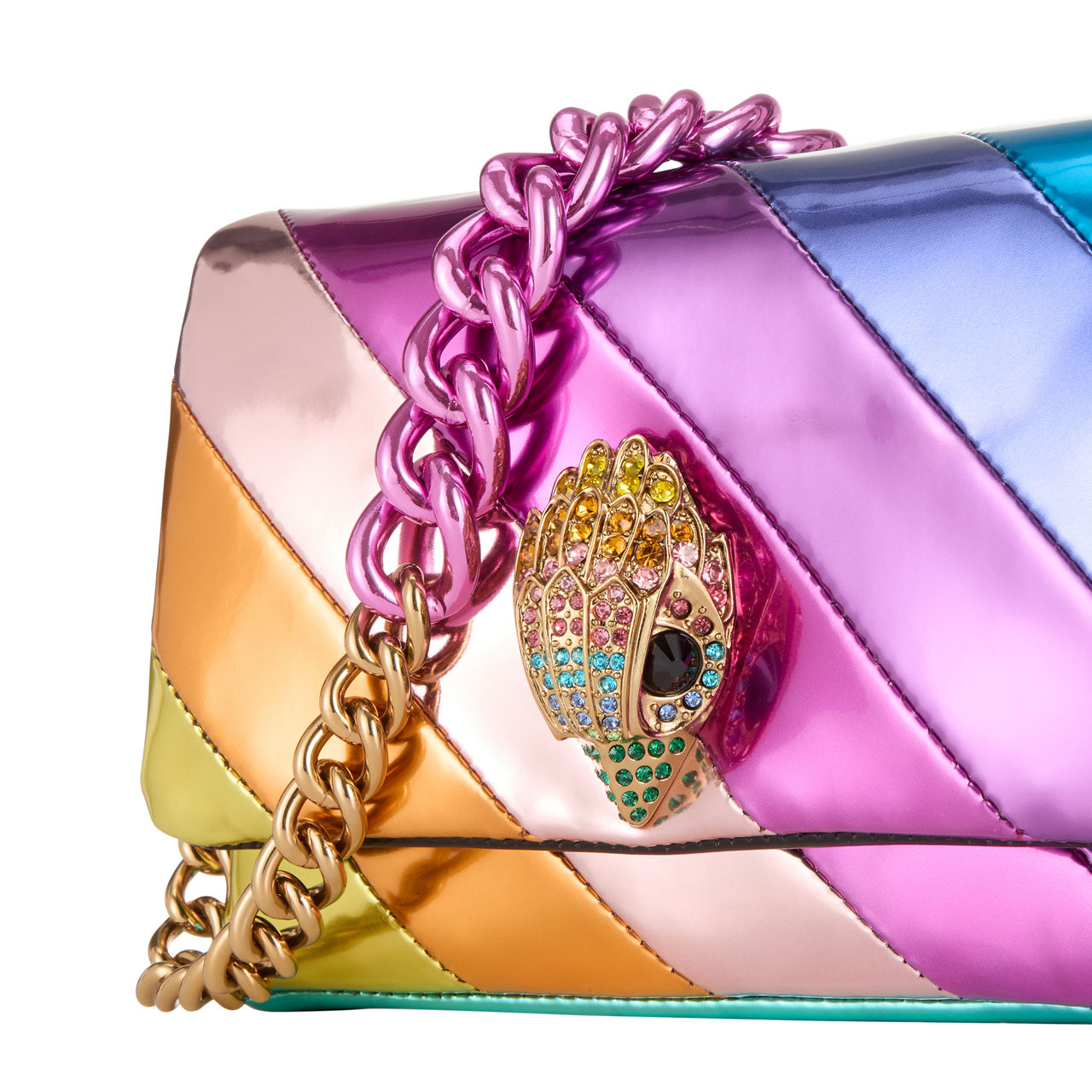 - Foldover flap closure with double snap-button fastening, multi-coloured chain strap, back logo plaque, crystal-embellished eagle head hardware, multi-coloured quilted finish
