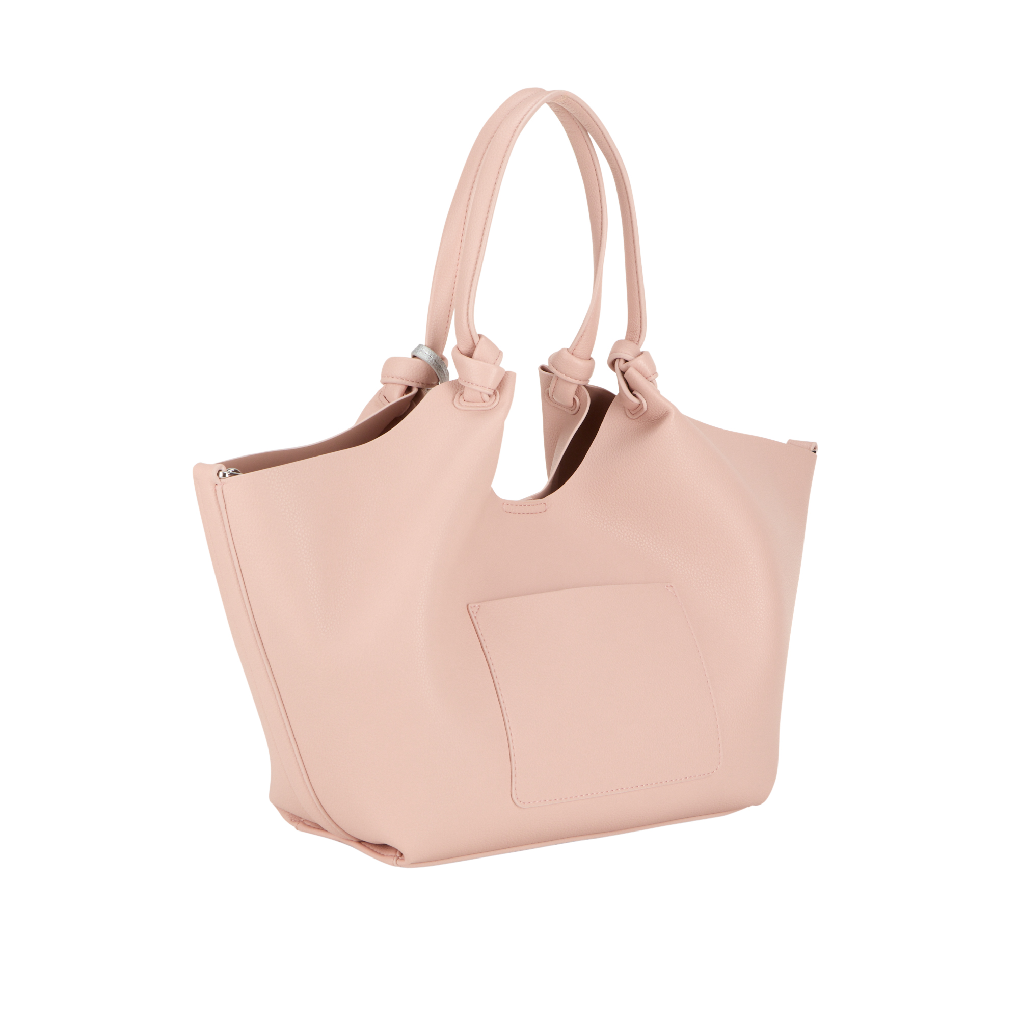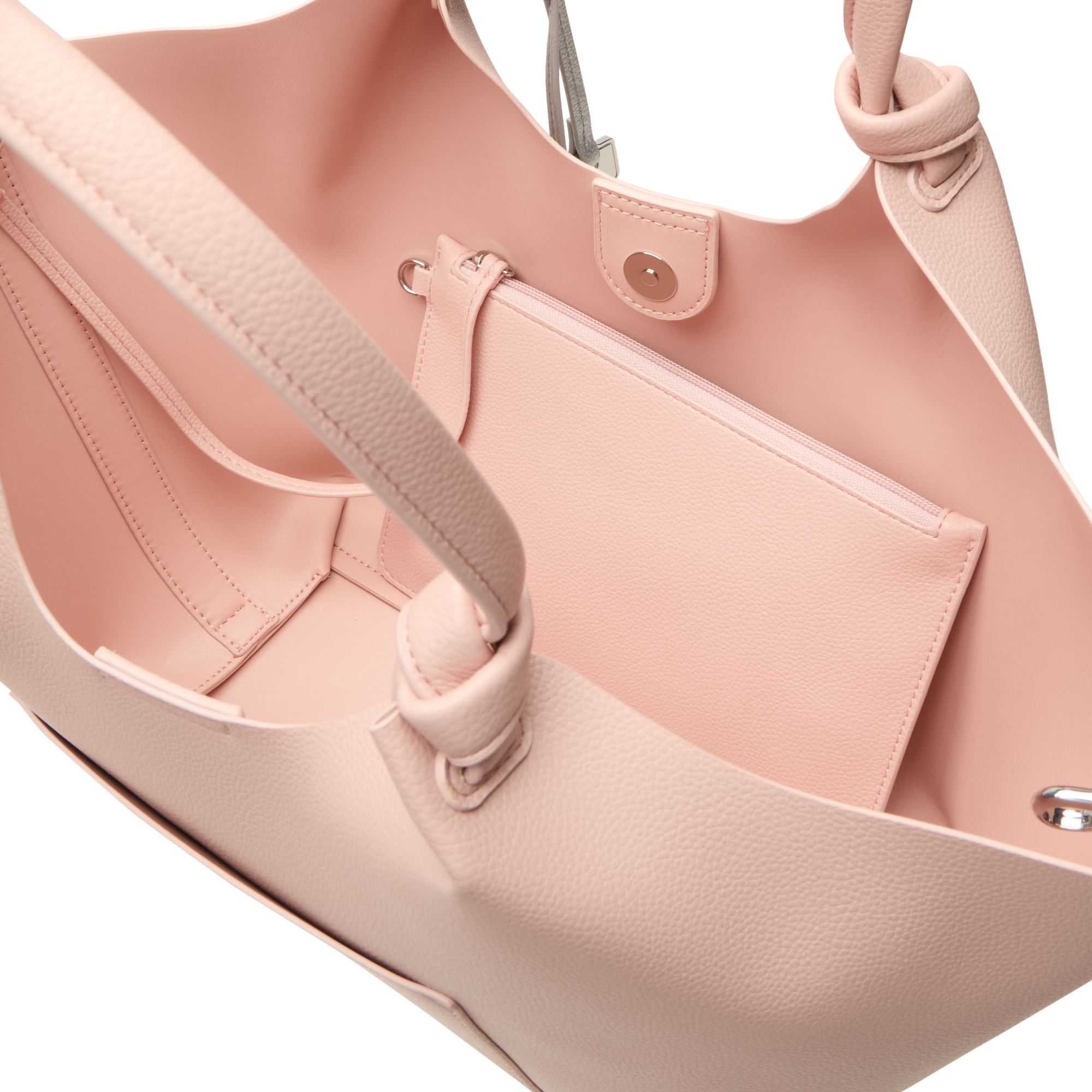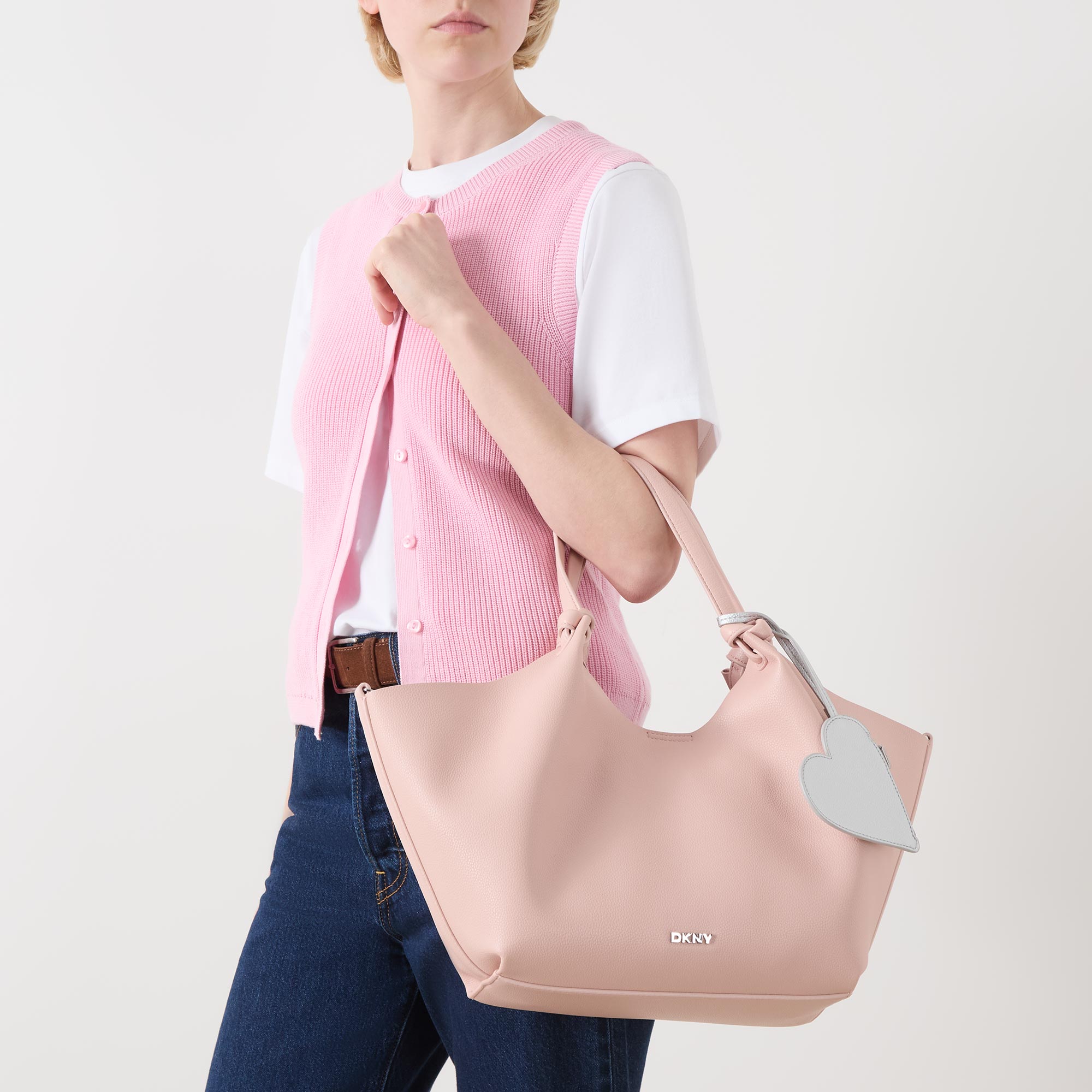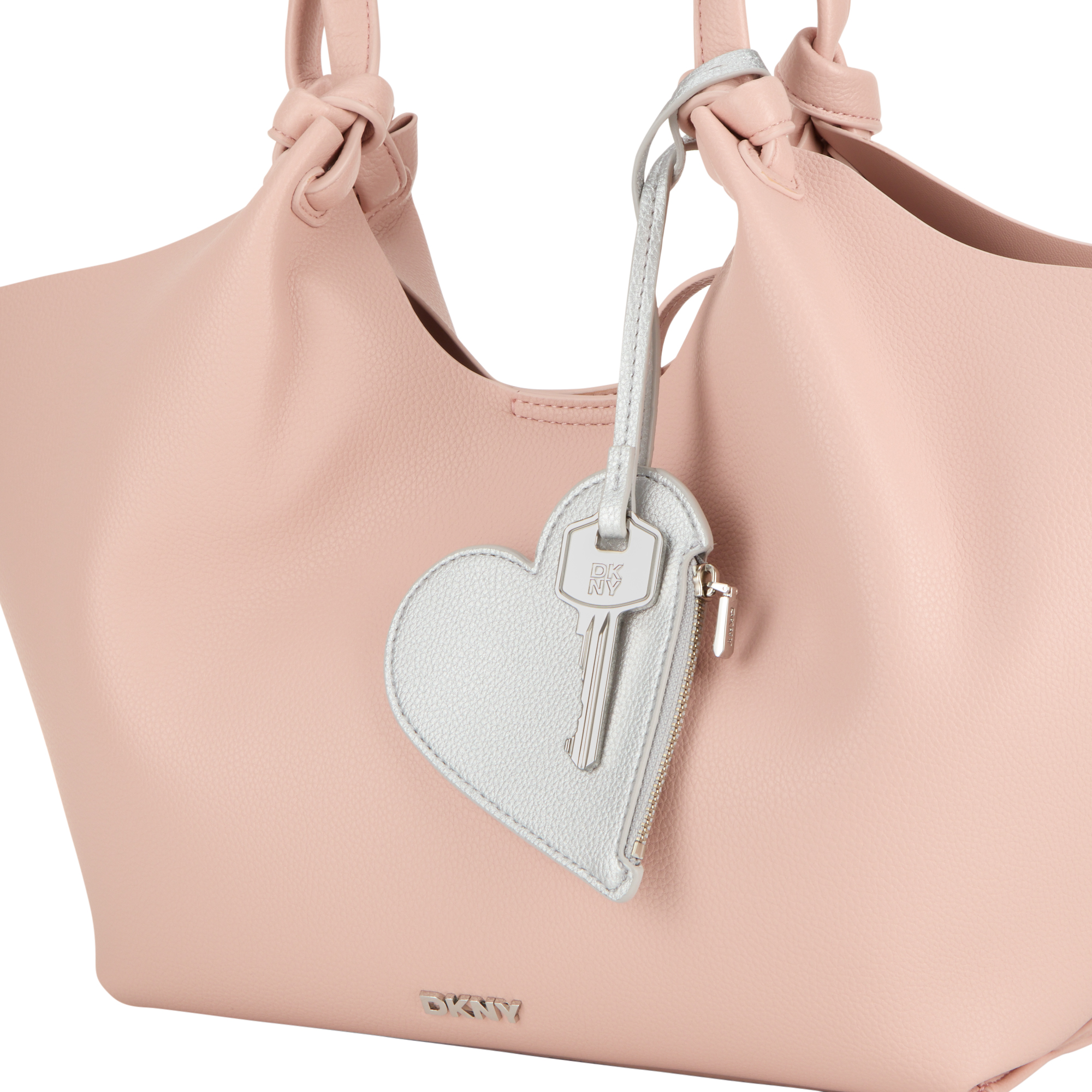 - Two shoulder straps with knot design, magnetic snap fastening, detachable heart-shaped key chain, one rear slip pocket, logo lettering, silver-tone hardware, textured finish