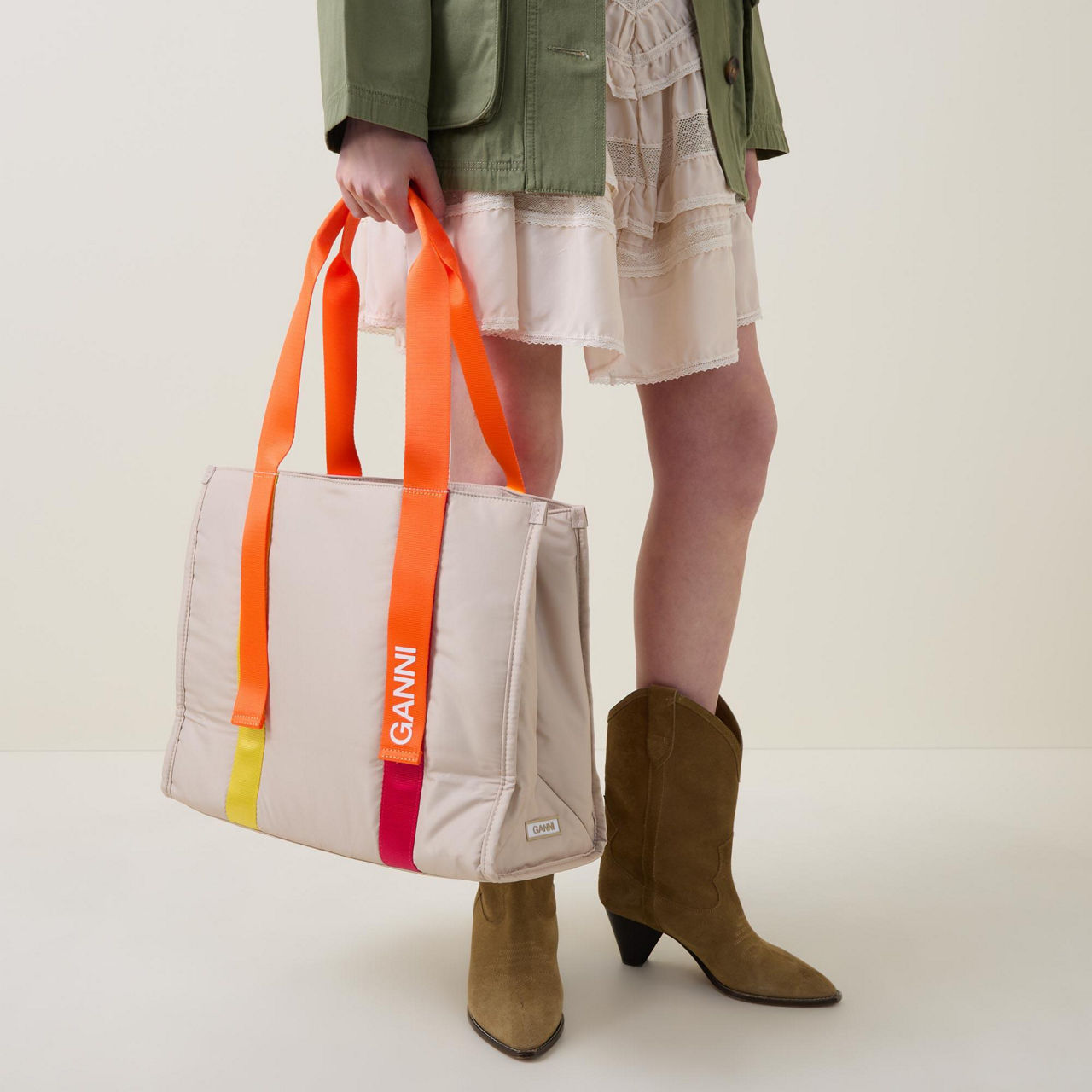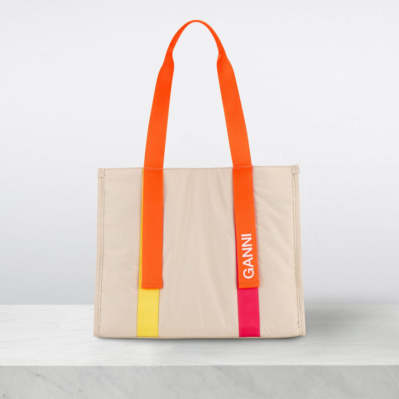 • Top carry handles, drawstring adjustable top, boxy silhouette, logo details