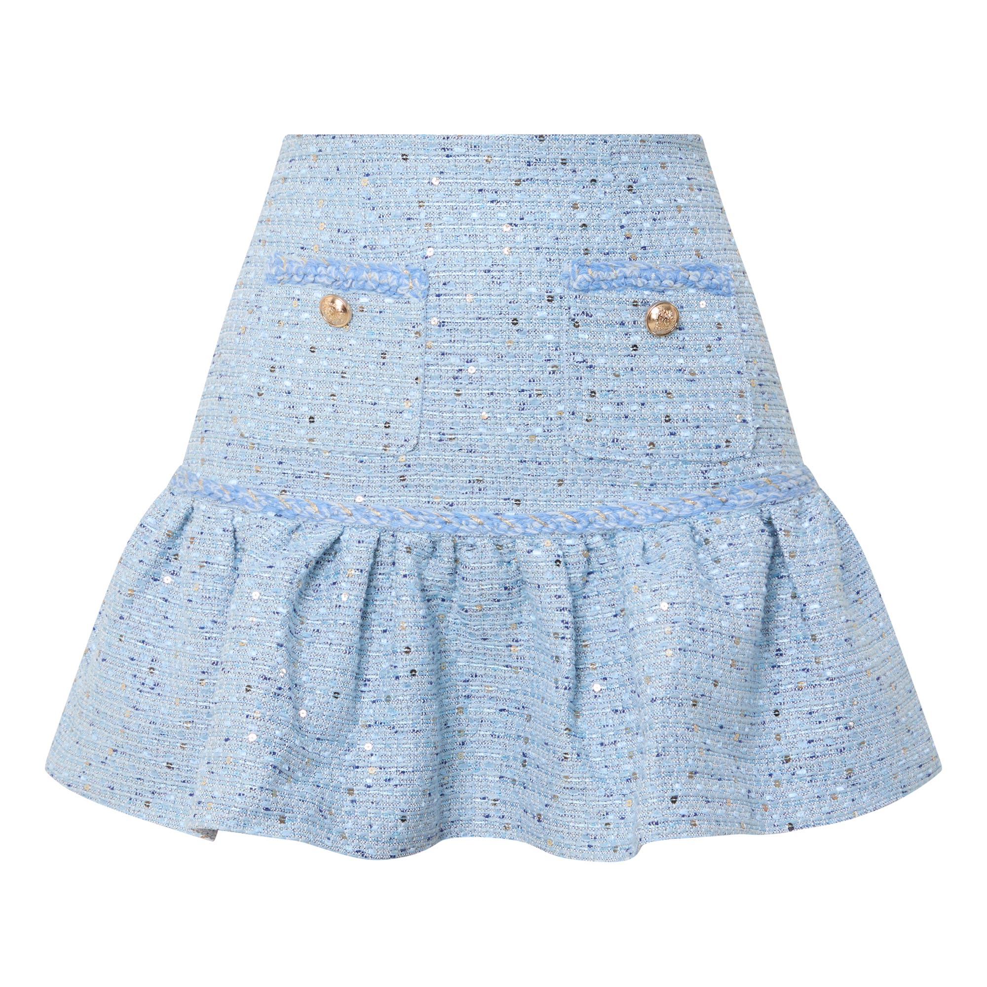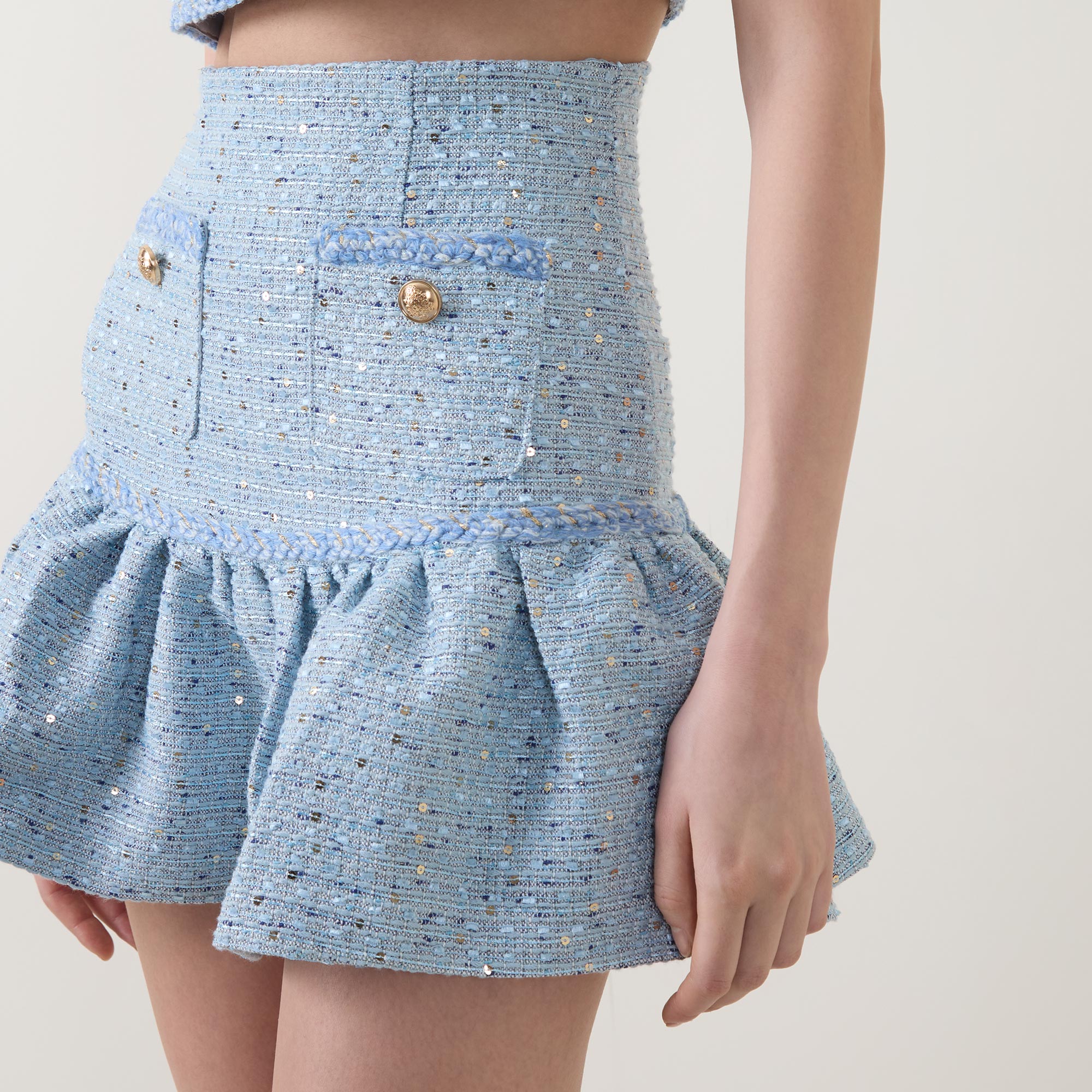 - High rise, rear zip fastening, dropped waistline, braided trim detailing, two front patch pockets, gold-tone statement buttons, flared hem, mini length, tweed design, bouclé finish