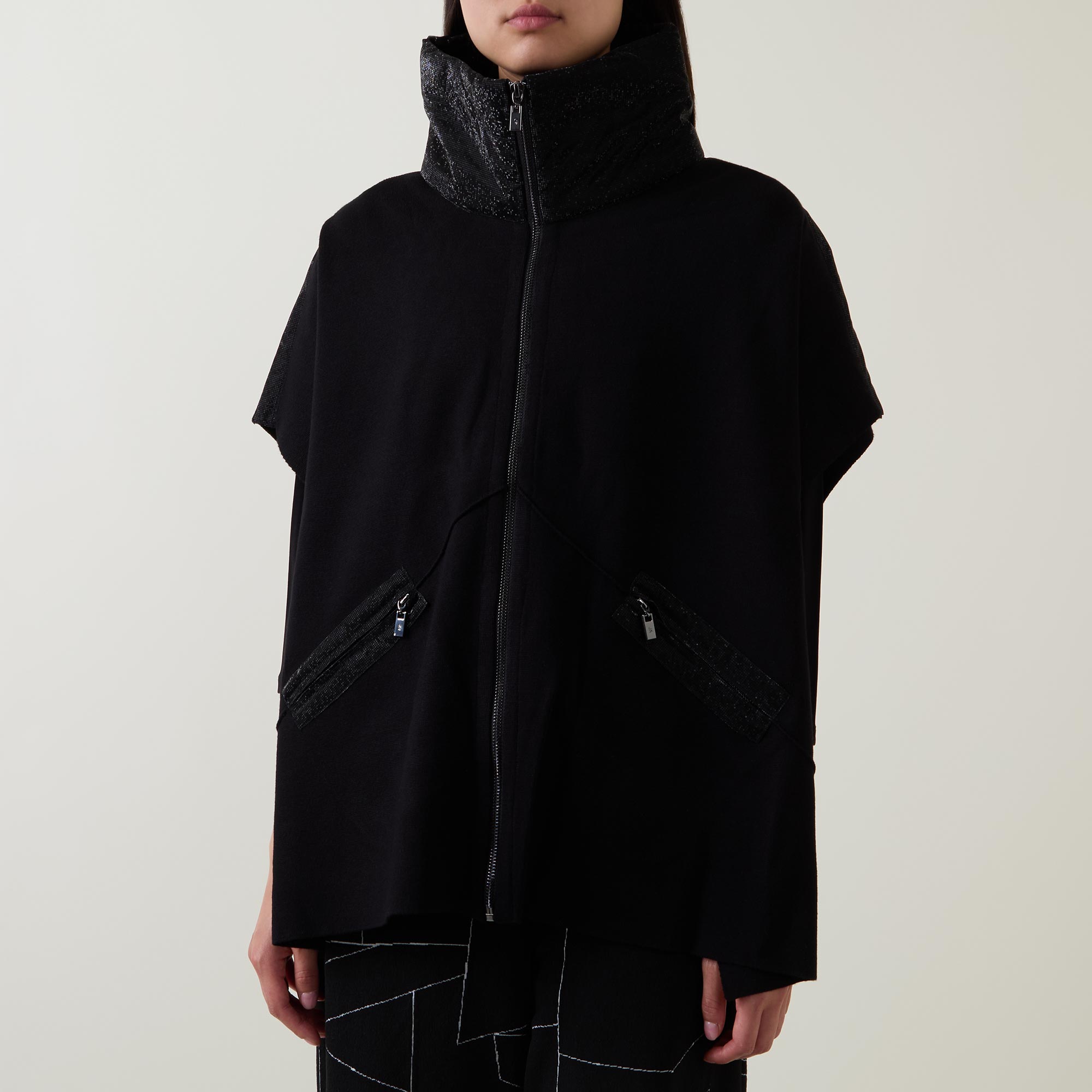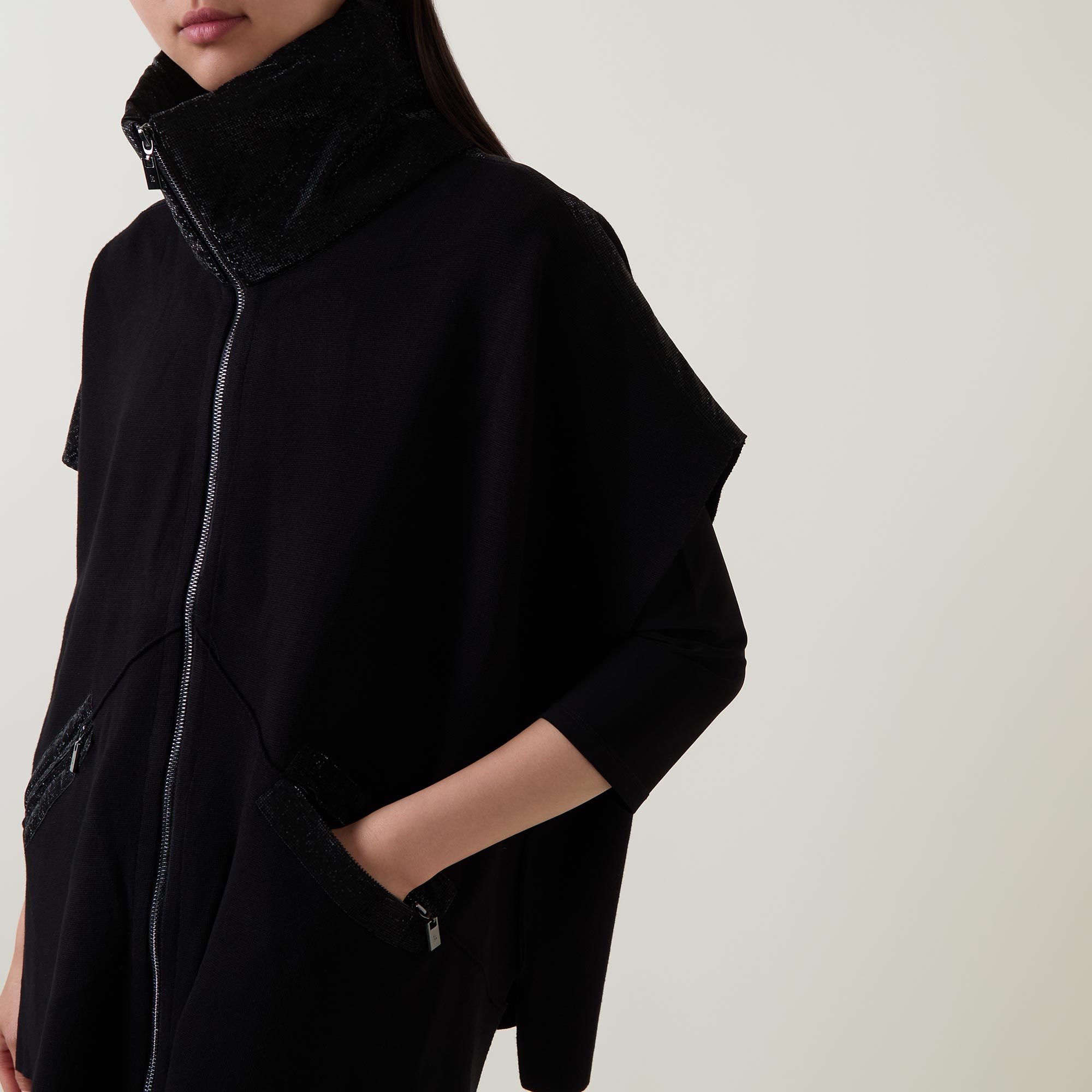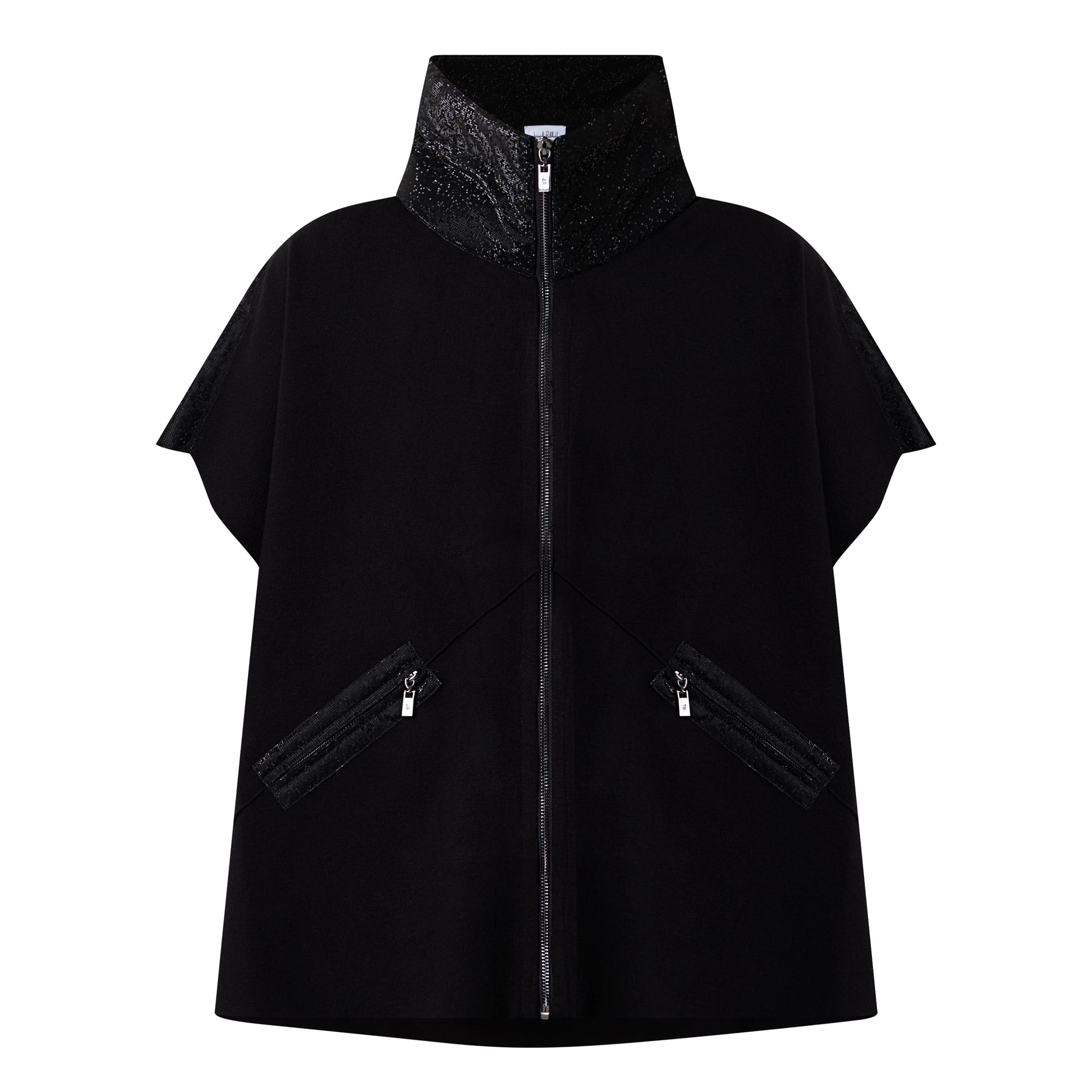 - Funnel neckline, full zip-through fastening, short sleeves, dropped shoulders, diagonal zip pockets, soft finish