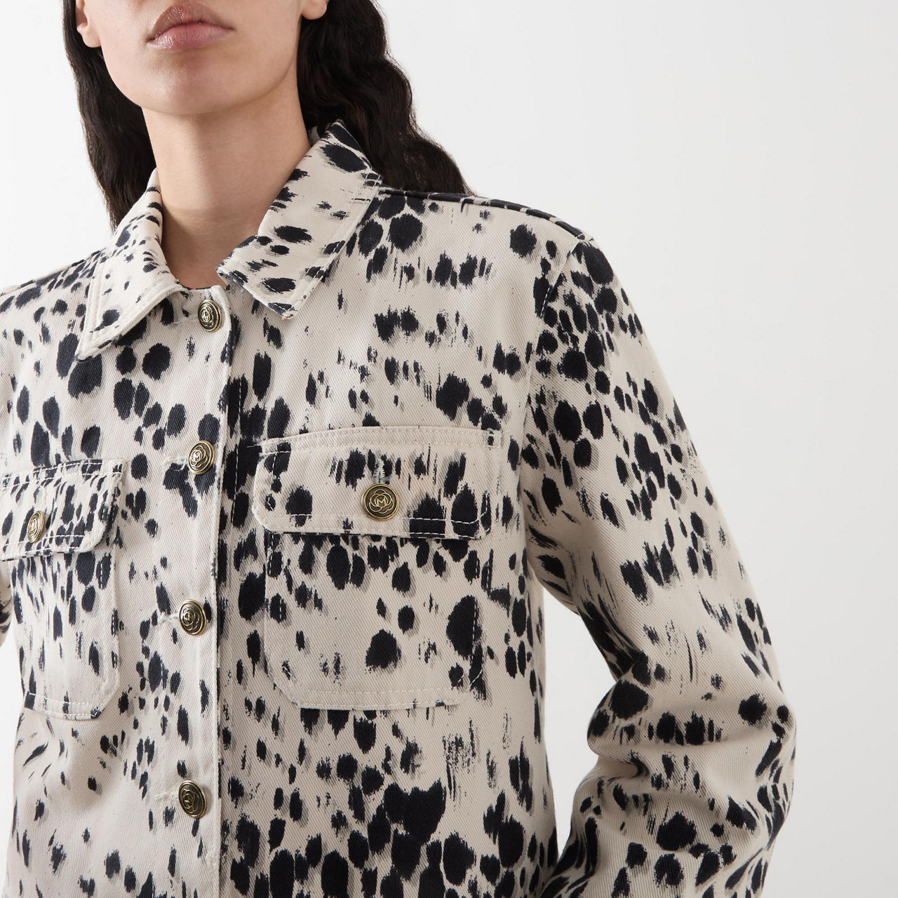 - Shirt collar, dropped shoulders, long sleeves, buttoned cuffs, front button fastening, two chest flap pockets with button fastenings, straight hem, cropped length, abstract print, garment-dyed finish