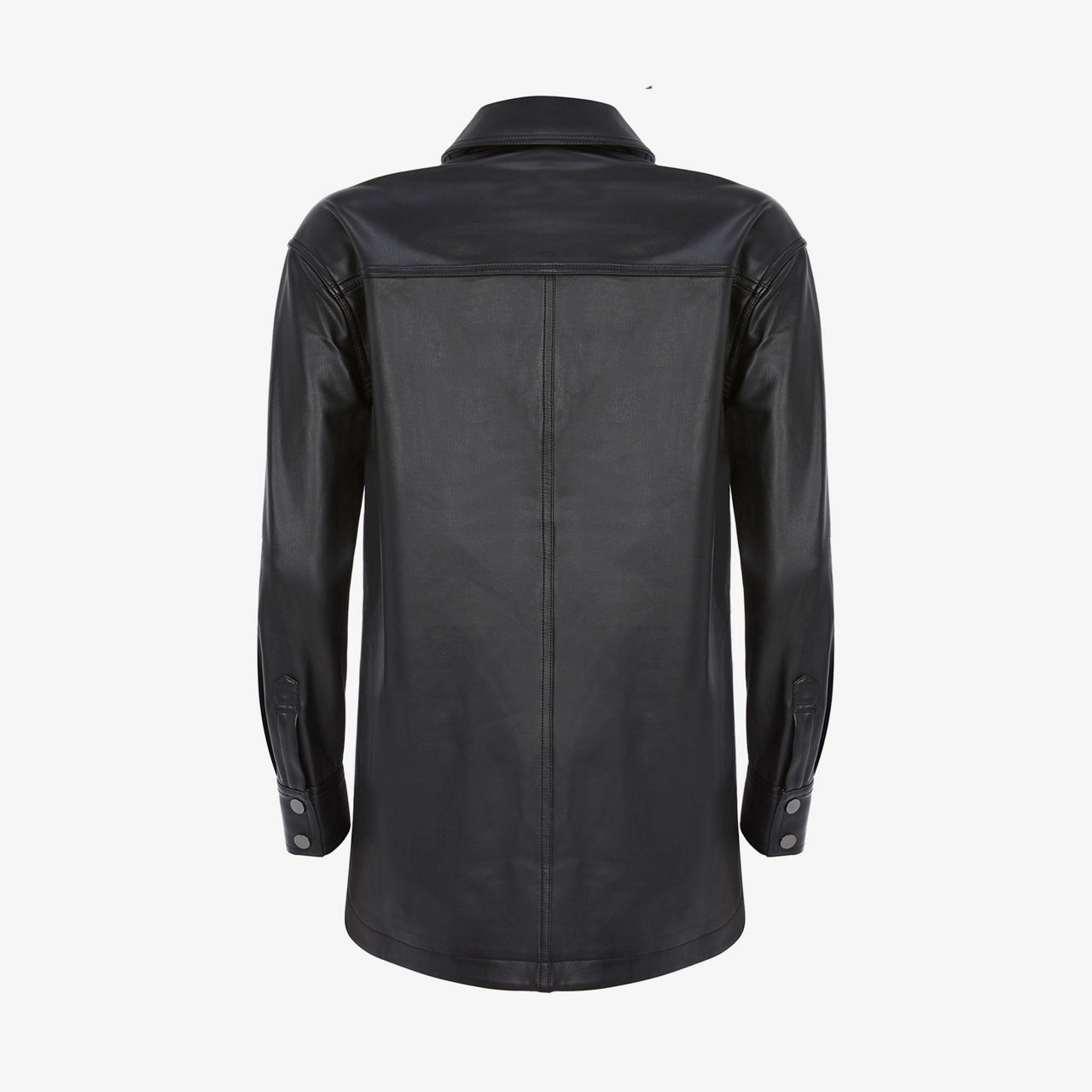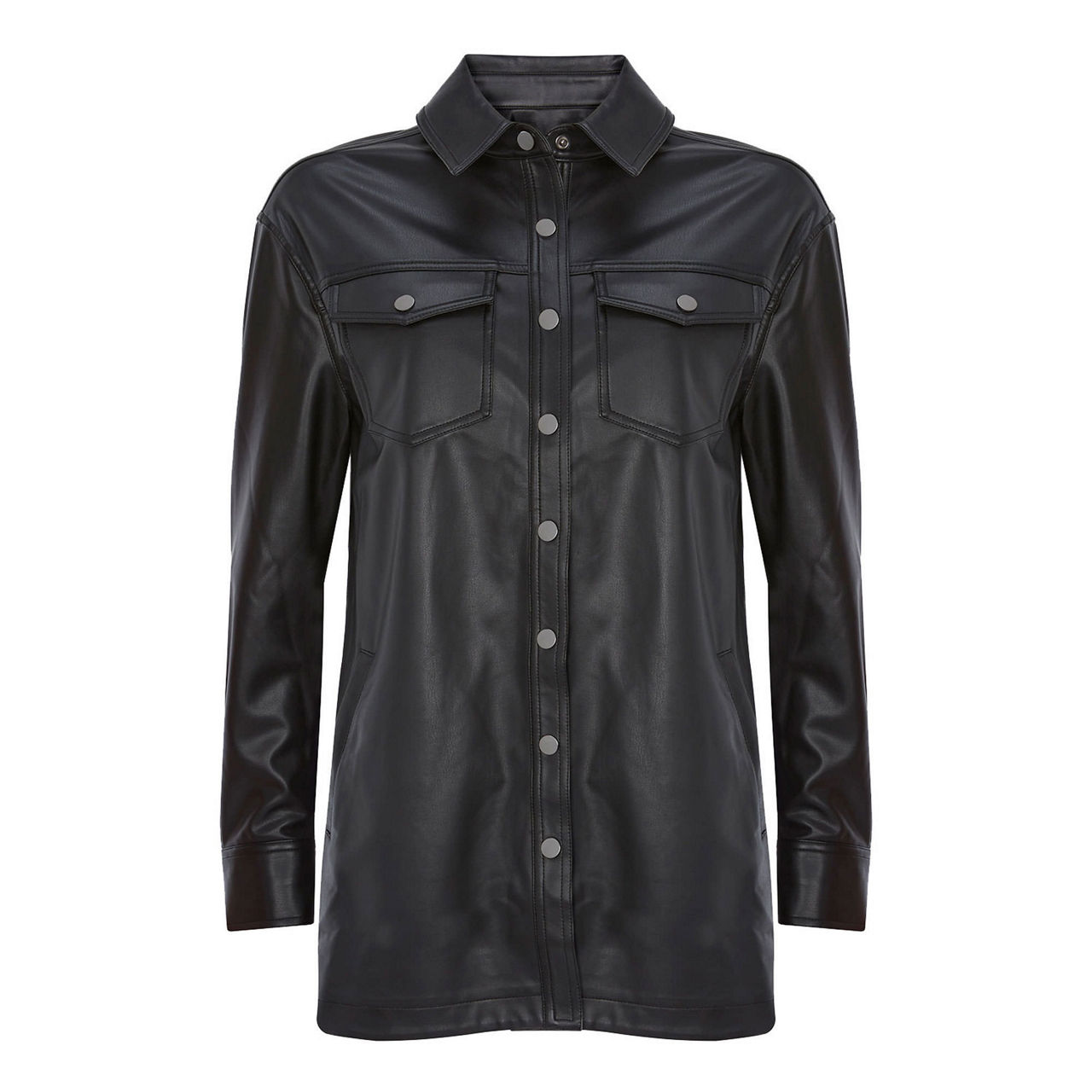 Shirt + Jacket = Shacket. Cut from butter-soft faux leather, this black overshirt is designed in a relaxed silhouette that falls just below the hip. It's finished with dark gunmetal poppers across the front.
