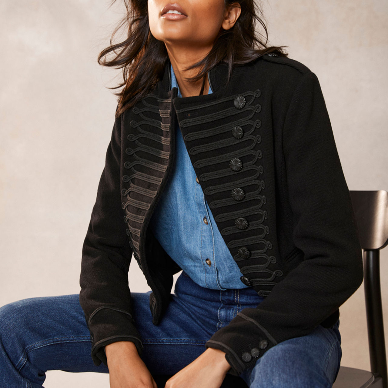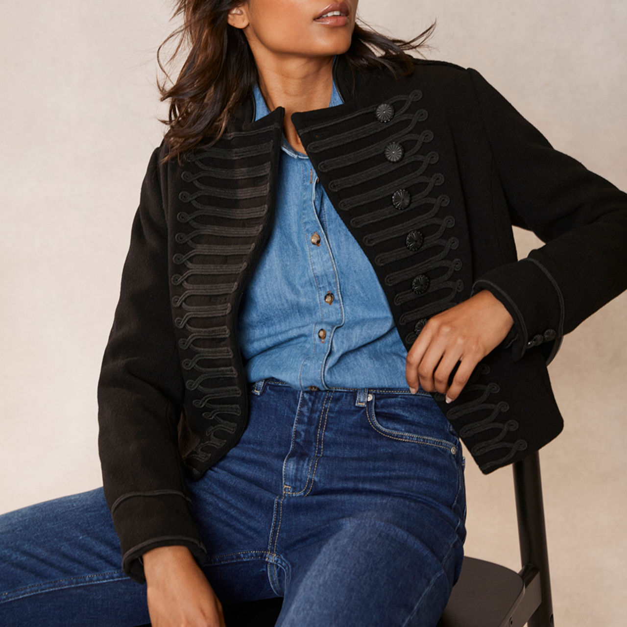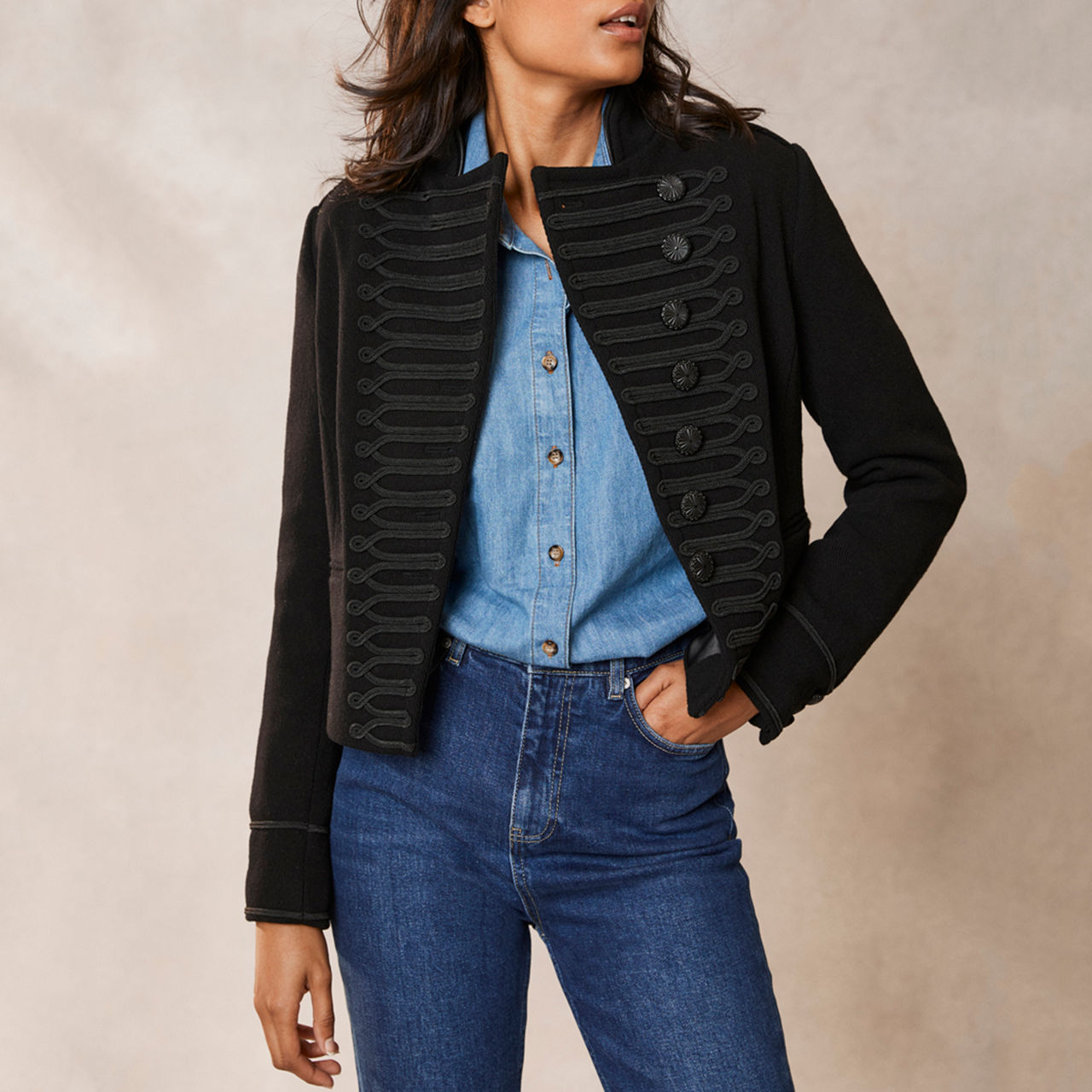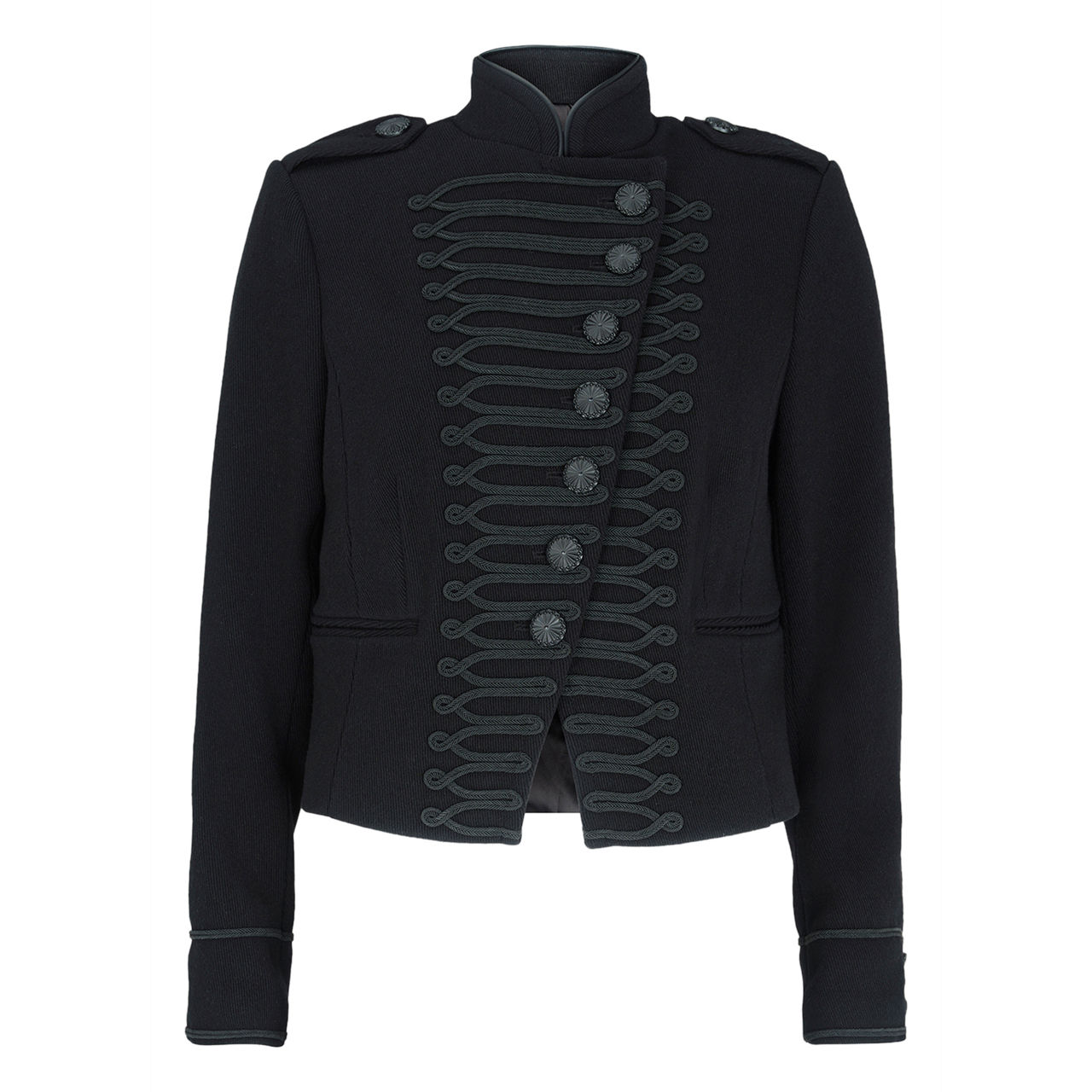 Designed in a cropped, double breasted silhouette, this black jacket is a chic nod to the military trend this season. Finished with buttoned epaulettes and elaborate cord embroidery across the front for a sophisticated feel, throw it on with a pair of boyfriend jeans for the perfect blend of high/low dressing.