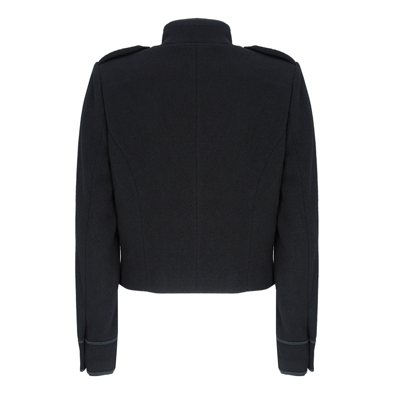 - Long sleeve, high neck, button fastening, shoulder epaulettes, cord embroidery.