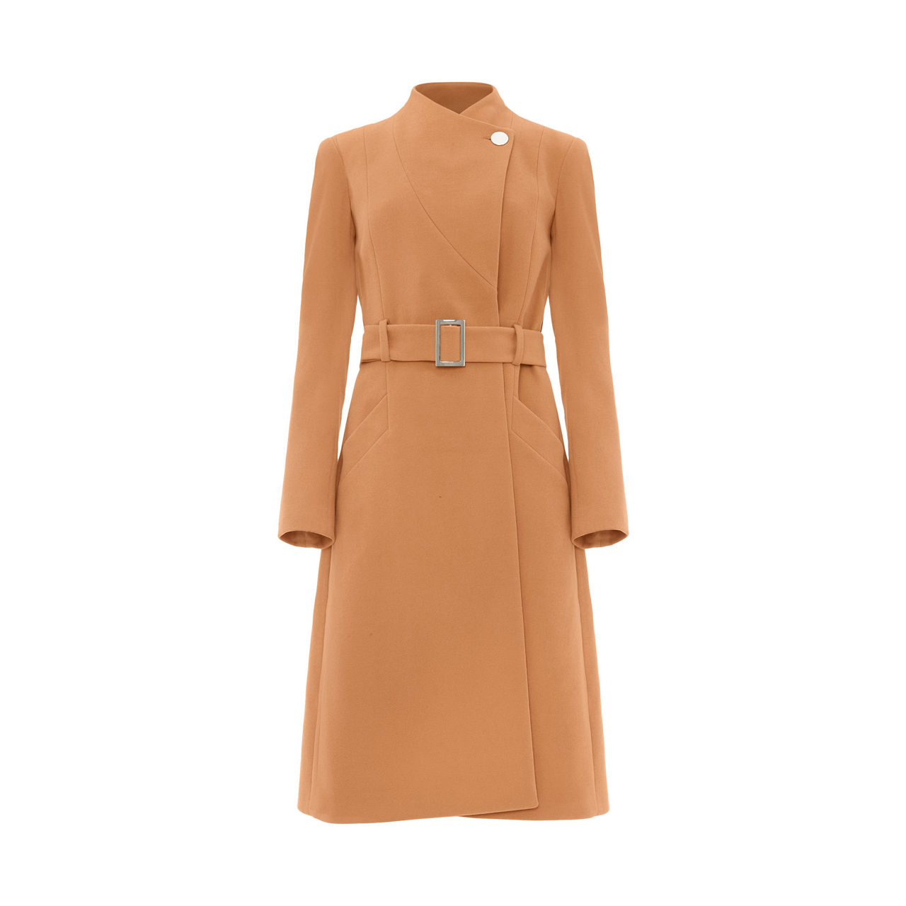 Invest in this classic stand up collar coat designed with a wrap front shaping seams and a back vent. Finished with a satin lining this style fastens with metallic buttons and a belt buckle to enhance the silhouette.
