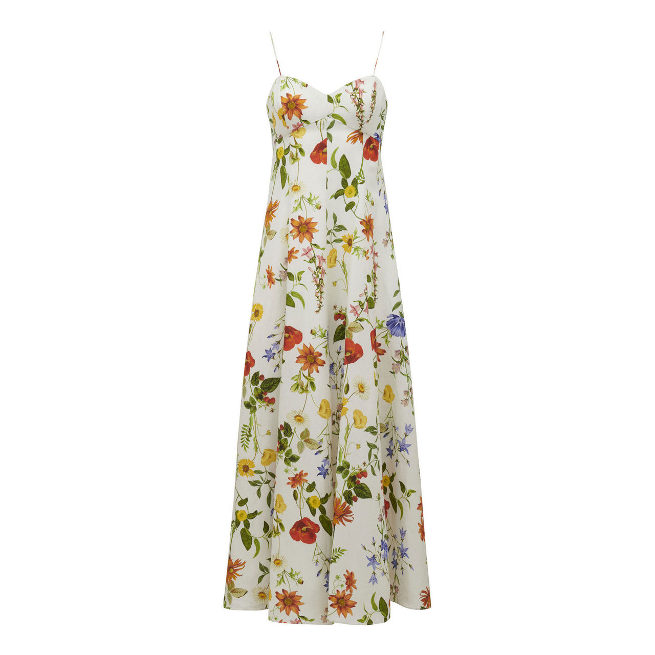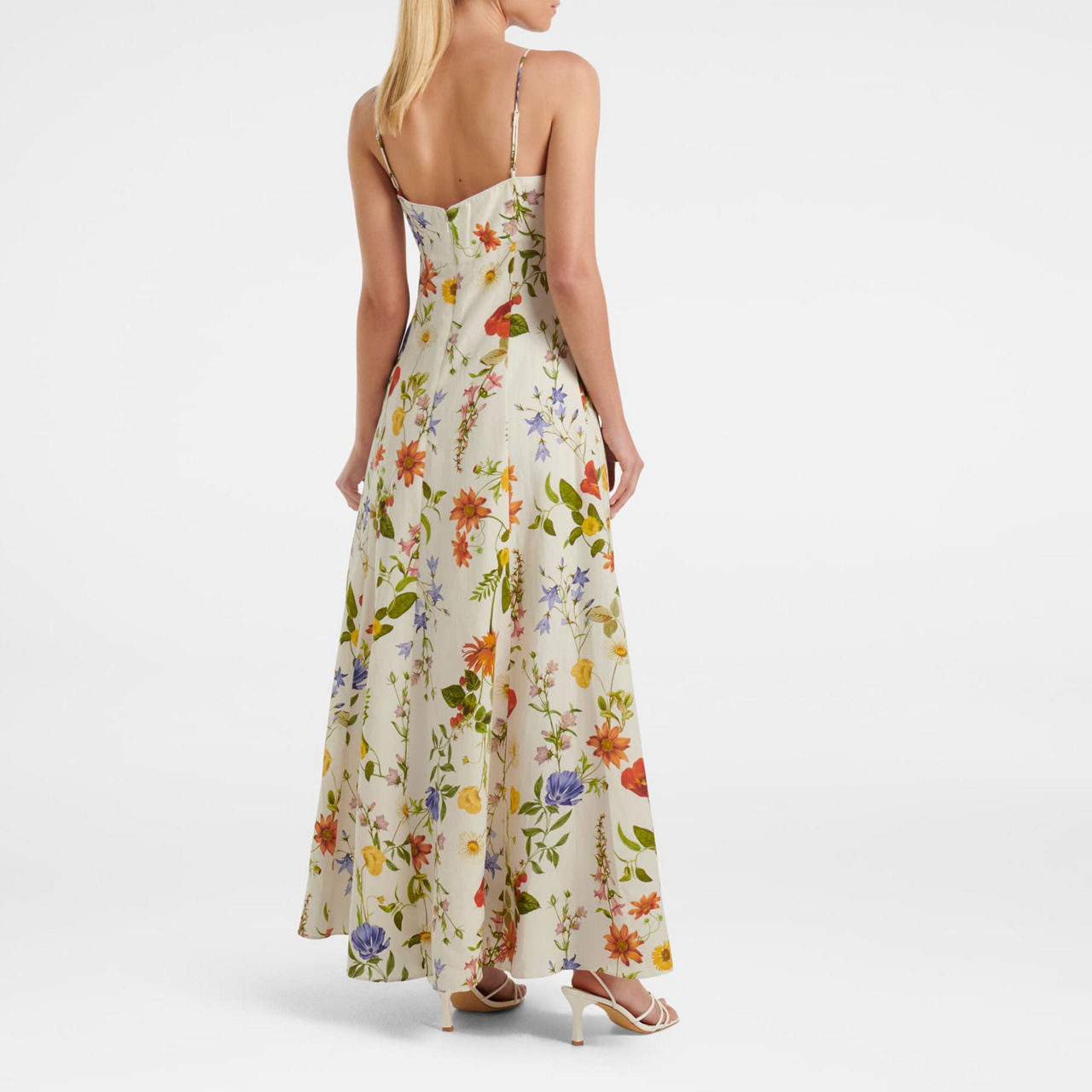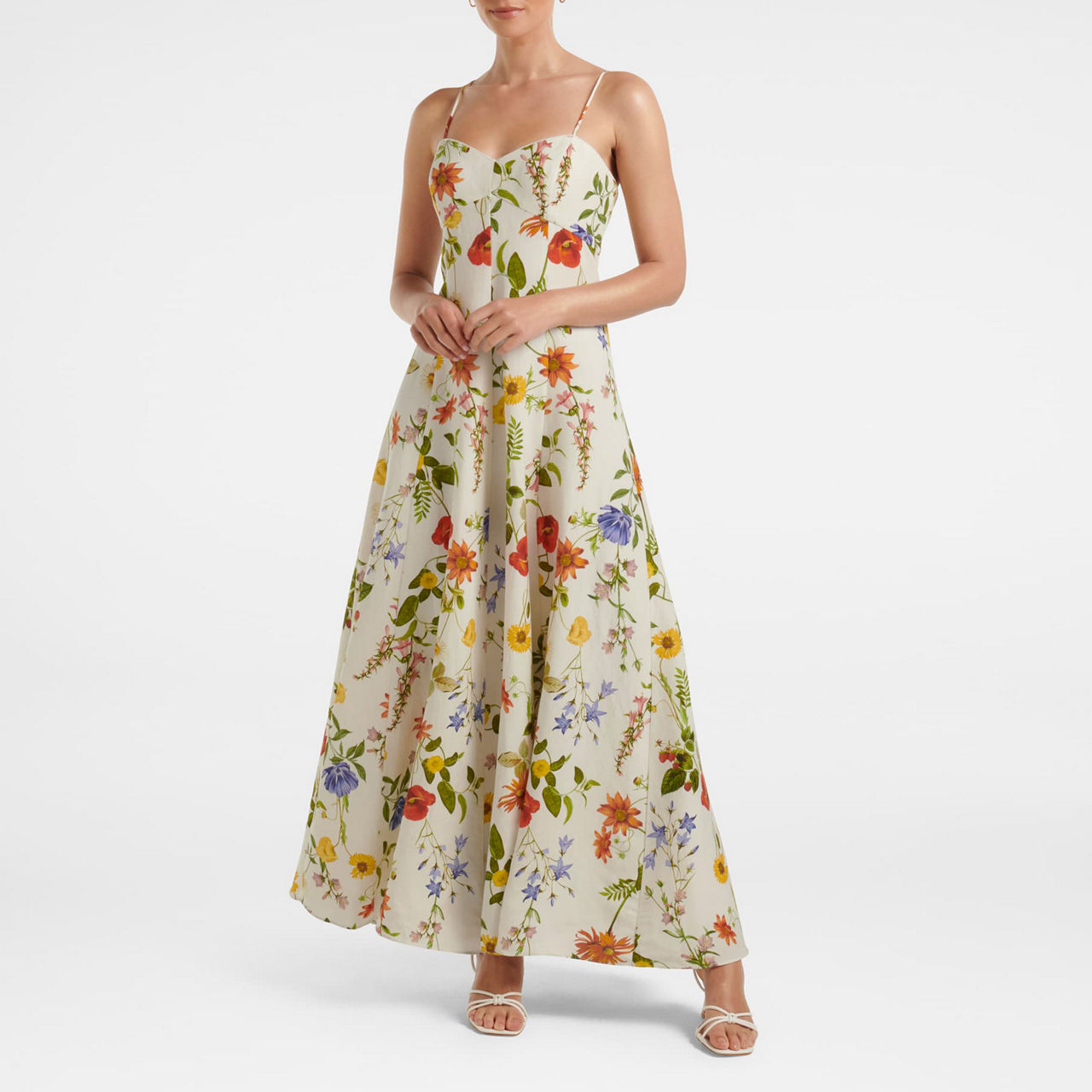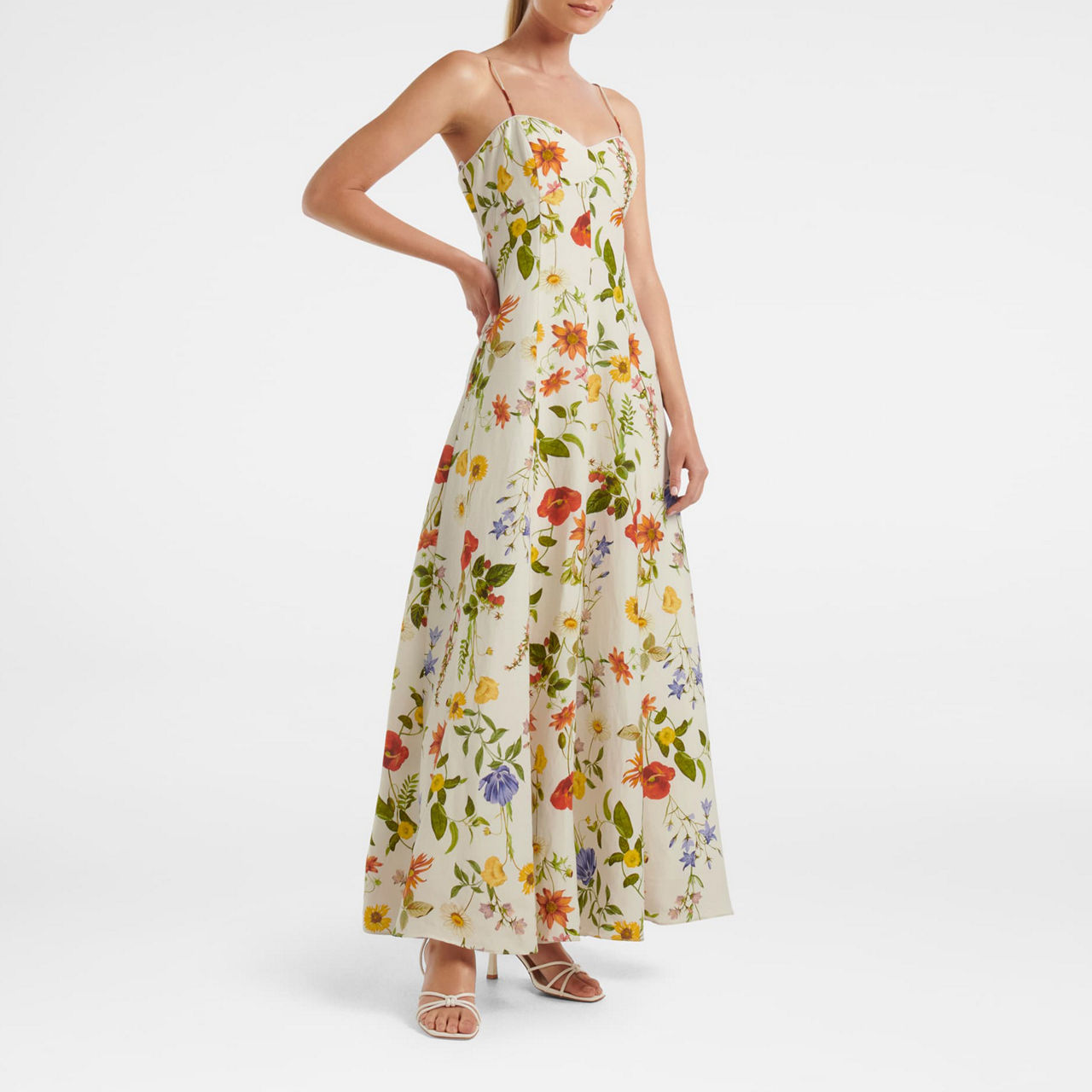 - Linen fabrication, adjustable spaghetti straps, under bust seam, princess seams, back zip fastening, lined, floral print, sleeveless, sweetheart neckline