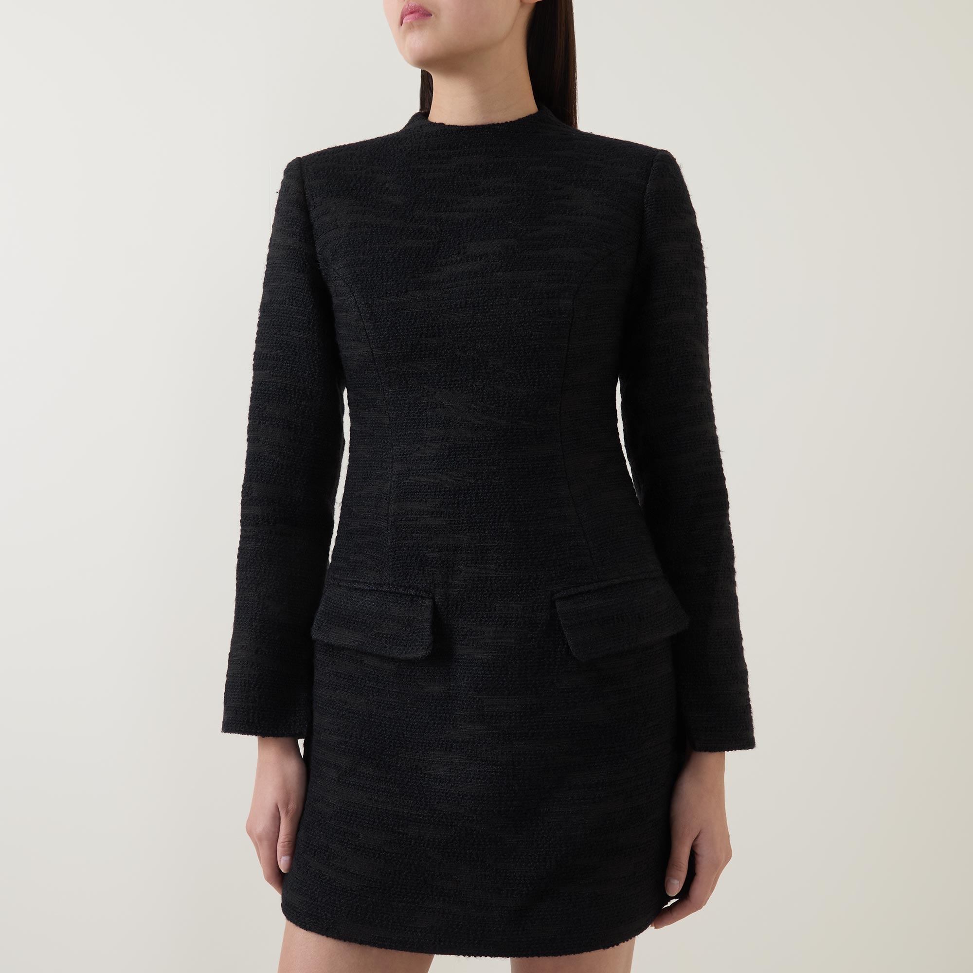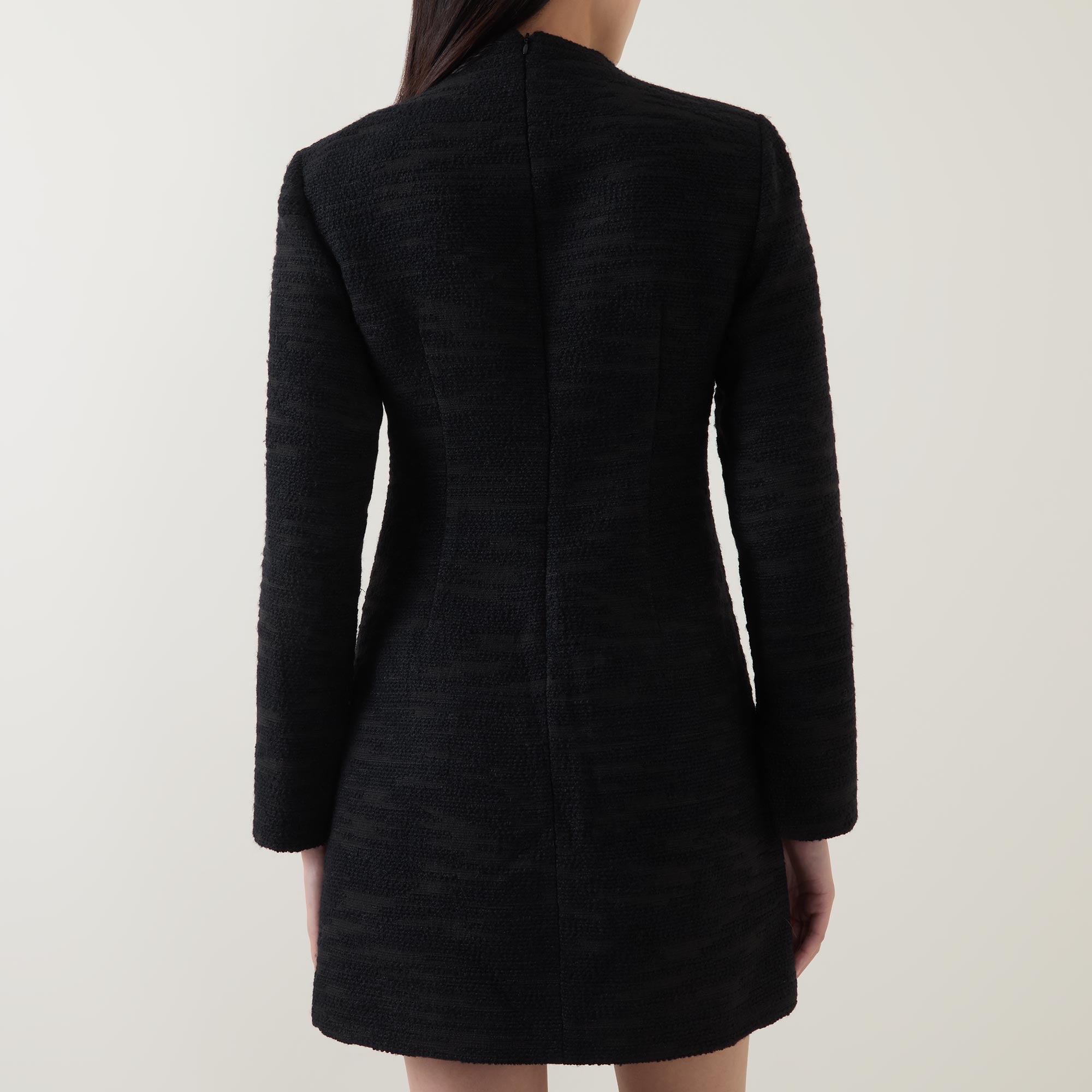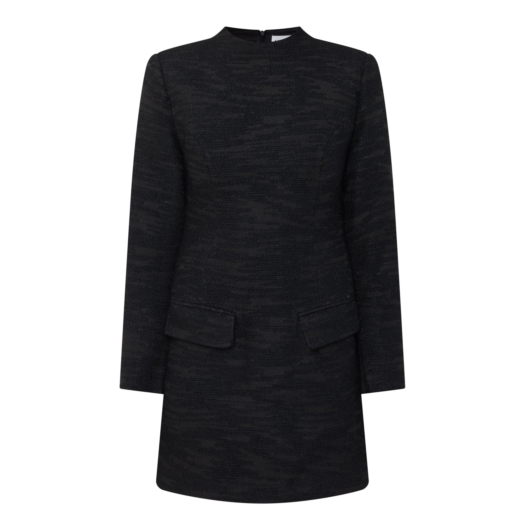 - High neckline, long sleeves, concealed rear zip fastening, fitted through the waist, two front flap pockets, flared skirt, straight hem, bouclé knit finish, mini length, lined