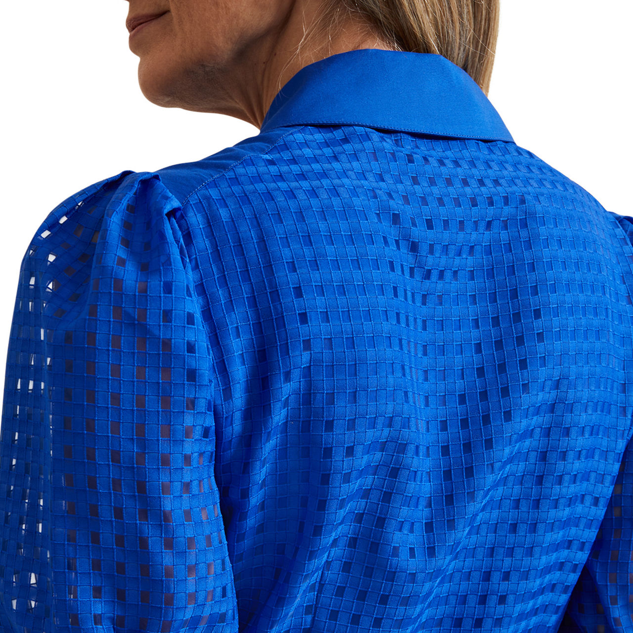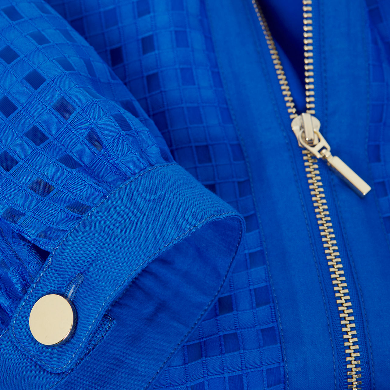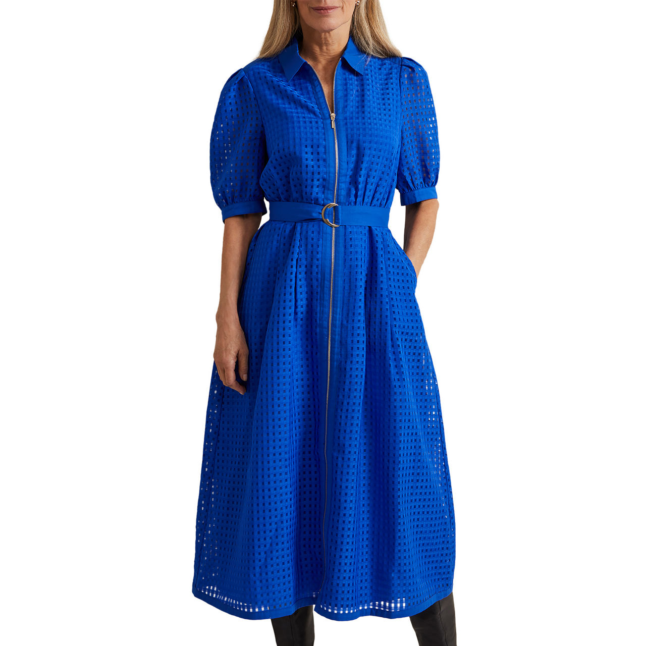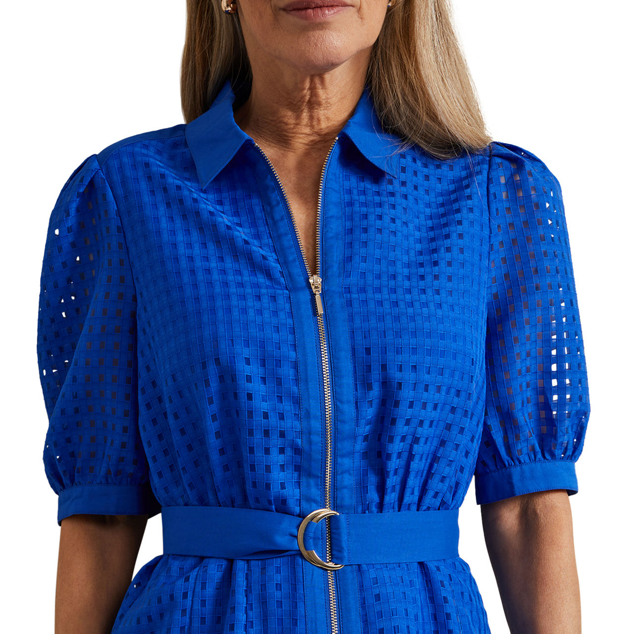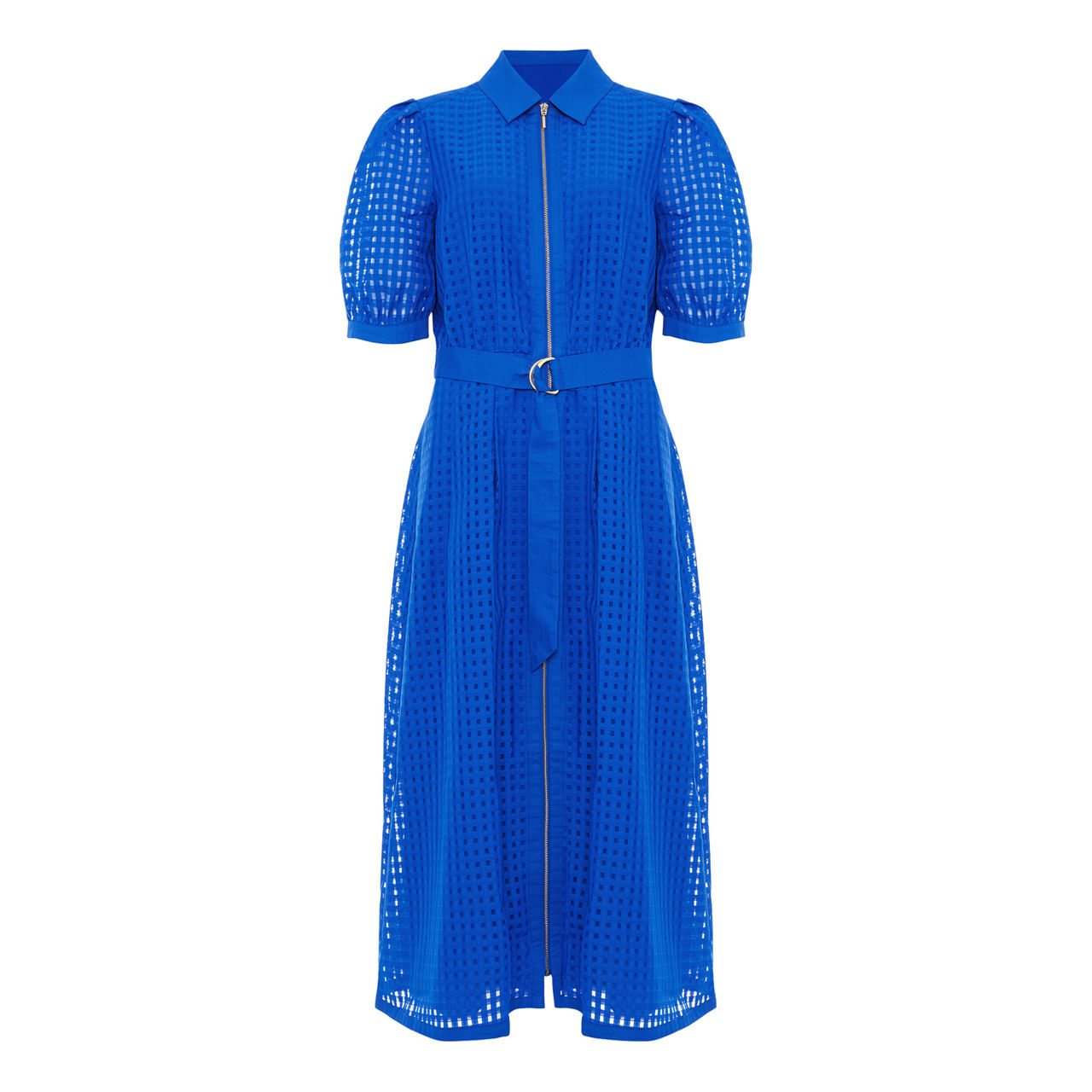 - Textured check pattern, short puffed sleeves with buttoned cuffs, front zip fastening, collared neckline, belt with D rings, midi length