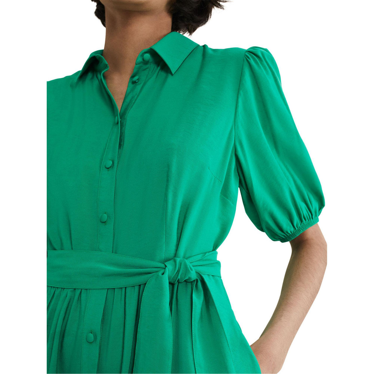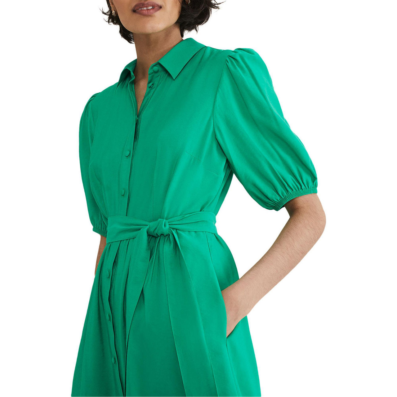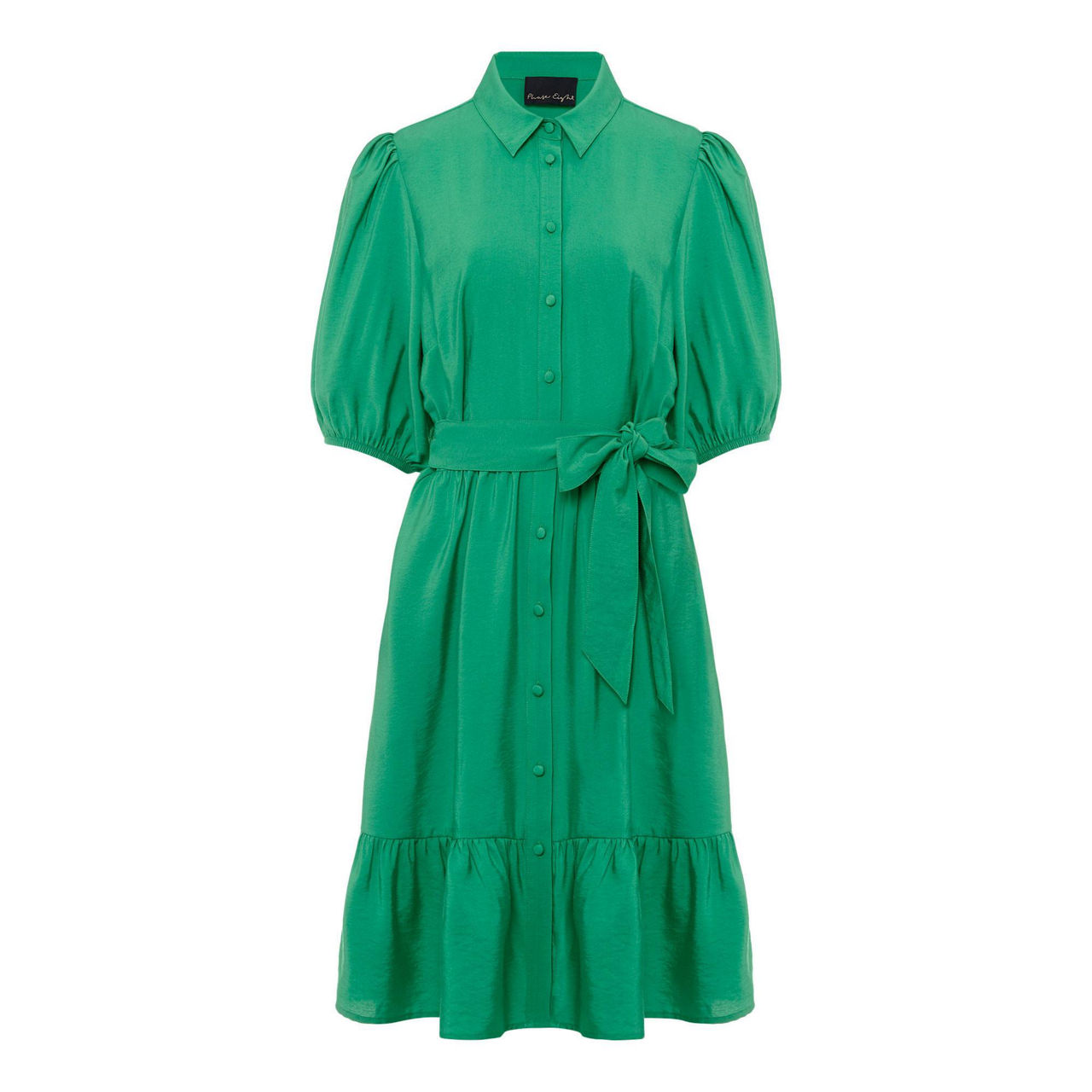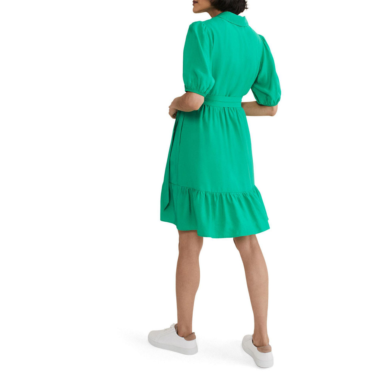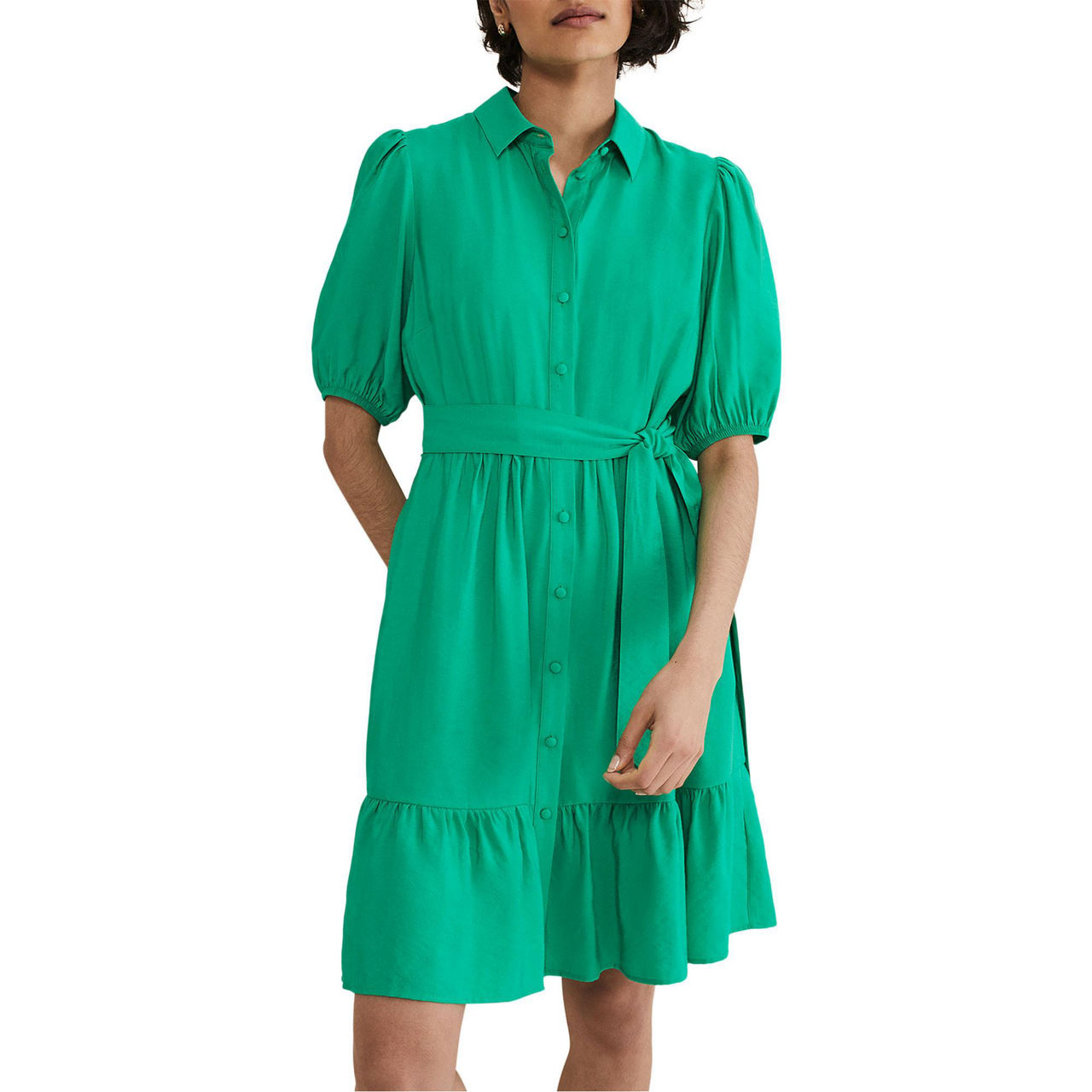 The perfect versatile style your everyday wardrobe needs. The vibrant green dress features short blouson sleeves, button-down detailing and falls to a flowing tiered skirt. Style with trainers and a leather bag for the perfect everyday look.