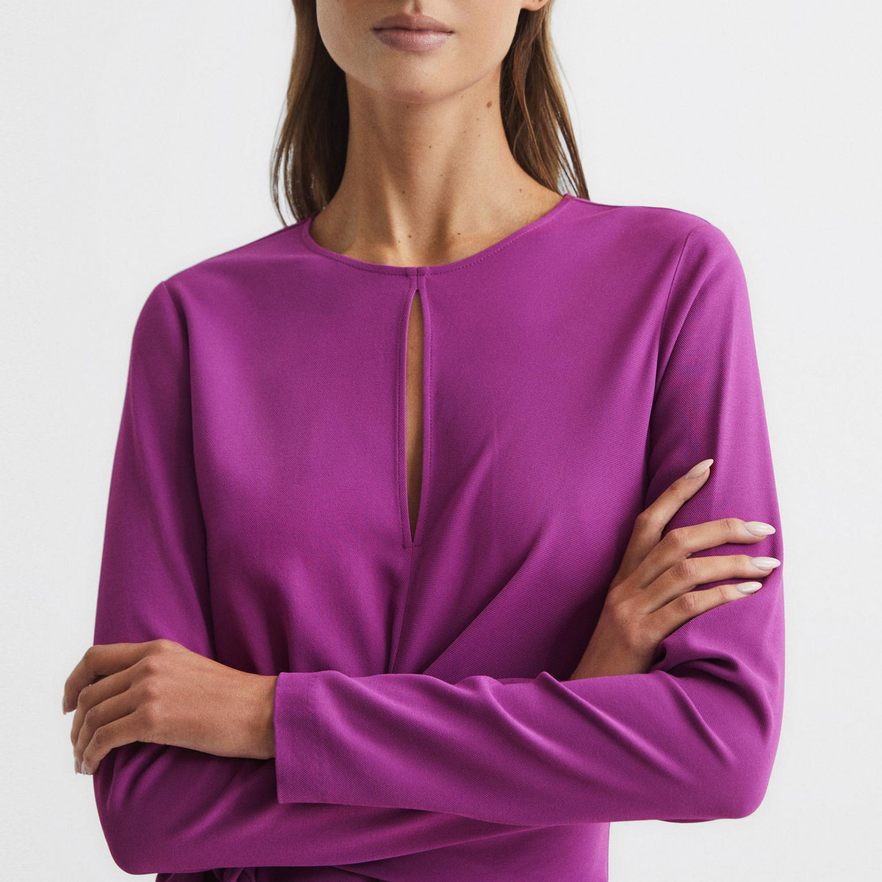 - Tie waist draped detail, long sleeves, round neck, keyhole cut-out detail to front, split hem to back