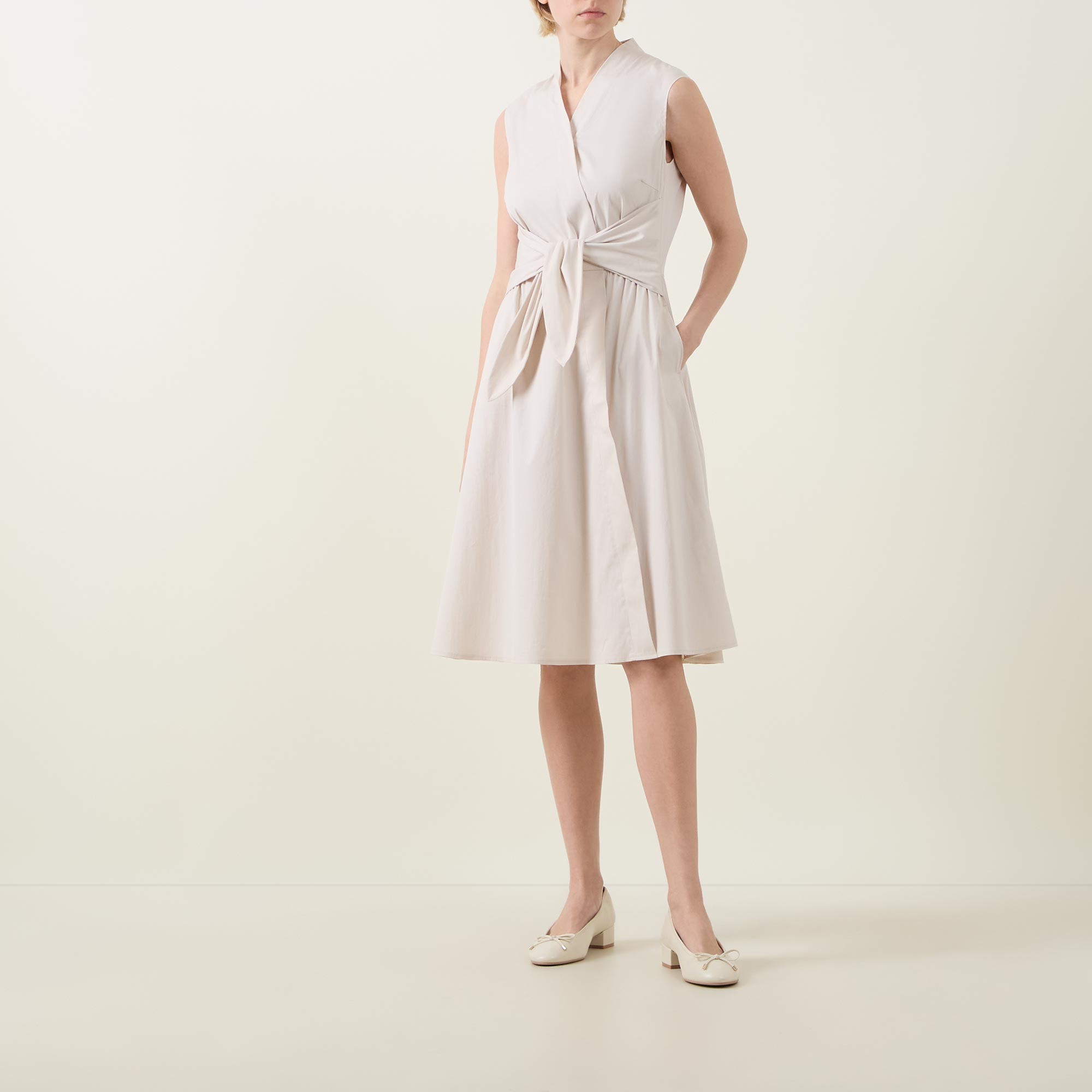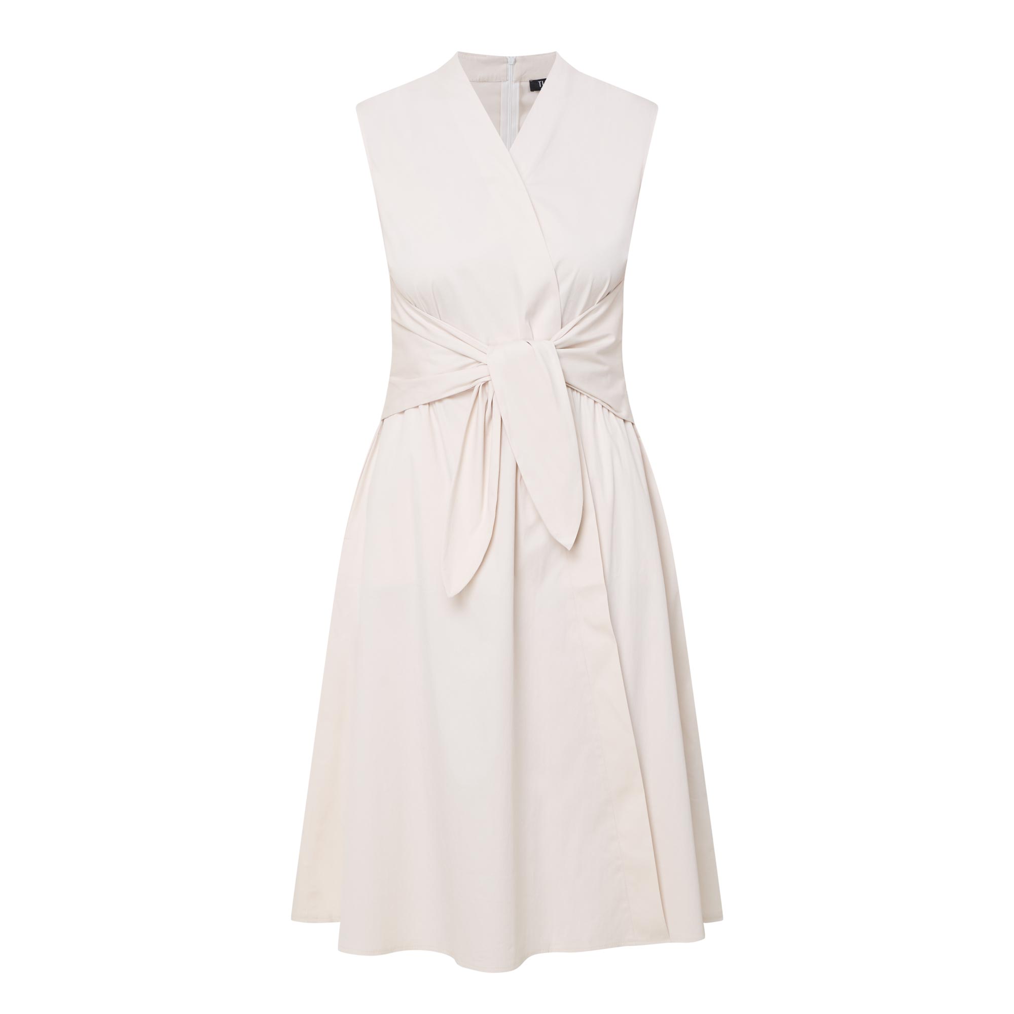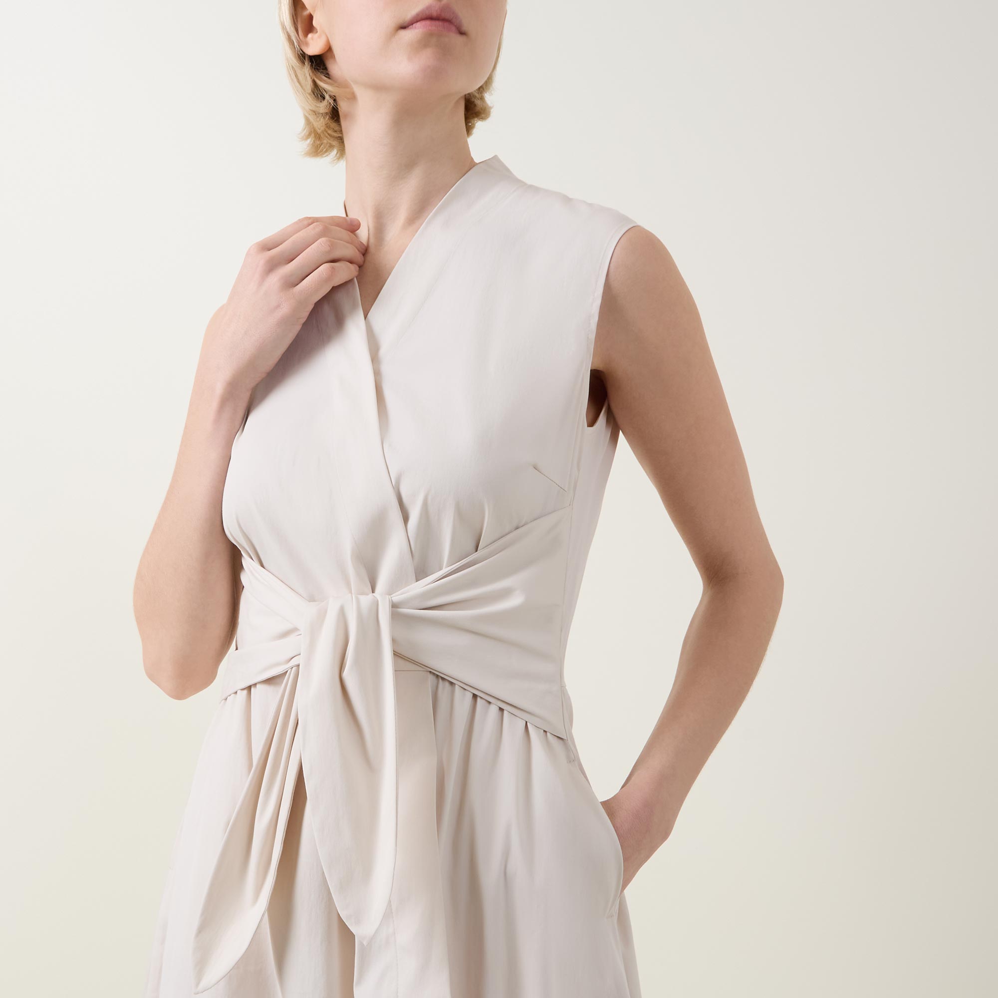 - Wrap-style with tie detail, V-neckline, sleeveless, midi length, side entry pockets, flared hemline, crease-resistant fabric
