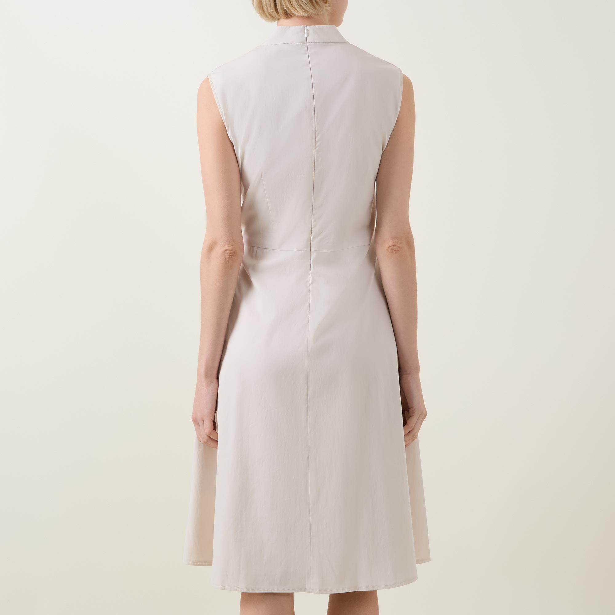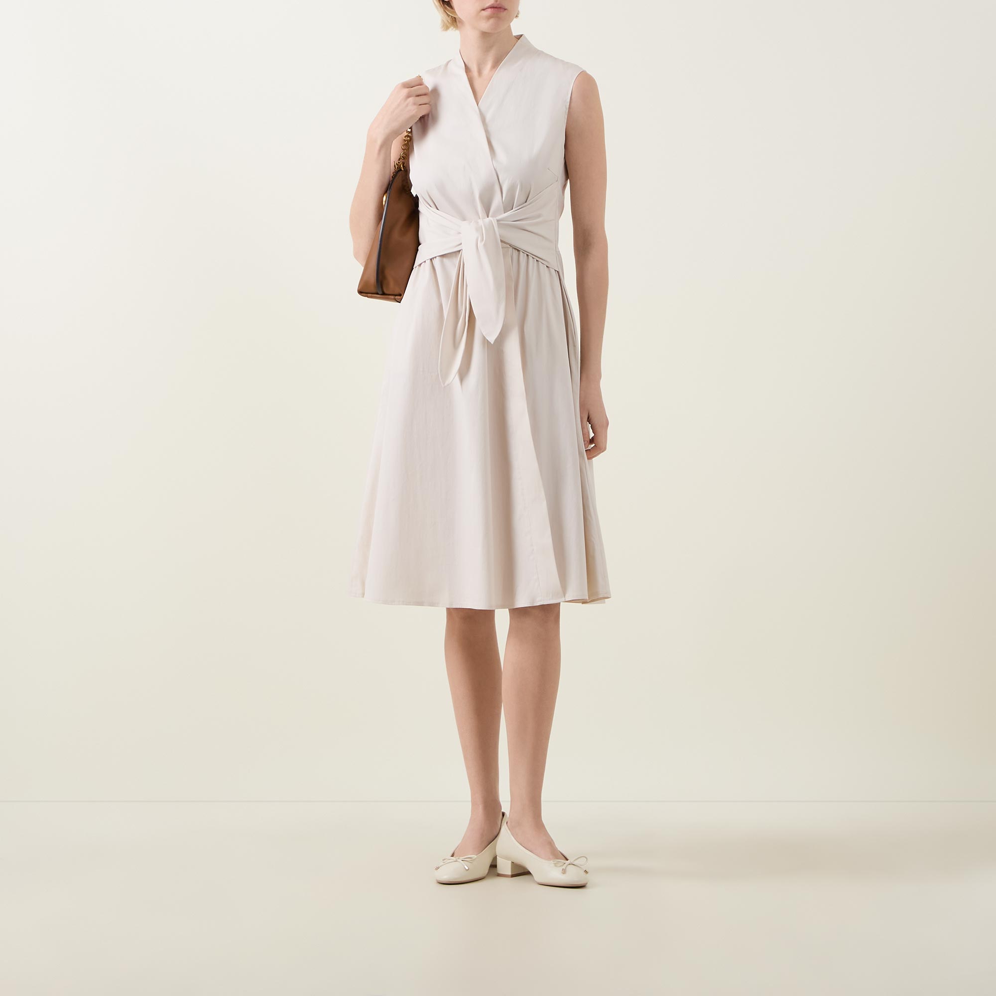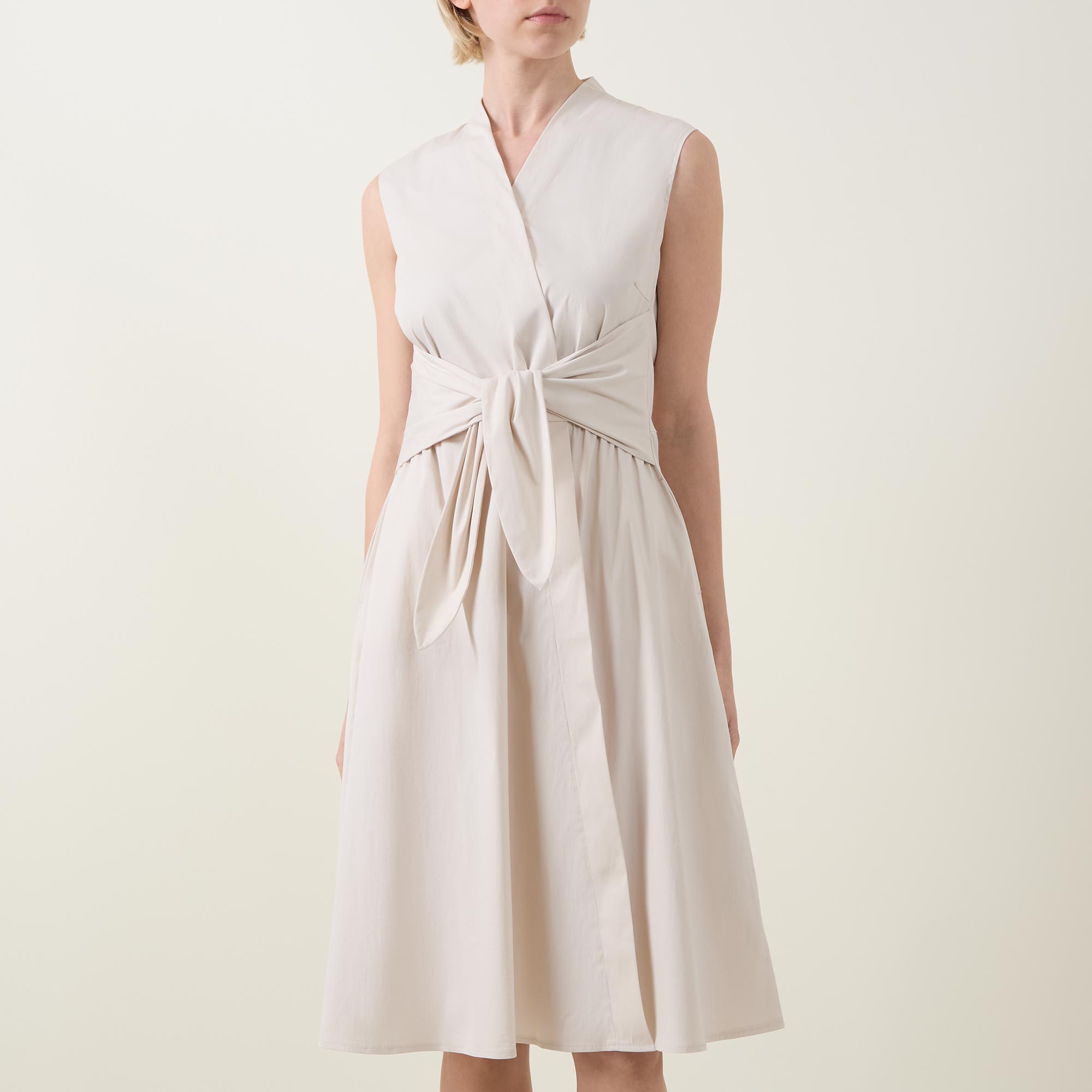 - Wrap-style with tie detail, V-neckline, sleeveless, midi length, side entry pockets, flared hemline, crease-resistant fabric