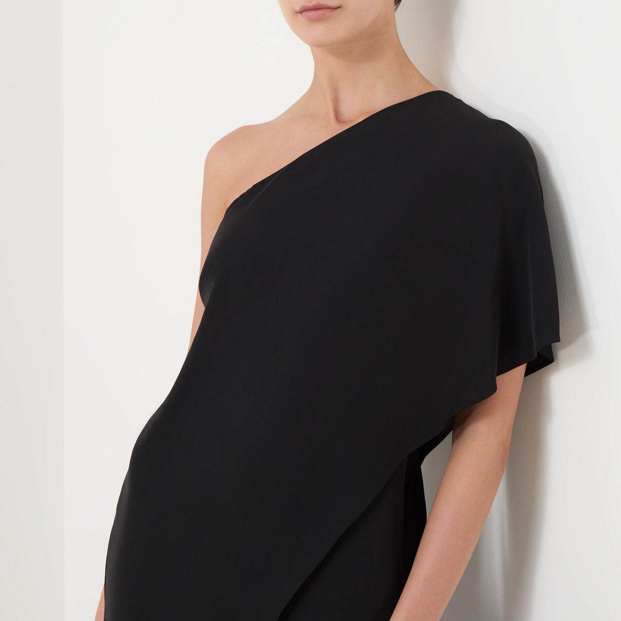 - One-shoulder design, draped cape style, smooth fabric