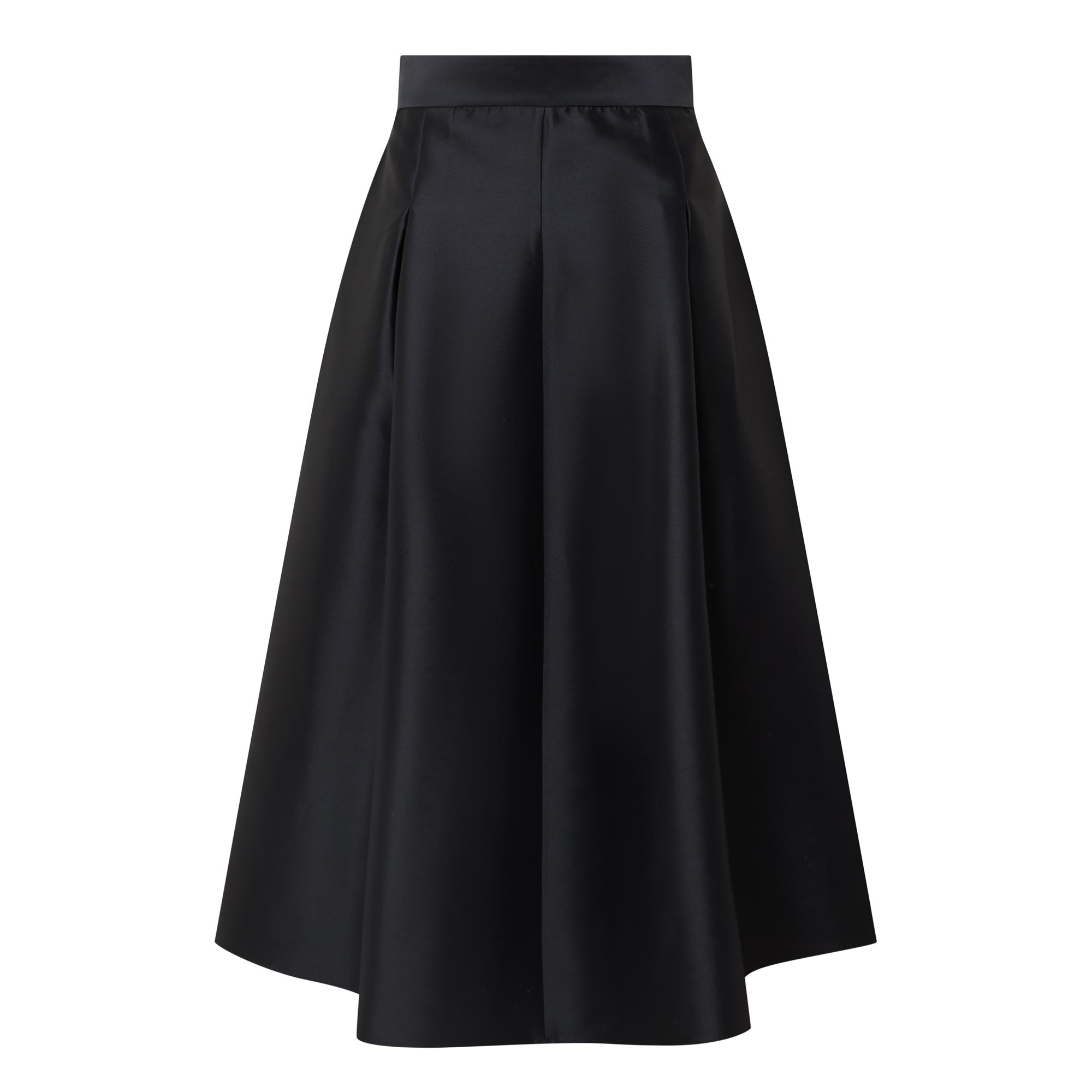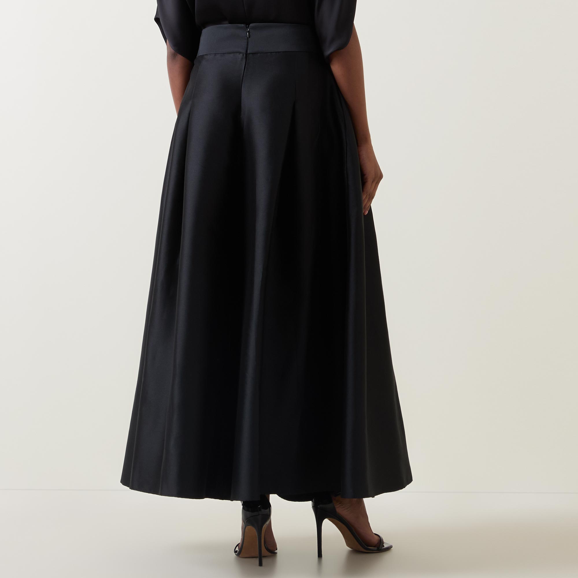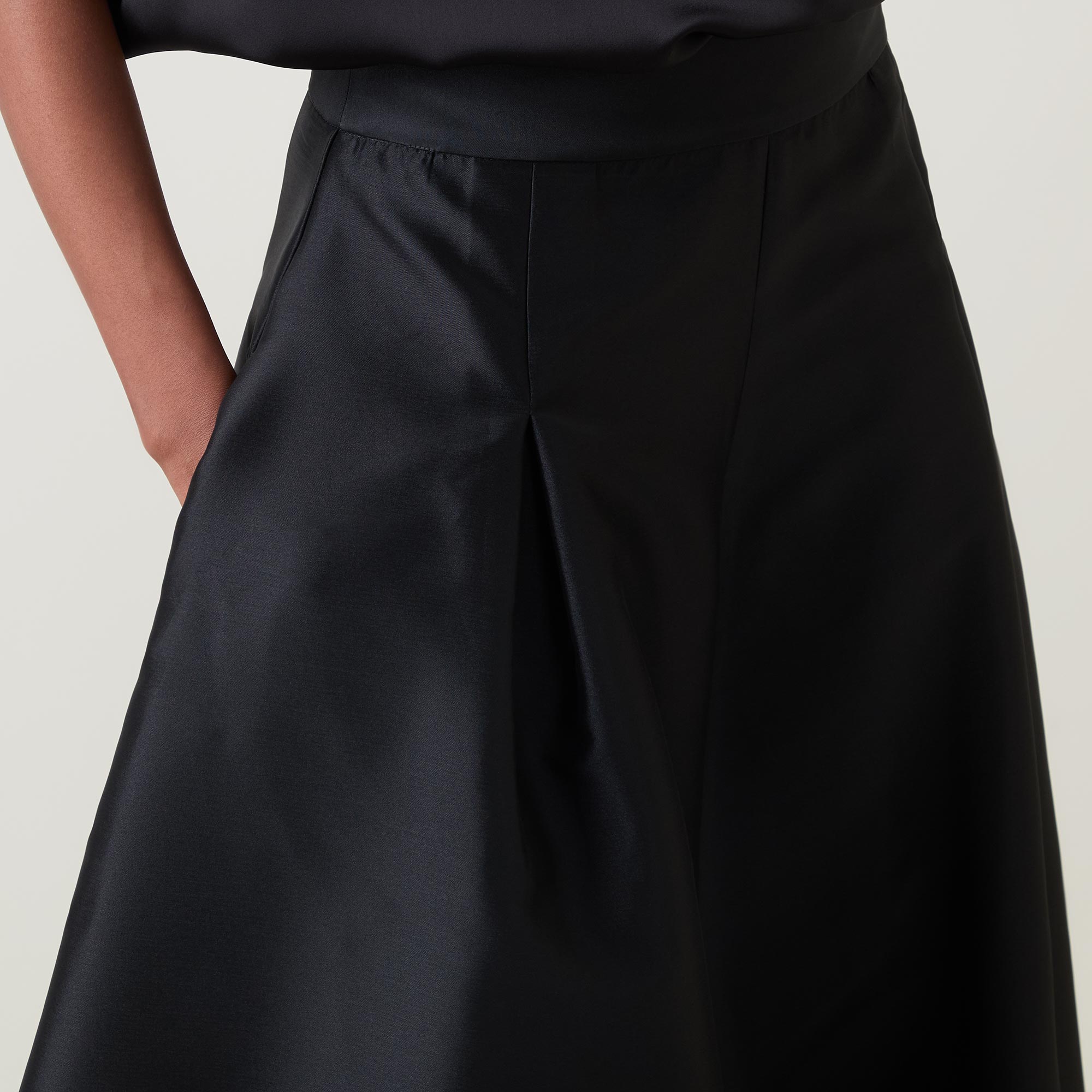 - Fit-and-flare silhouette, high waisted, satin fabric, midi length, two side pockets