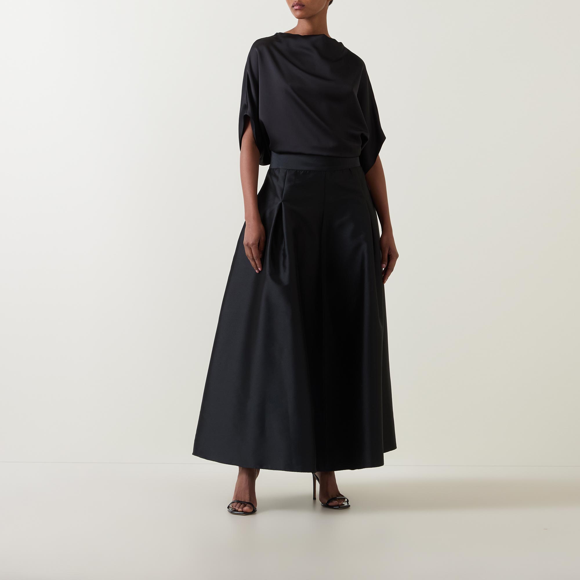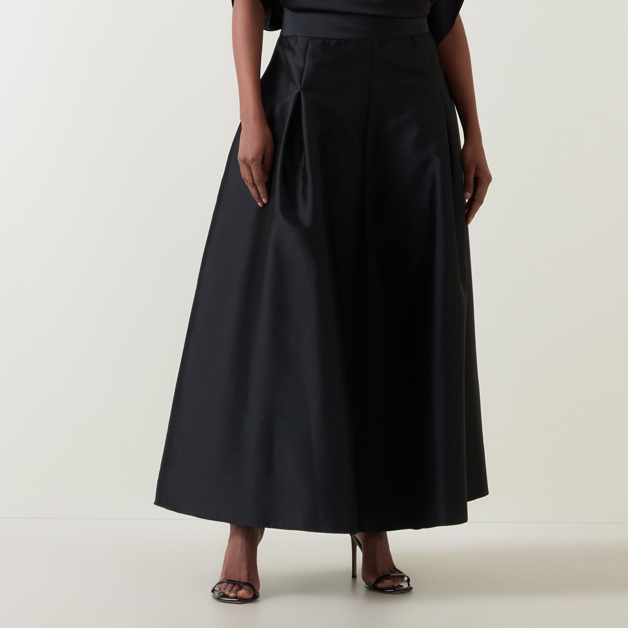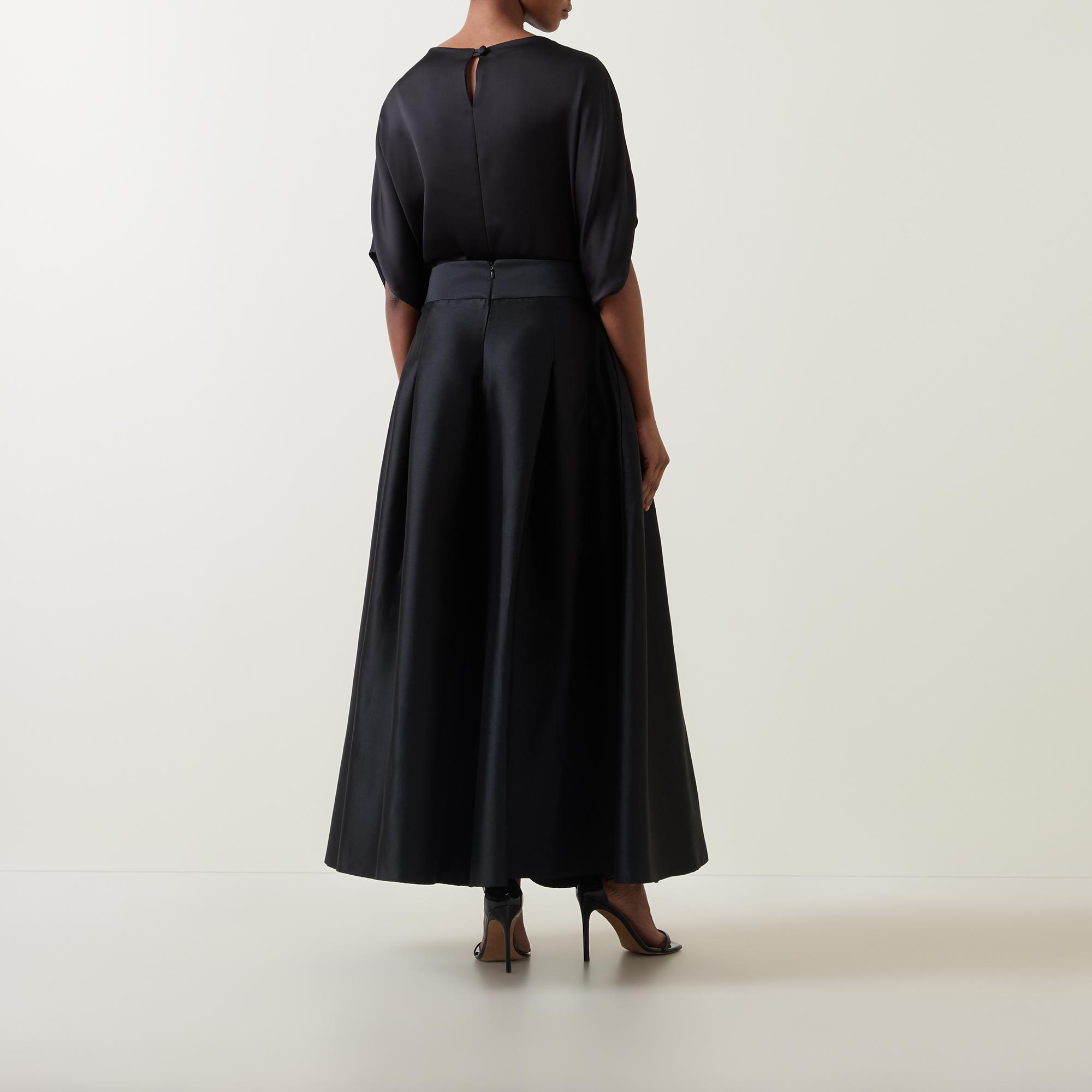- Fit-and-flare silhouette, high waisted, satin fabric, midi length, two side pockets