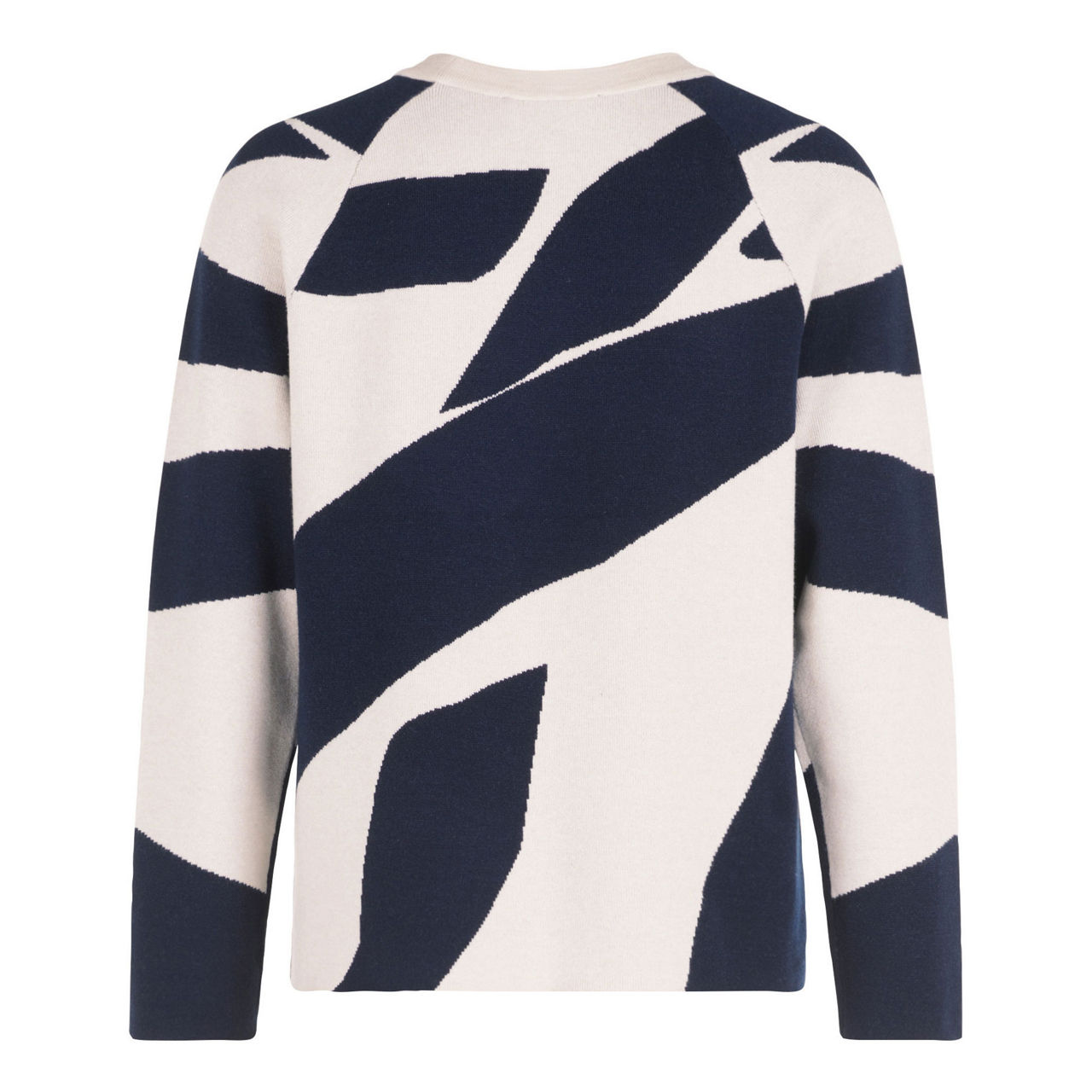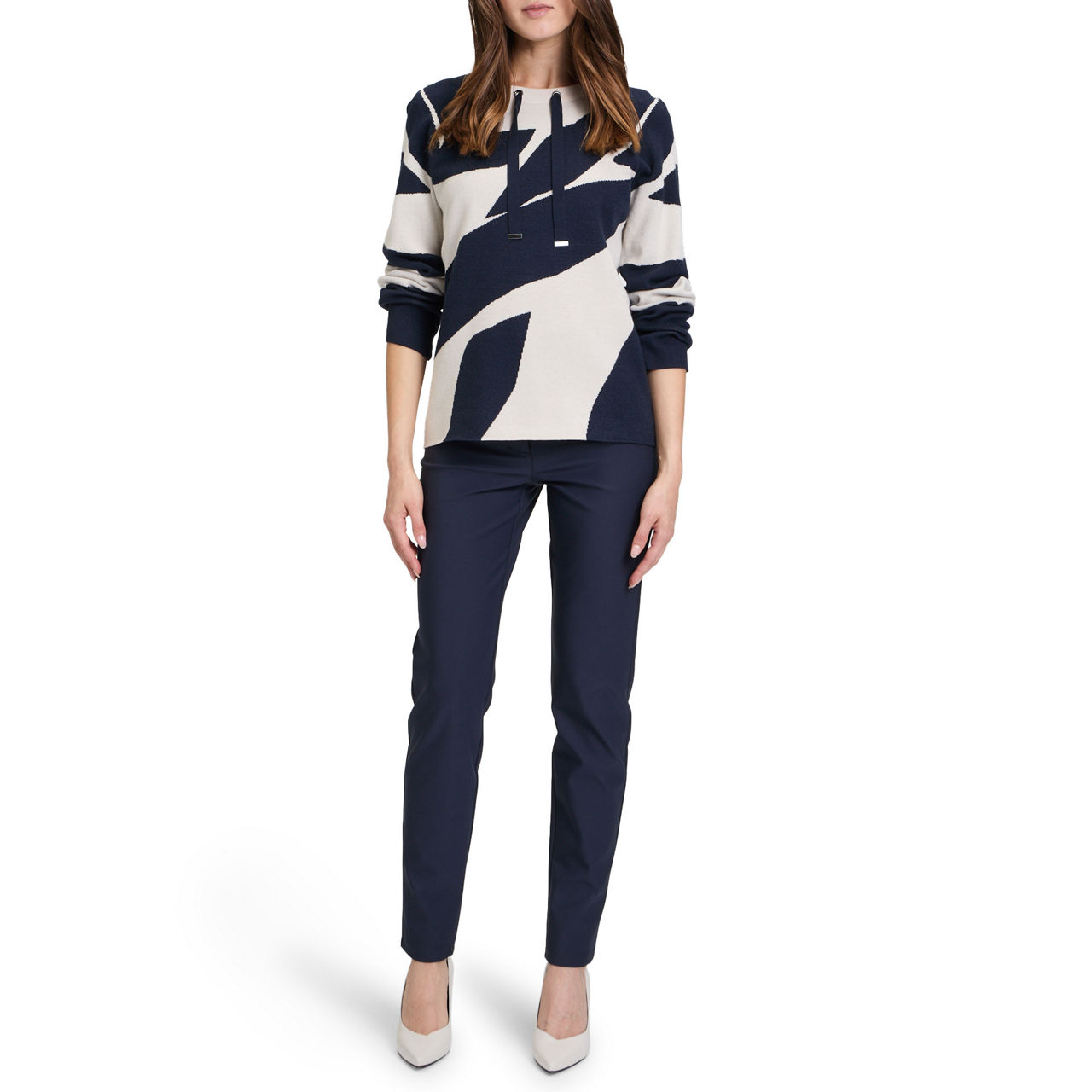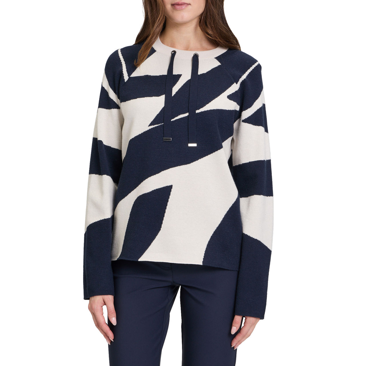 - Colour-block pattern, round neck with drawstring tie, fine knit, long sleeves