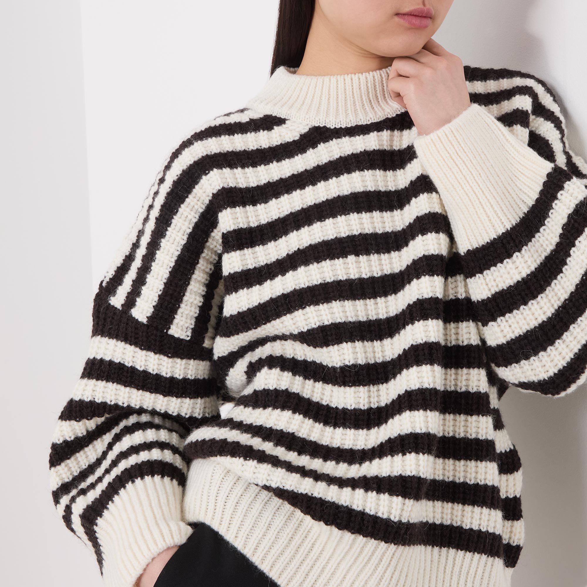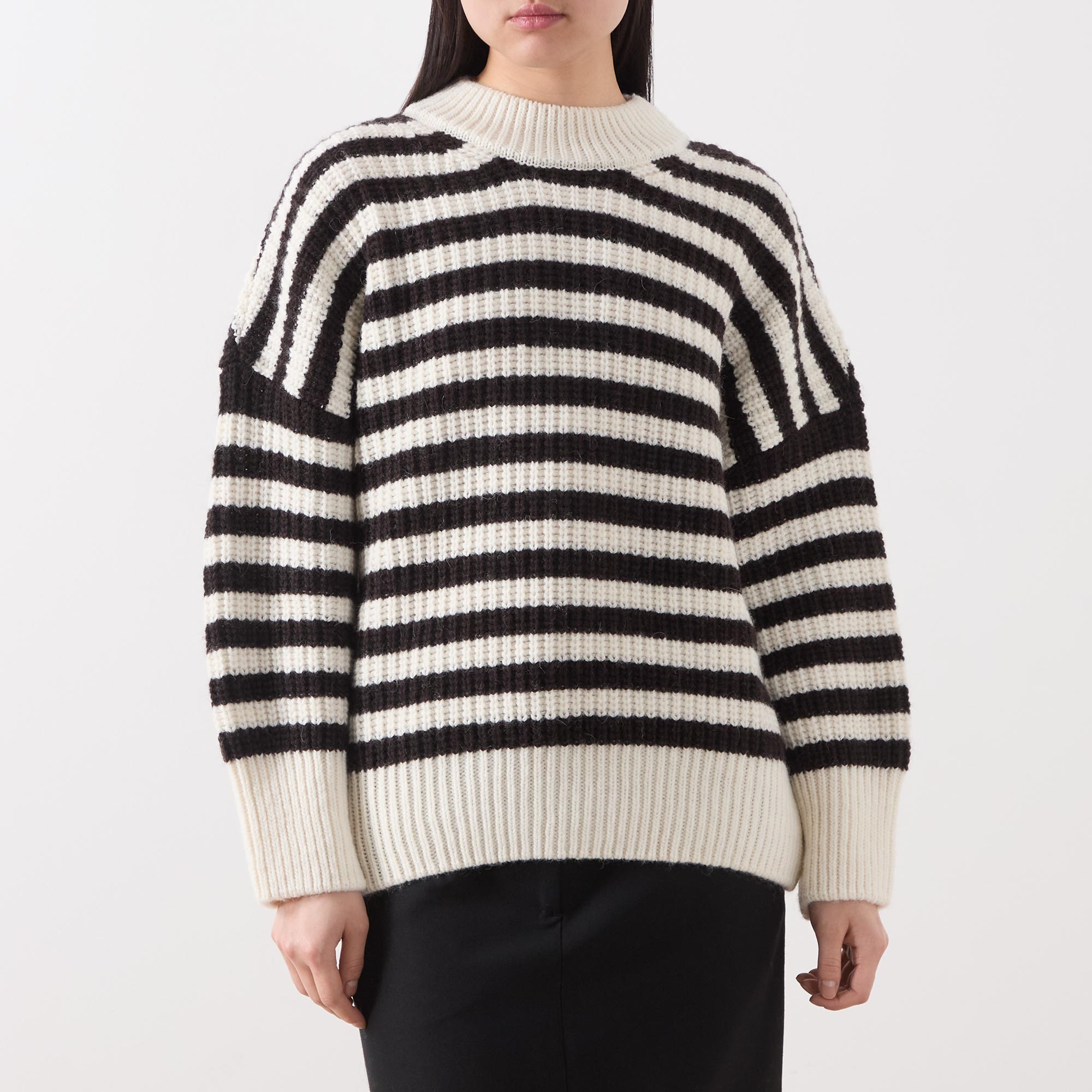 - Extended crew neckline, dropped shoulders, long sleeves, ribbed trims, stripe pattern, chunky rib knit structure