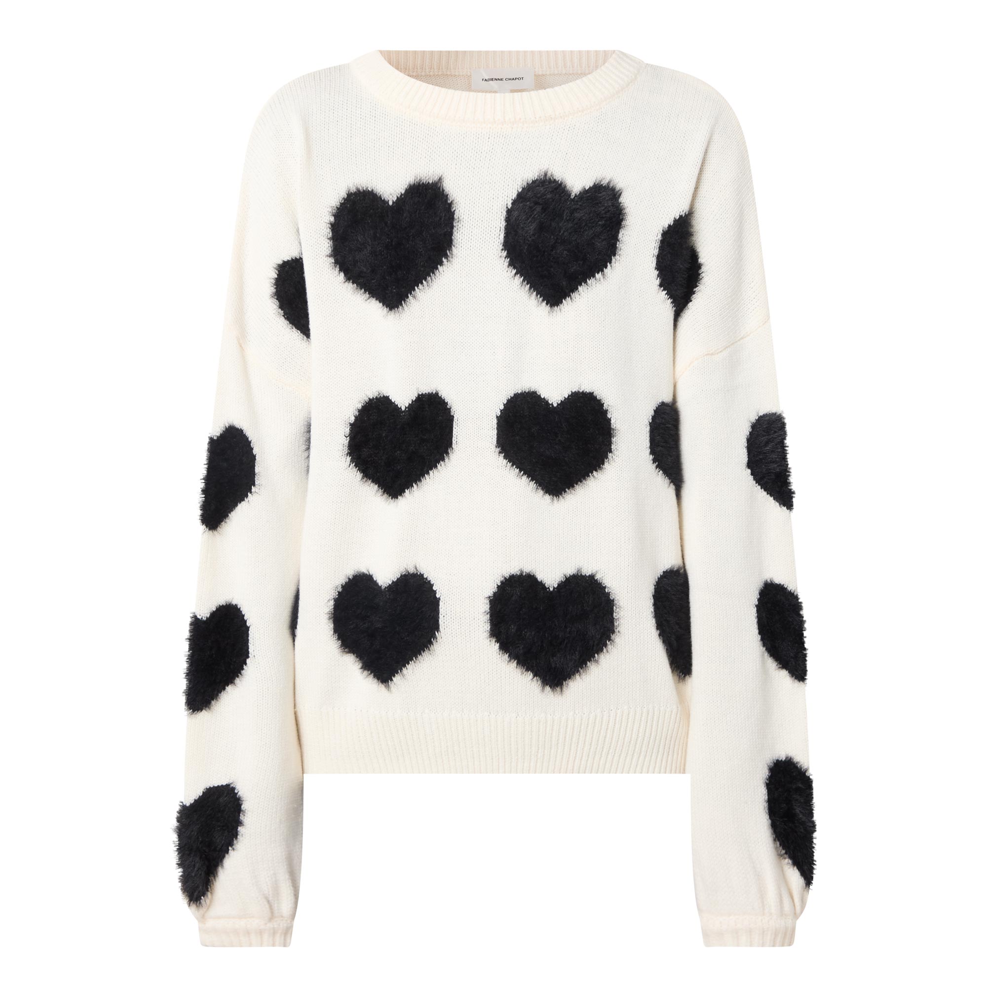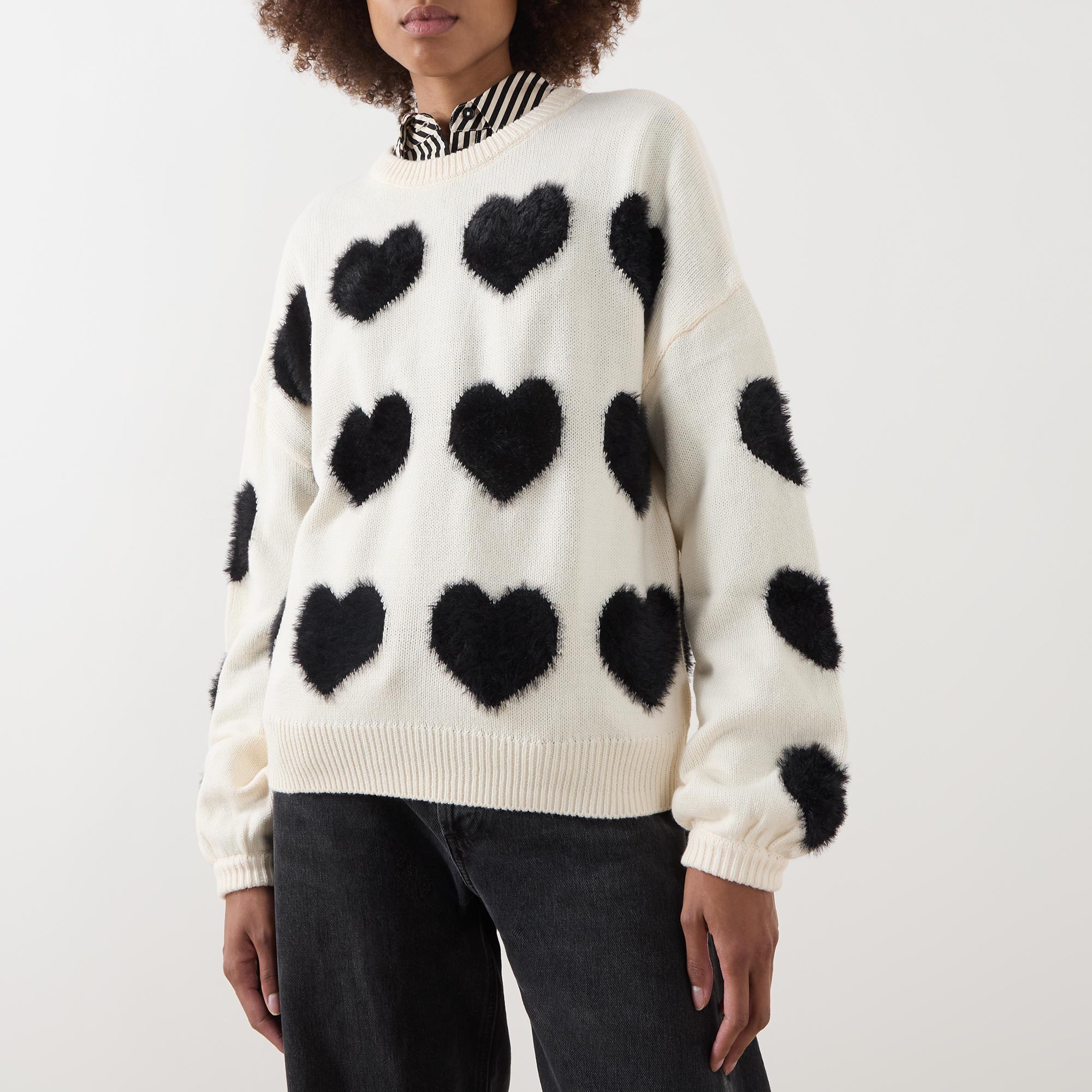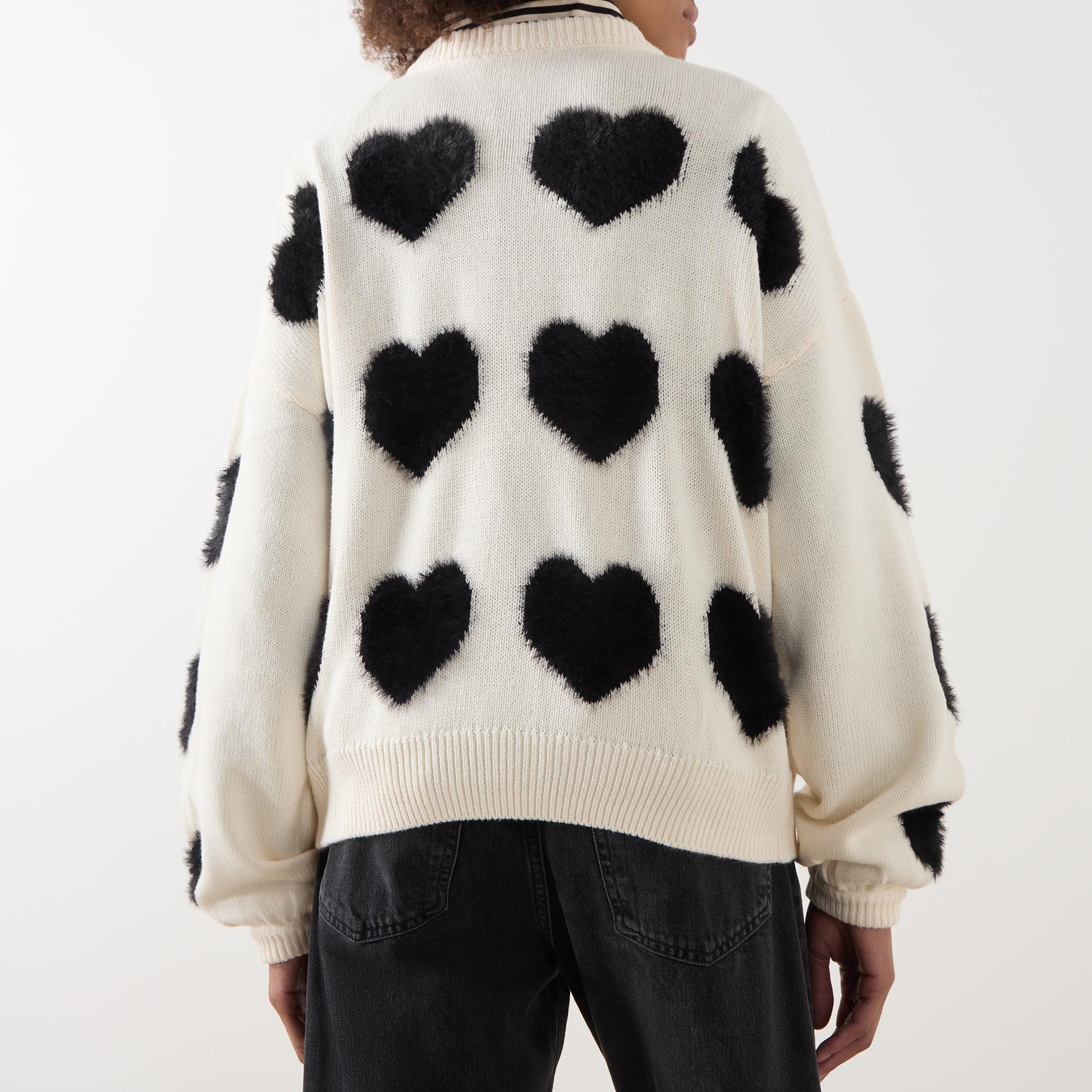 - Crew neckline, dropped shoulders, extra-long sleeves, straight hem, ribbed trims, contrasting textured heart-shaped detailing, knit construction, soft finish