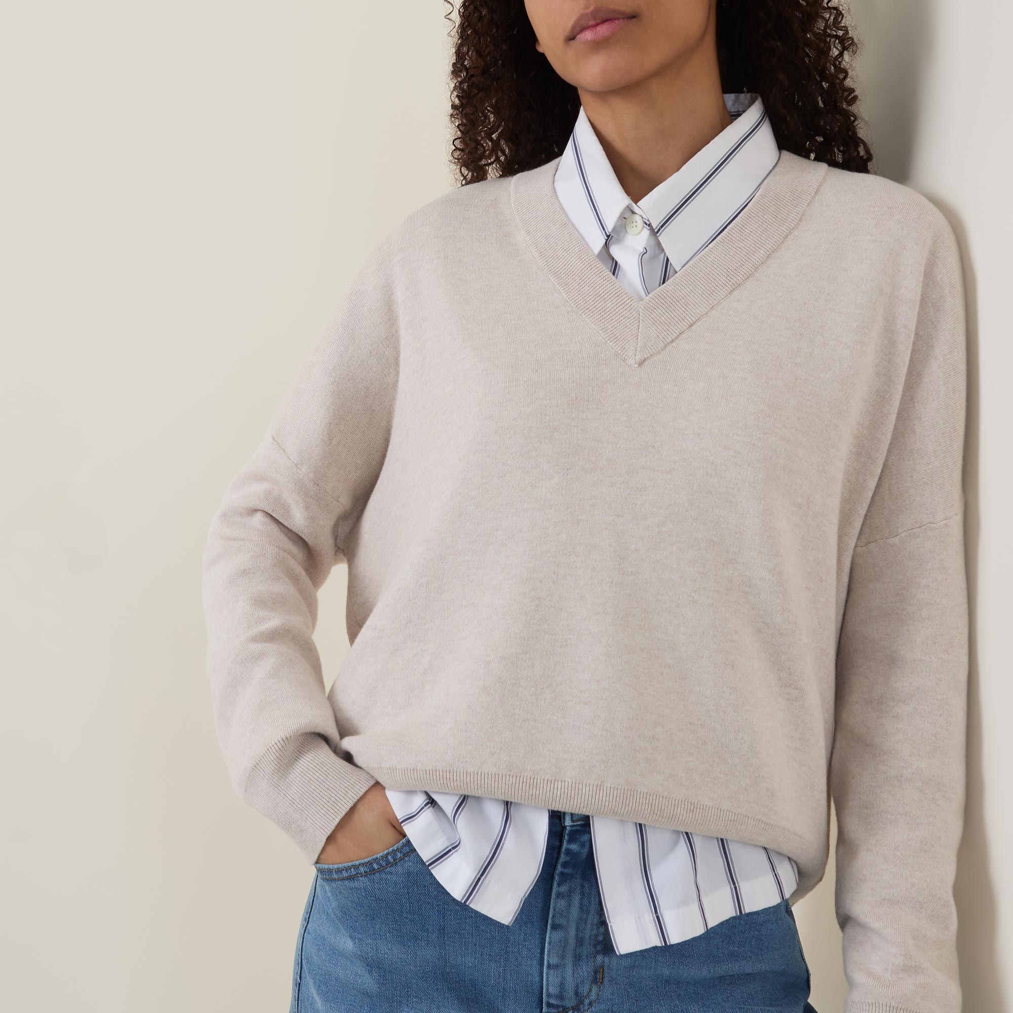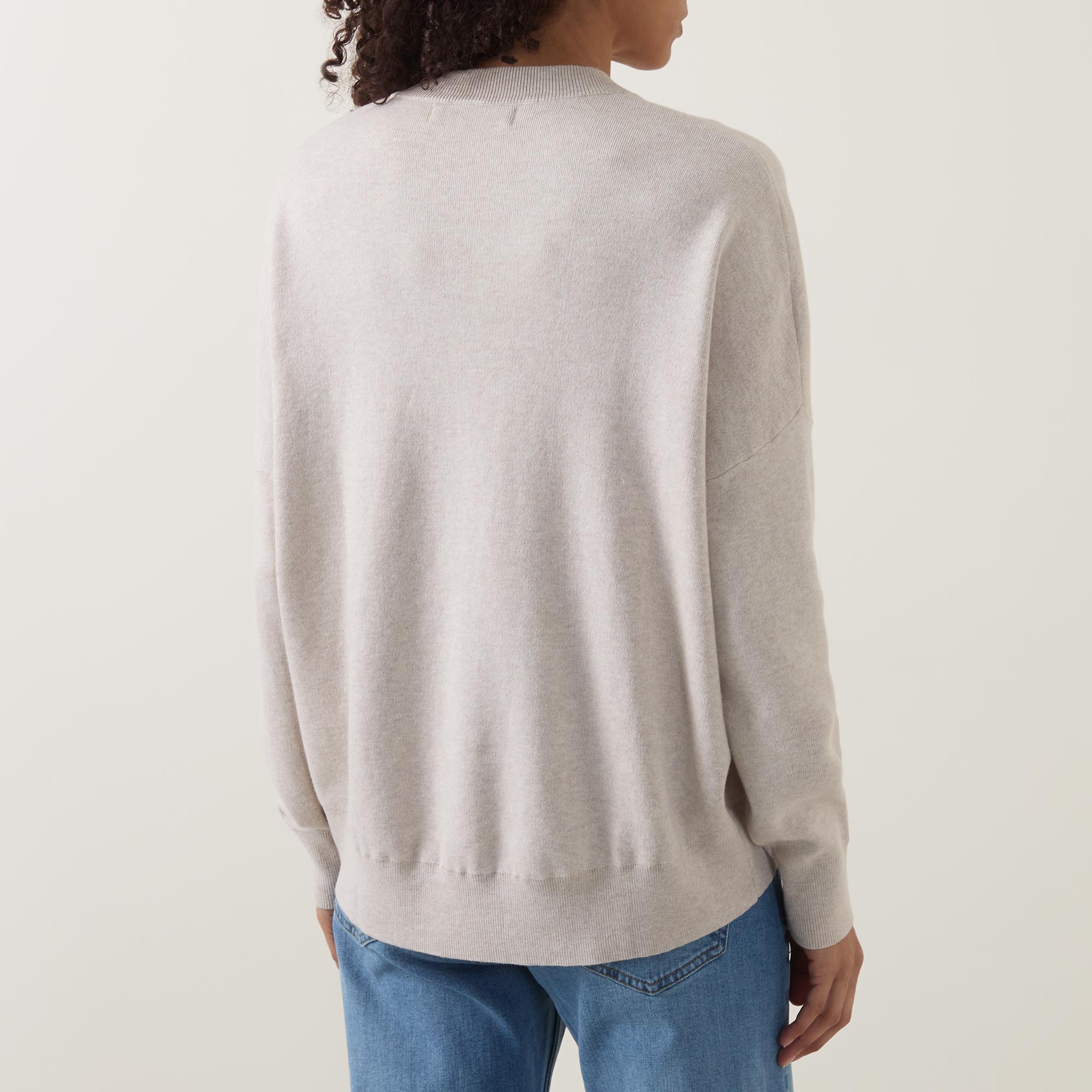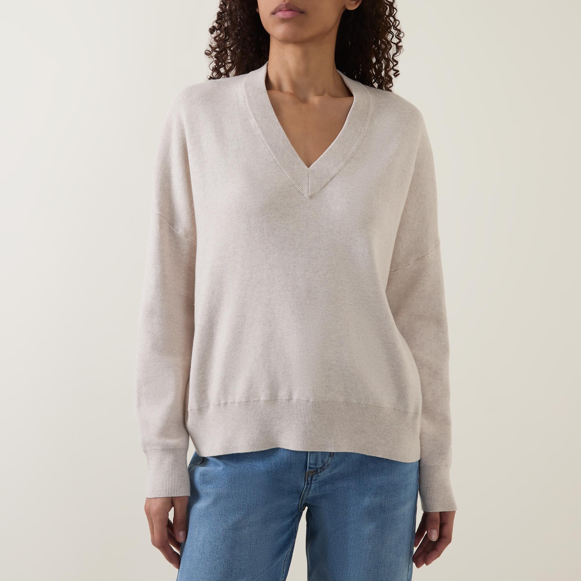 - V-neckline, dropped shoulders, long sleeves, straight hem, ribbed trims, knit construction, soft finish