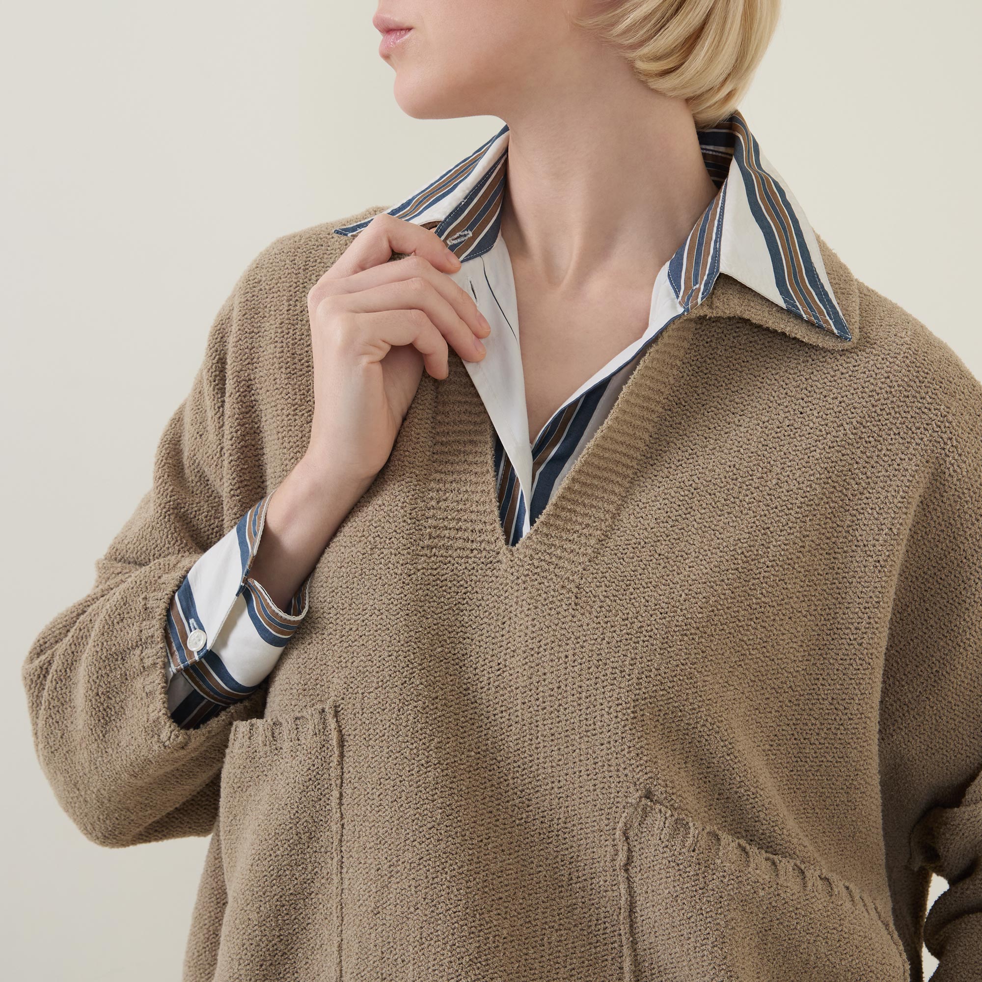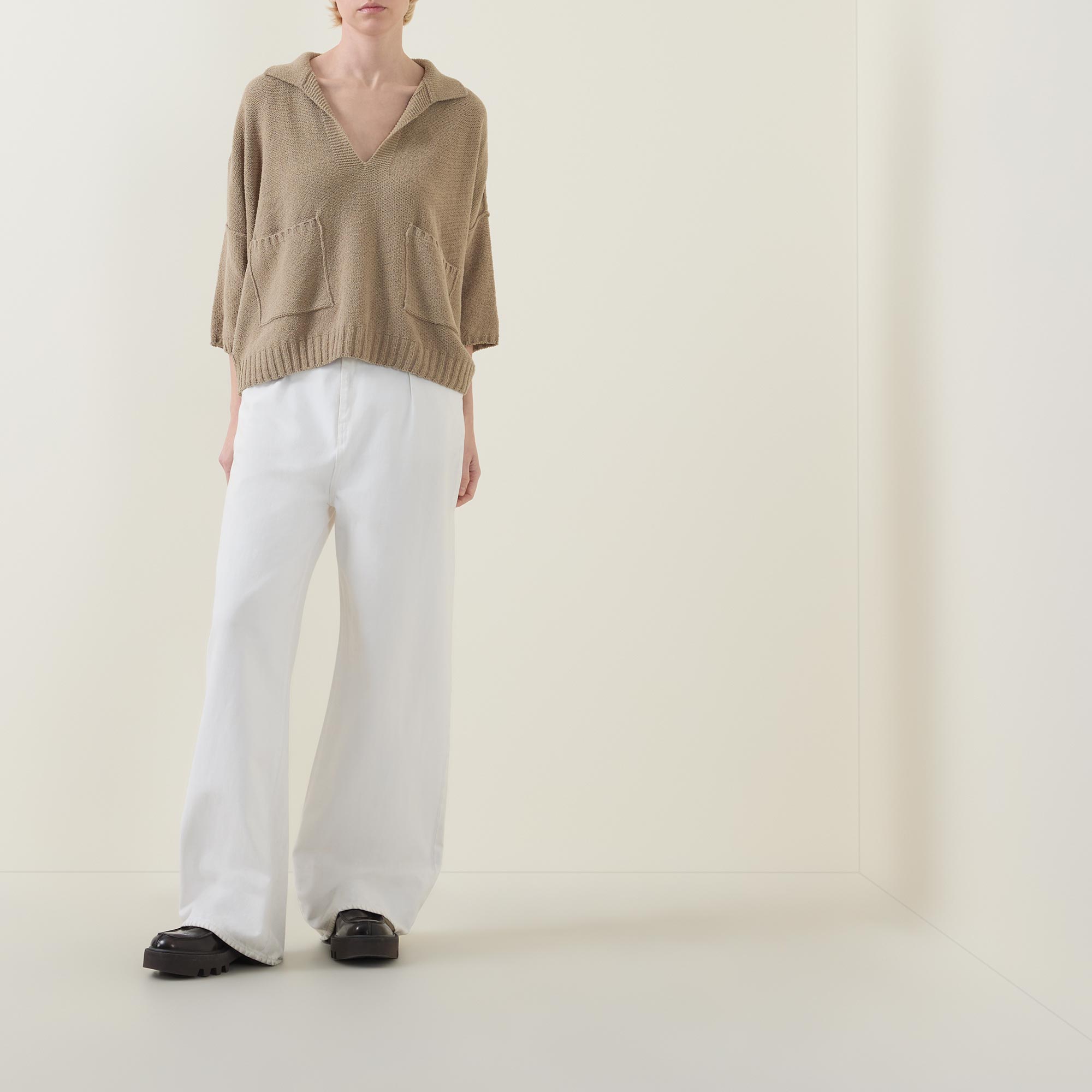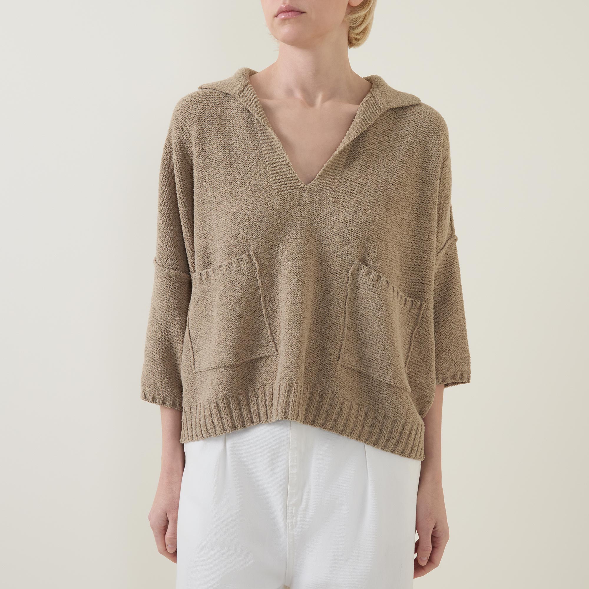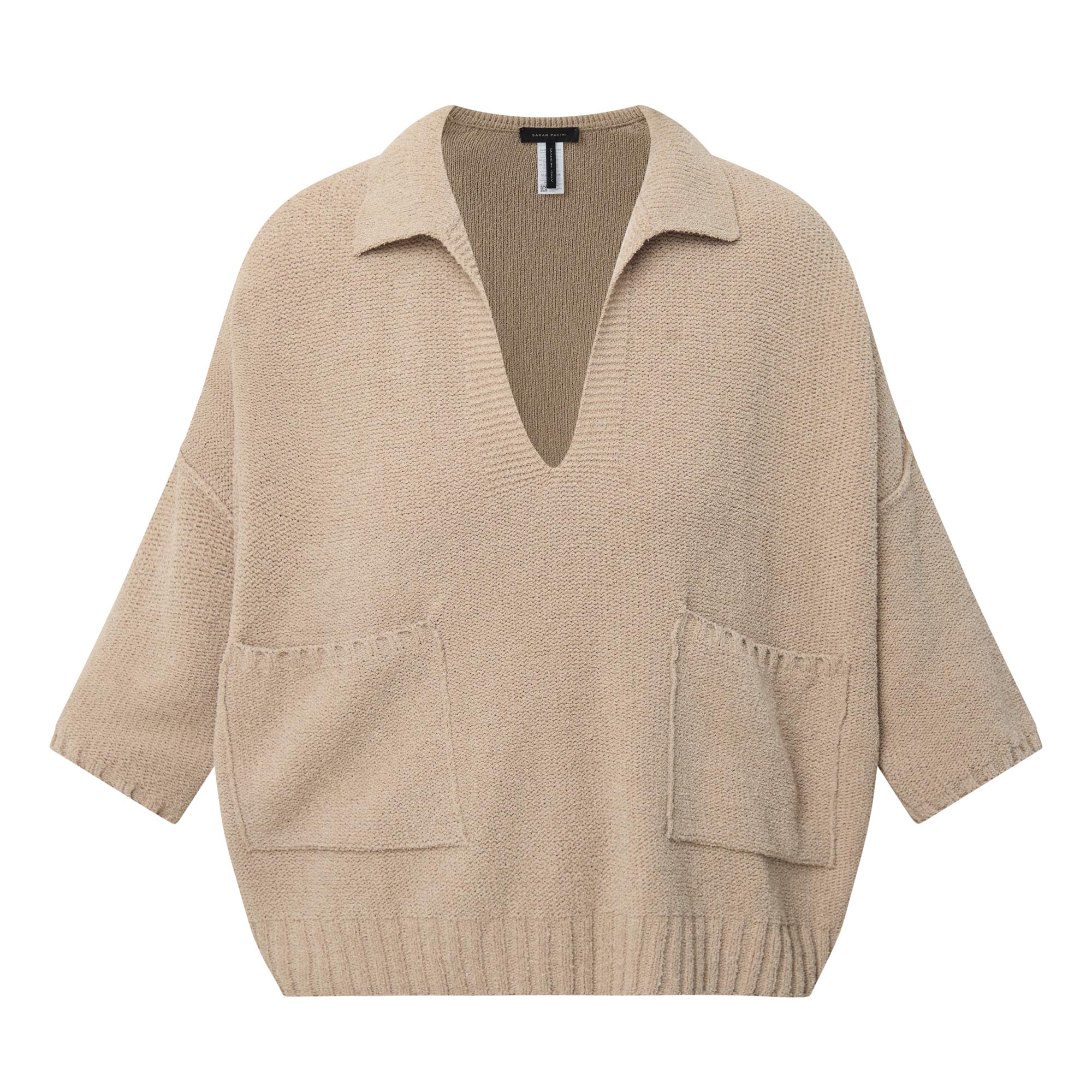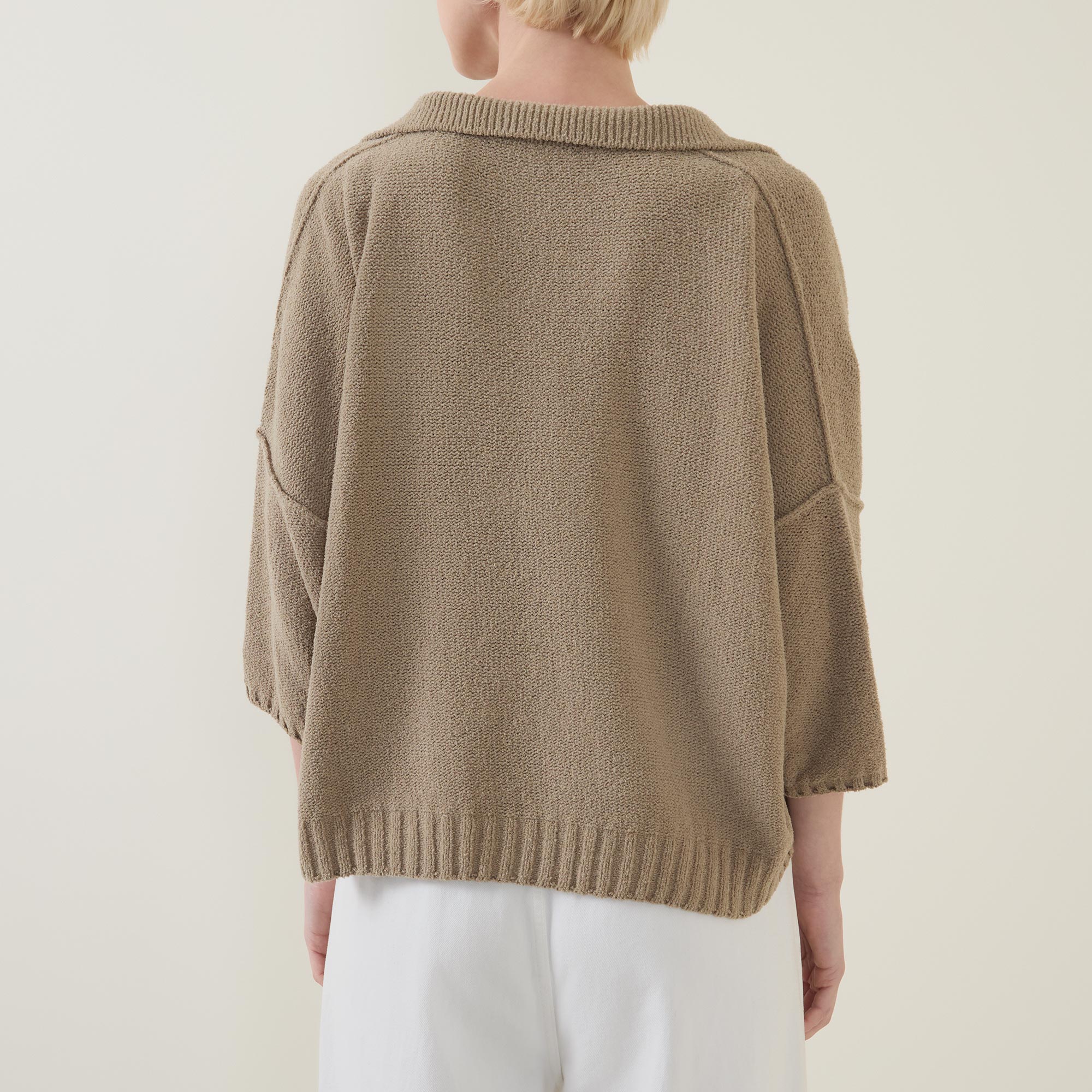 • Spread polo collar, mid-length sleeves, dropped shoulders, V-neckline, ribbed trims, inverted seams, pullover style, knitted finish