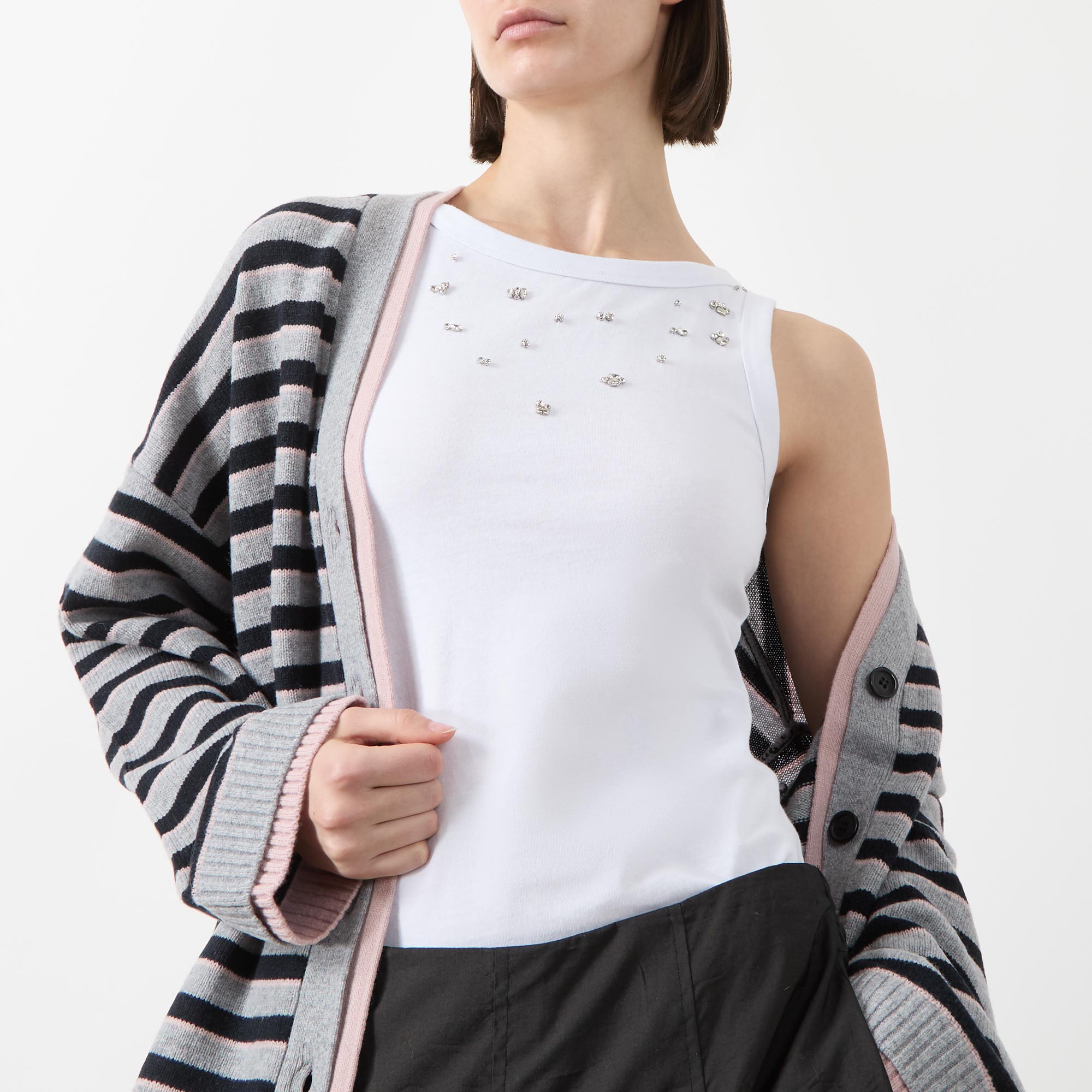 - Boat neckline, sleeveless design, straight hem, rhinestone detailing