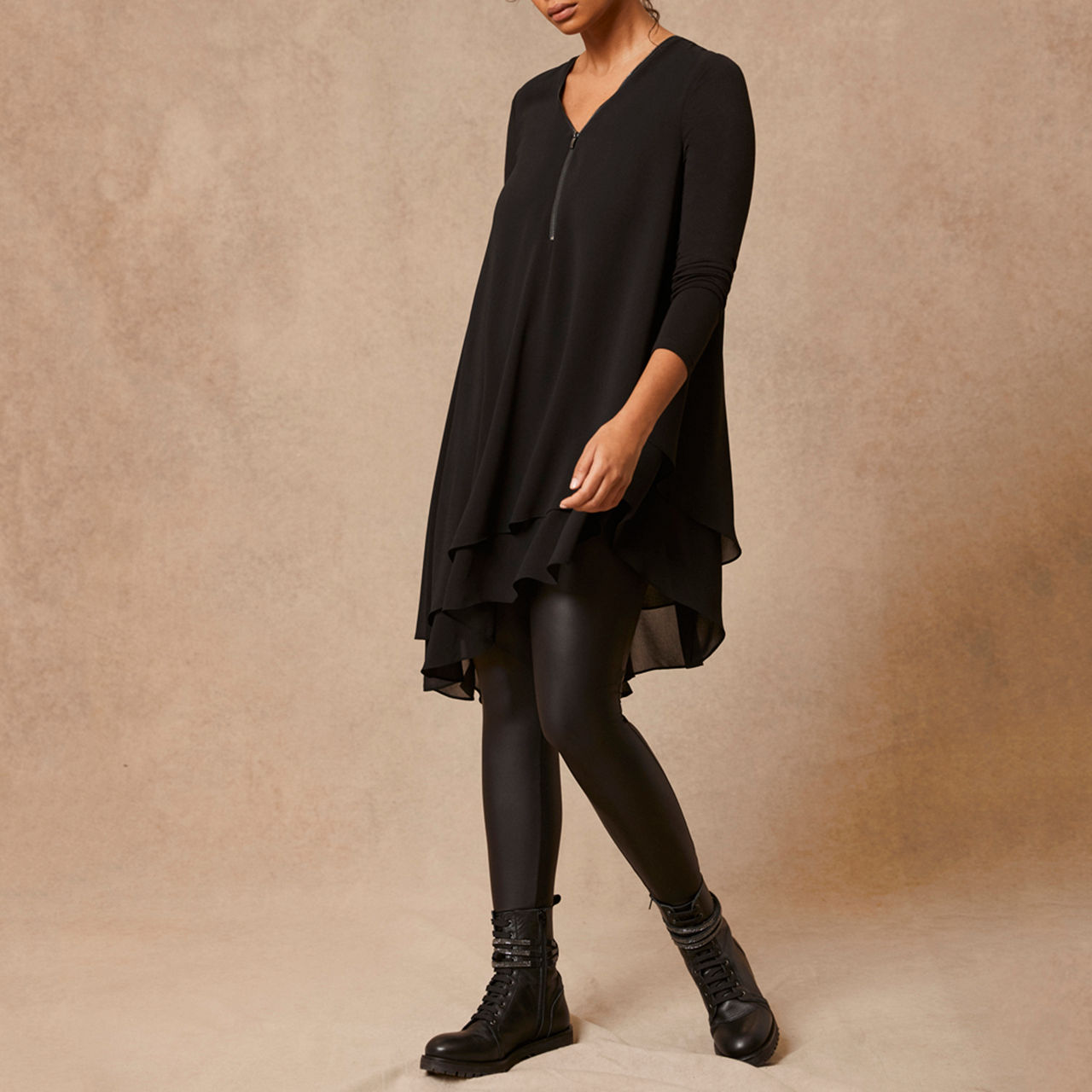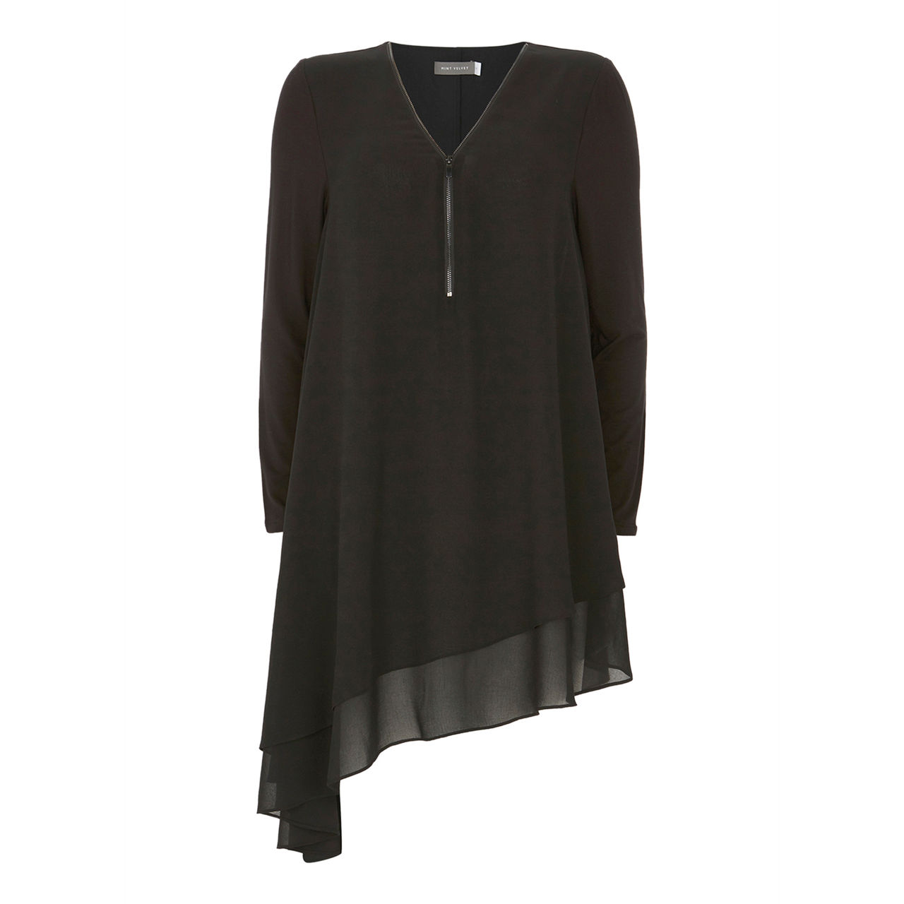 Designed in a longline silhouette with a layered asymmetric hem, this black top combines a fluid chiffon body with jersey sleeves for the perfect blend of comfort and style. With a flattering zipped V neckline - try yours with leather trousers and boots this season.