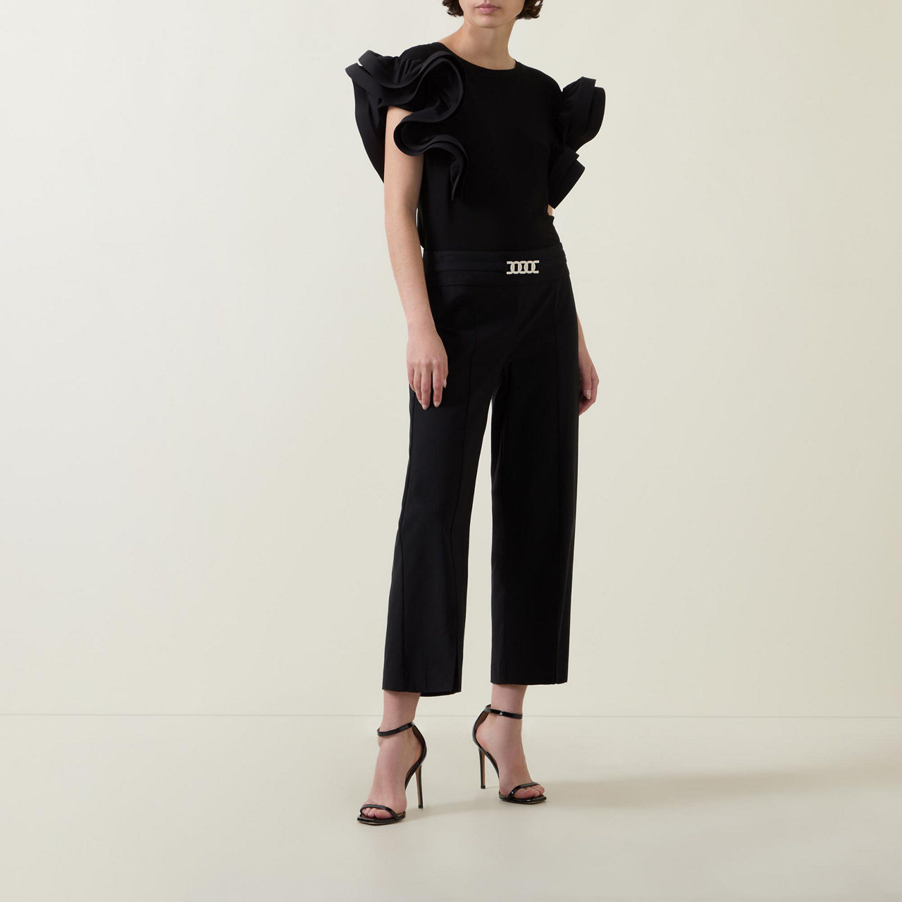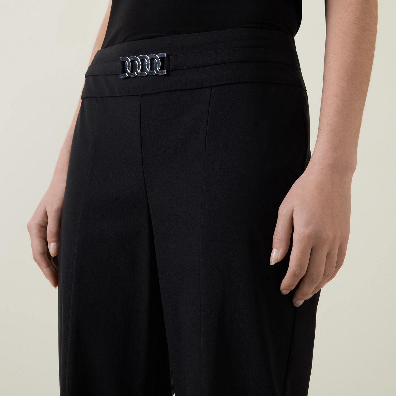 - Concealed zip-fly fastening, front belt detail, open slit cuffs, pressed creases, smooth fabric