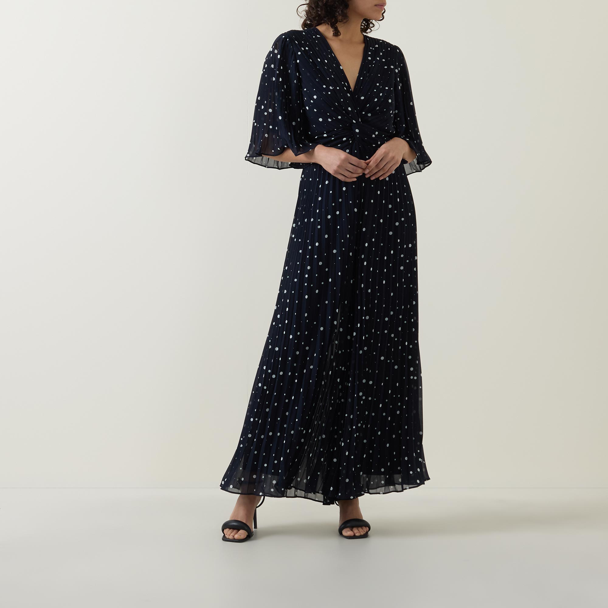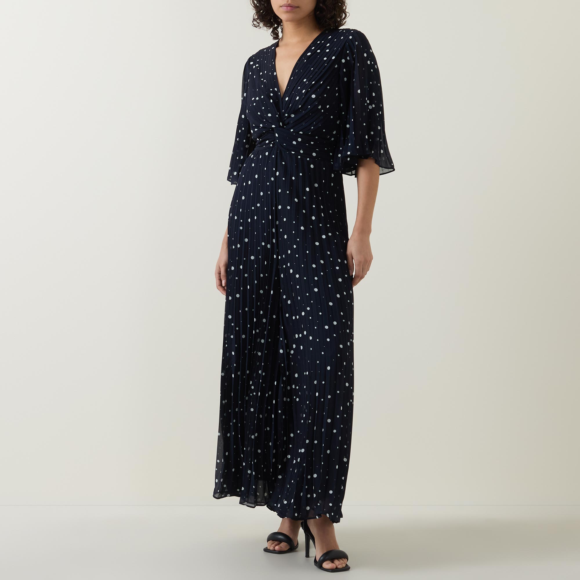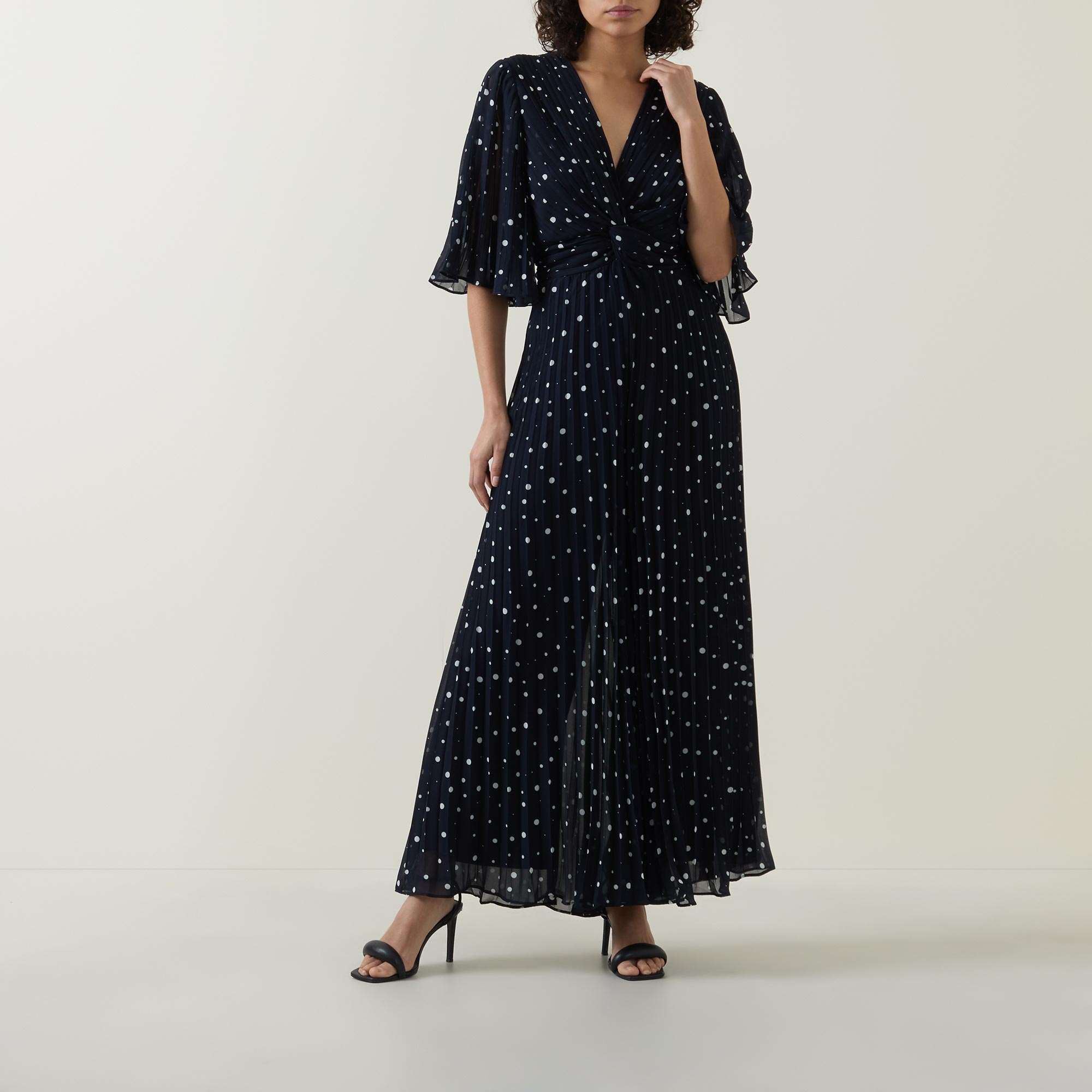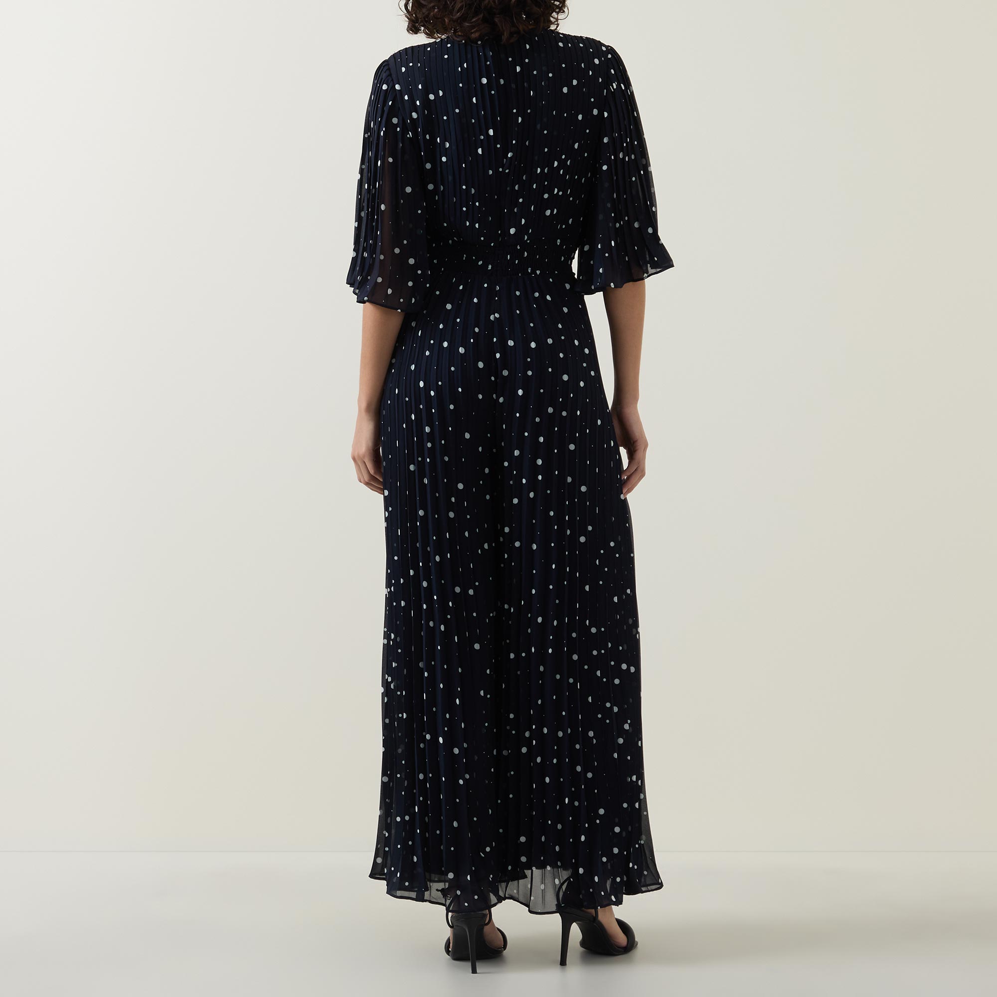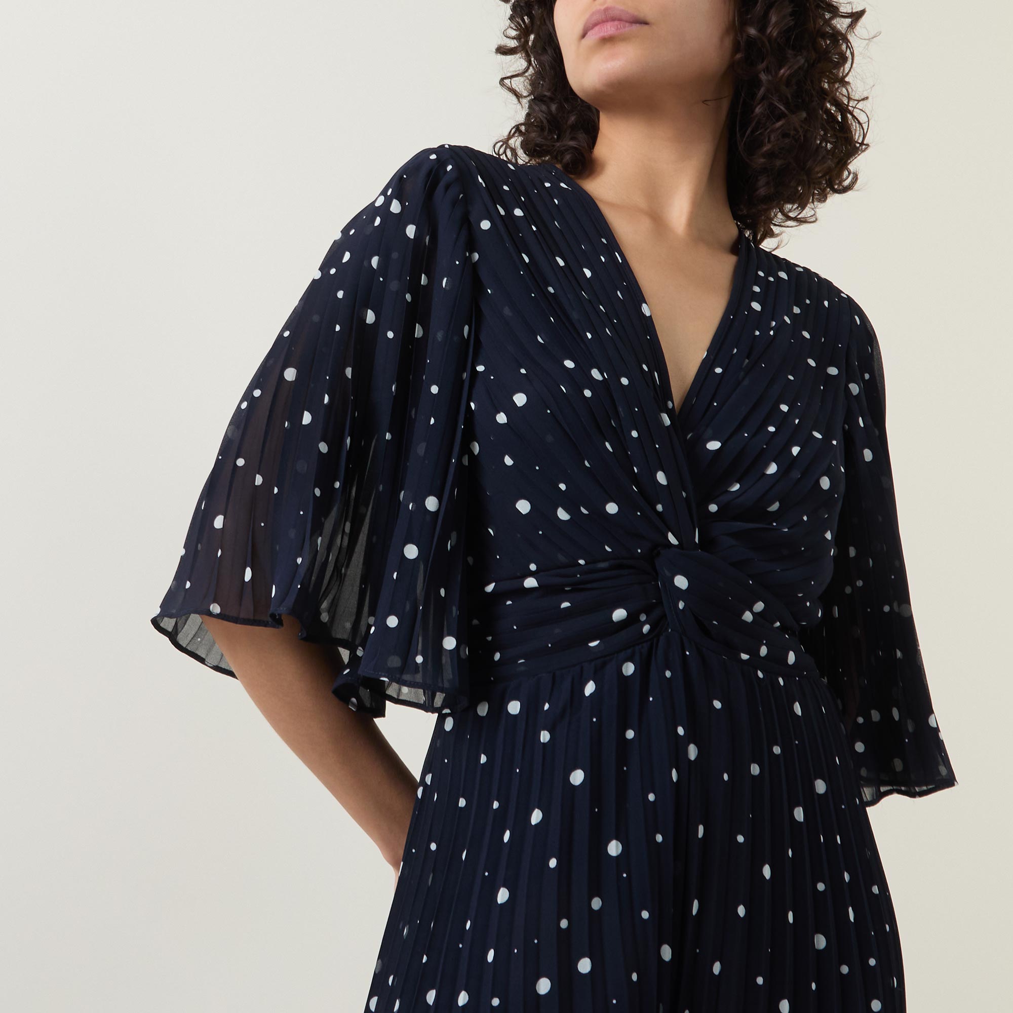 - Mid-length sleeves, V-neckline, twist detail to the front, dotted pattern, wide-cut leg, pleated finish