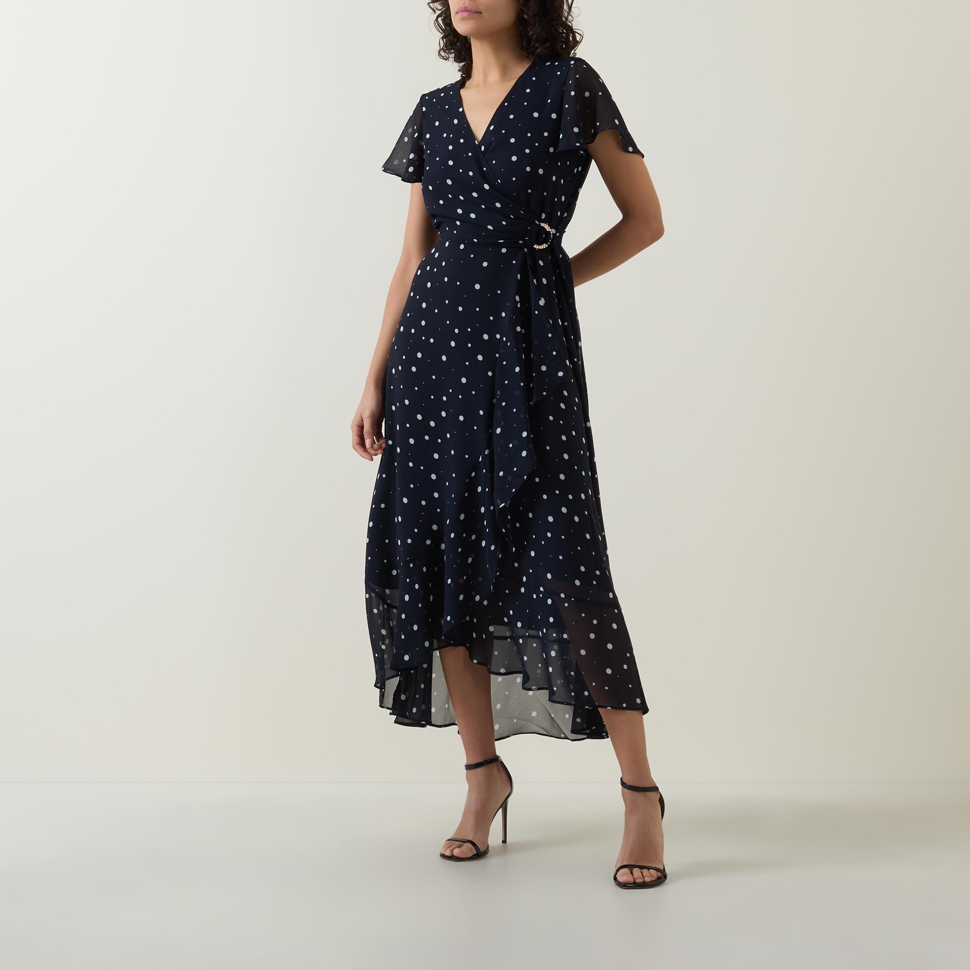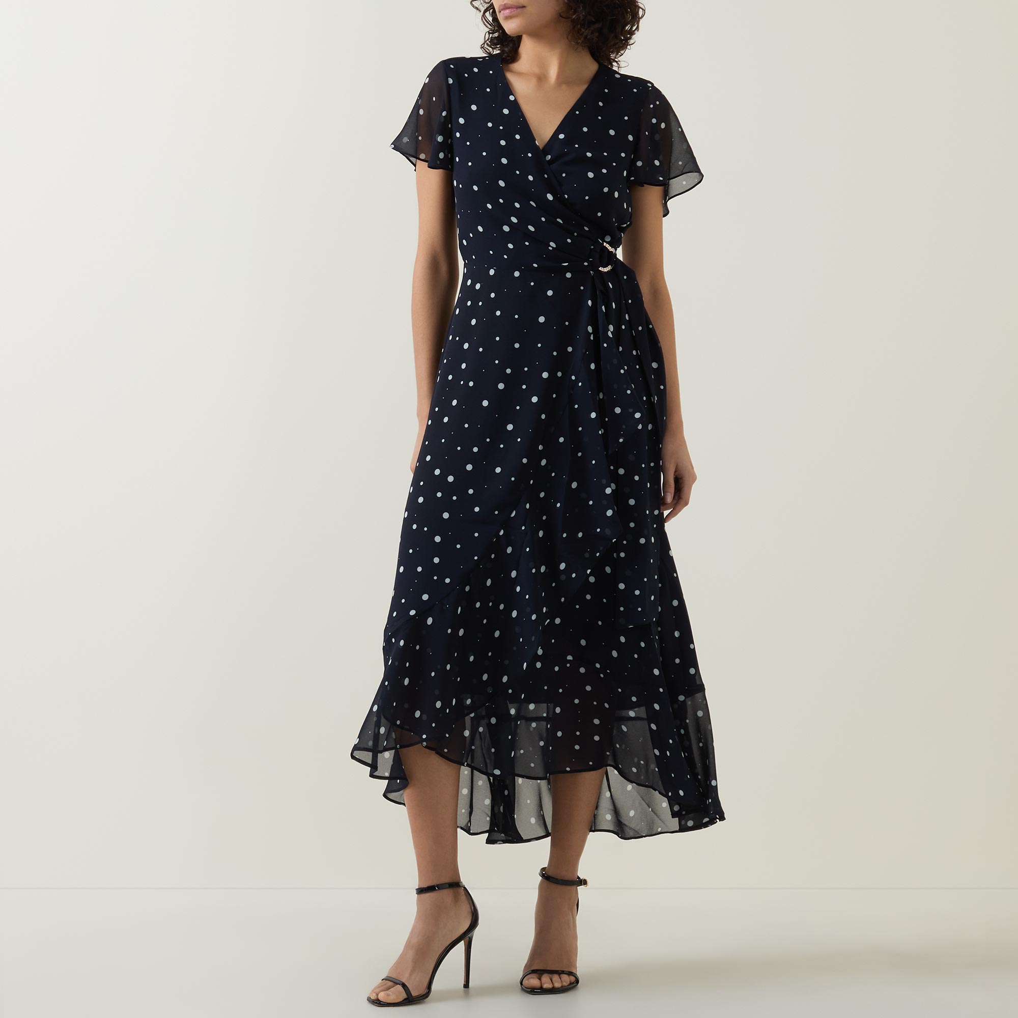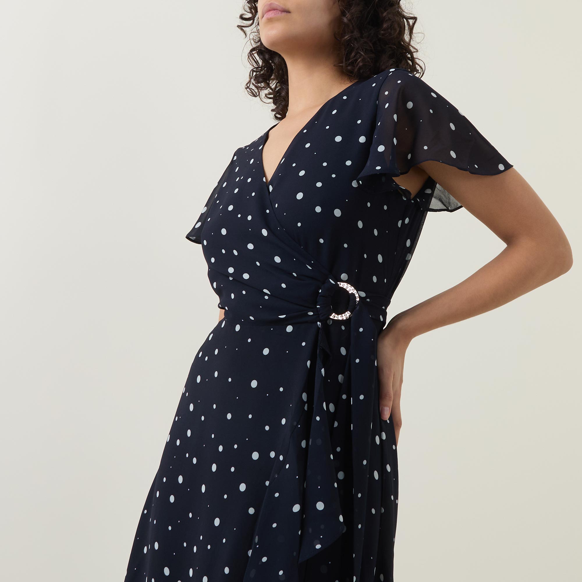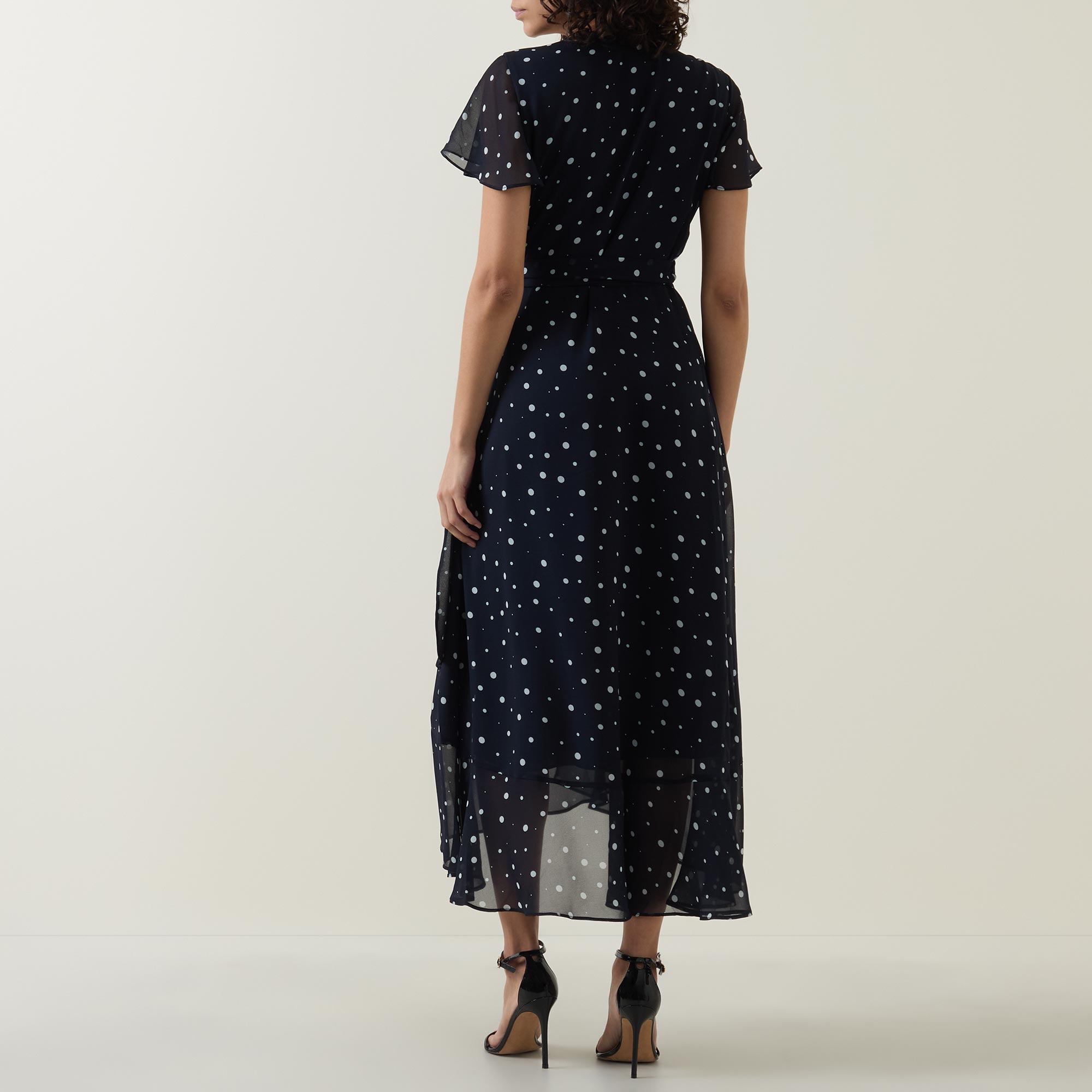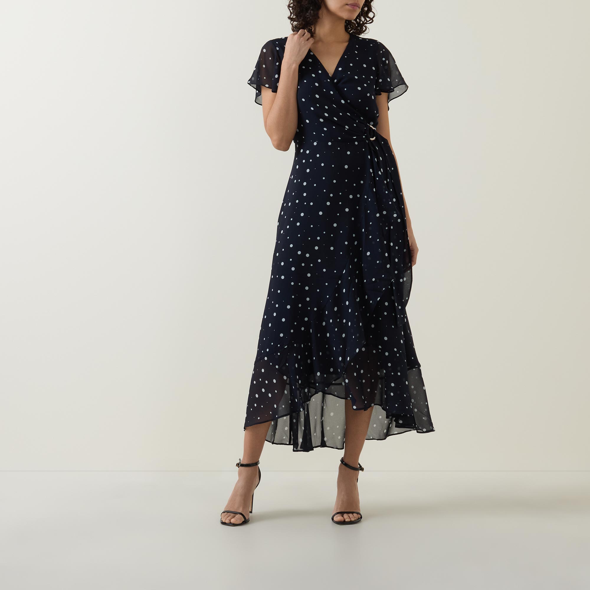 • V-neckline, short flutter sleeves, wrap front, side tie-fastening detail, dotted design, flared silhouette, high-low hemline, midi length, smooth fabric