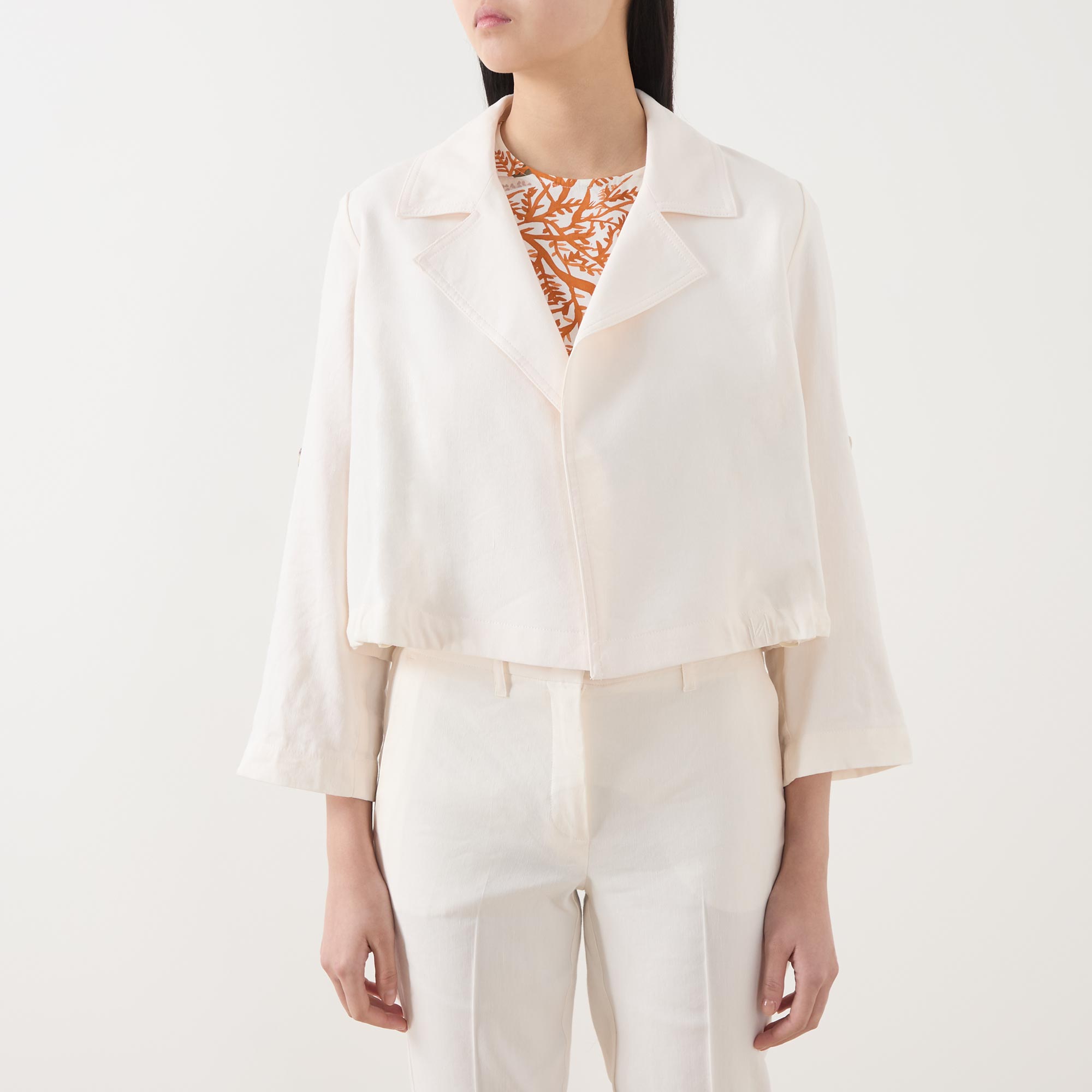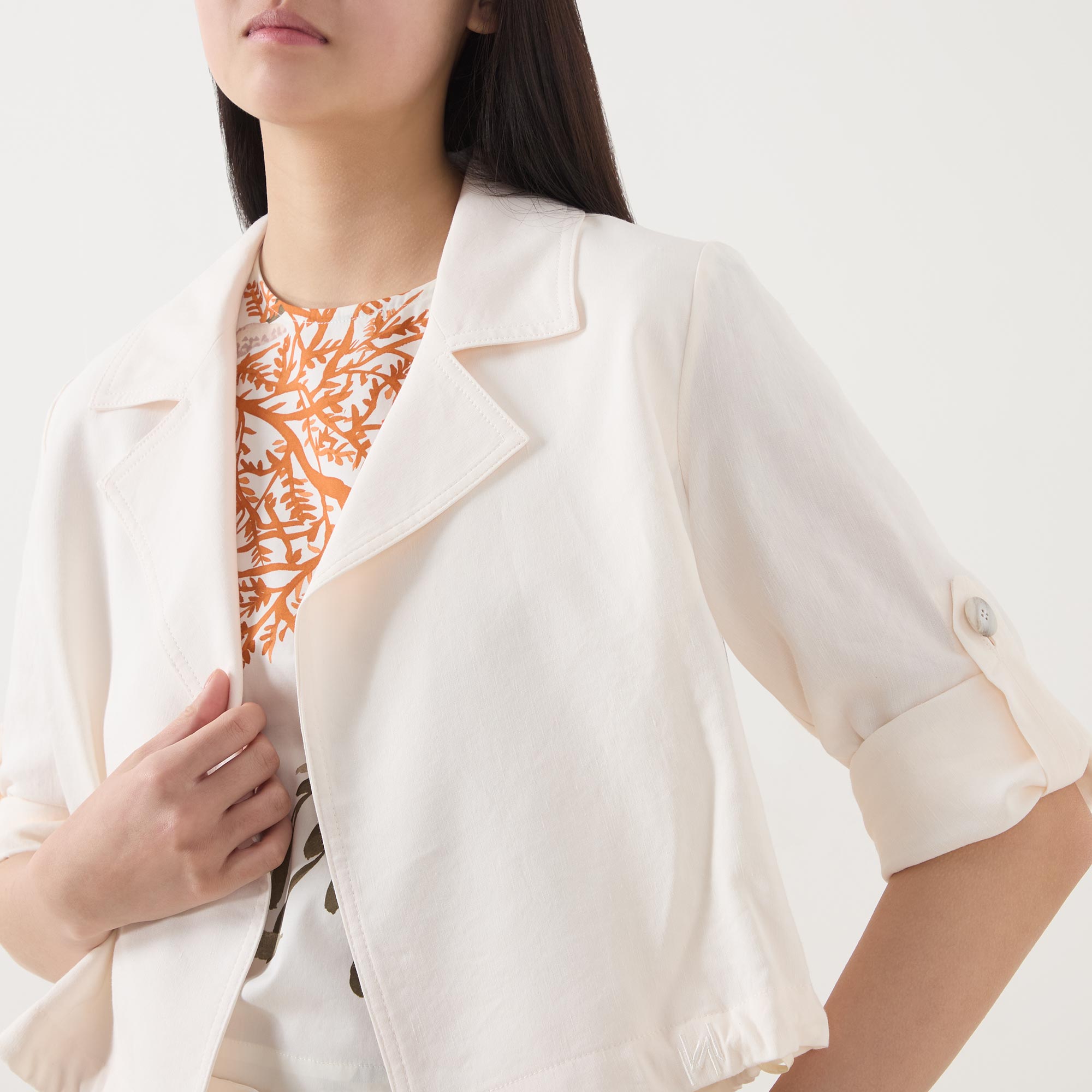 • Three-quarter-length sleeves, open front, notched collar, sleeve button tabs, boxy silhouette