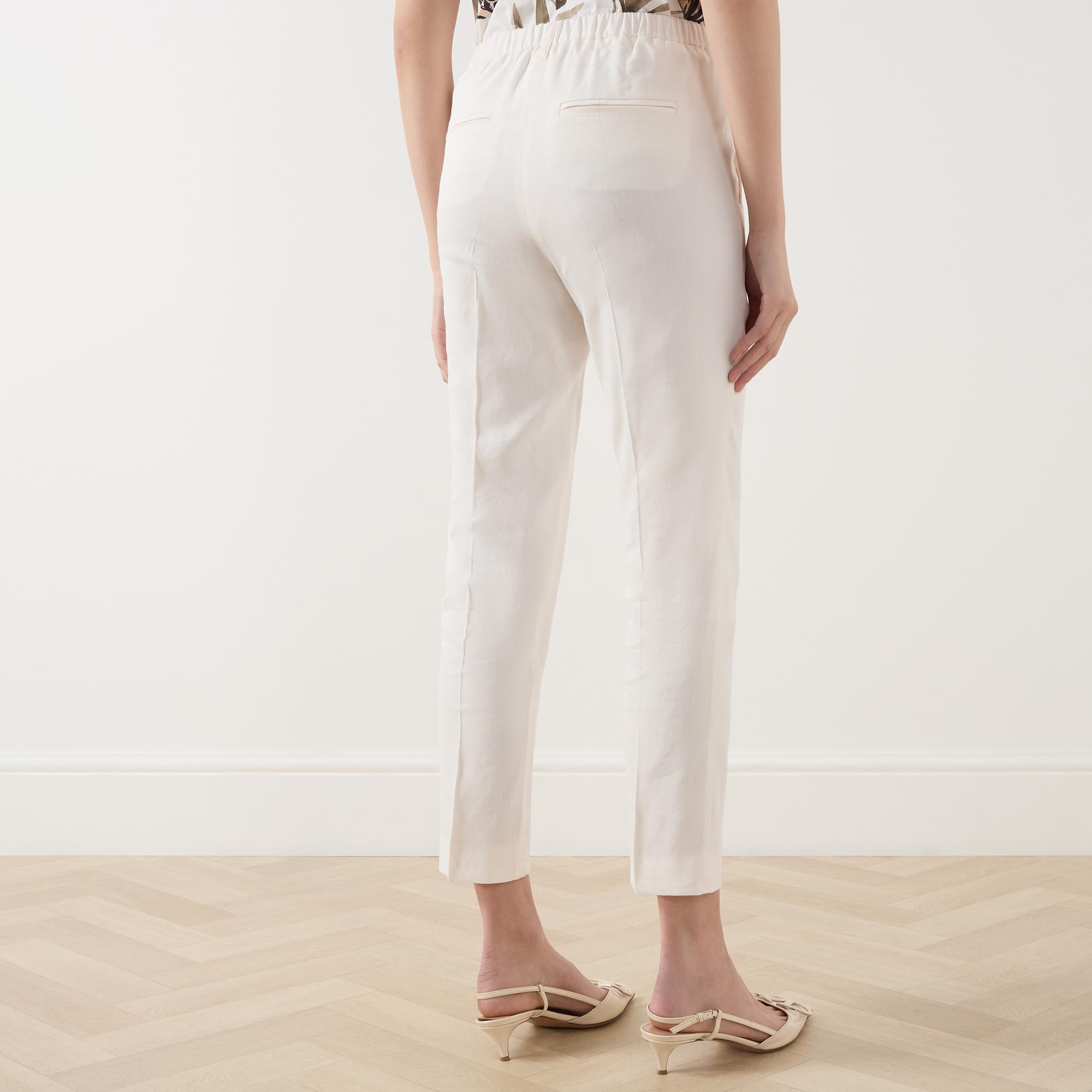 - Belt loops, front creases, concealed fly fastening, semi-elasticated waistband, four-pocket style, straight-leg silhouette