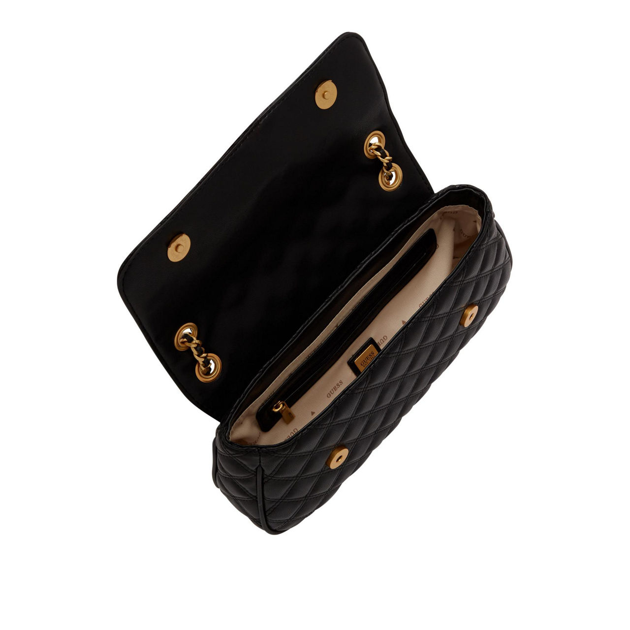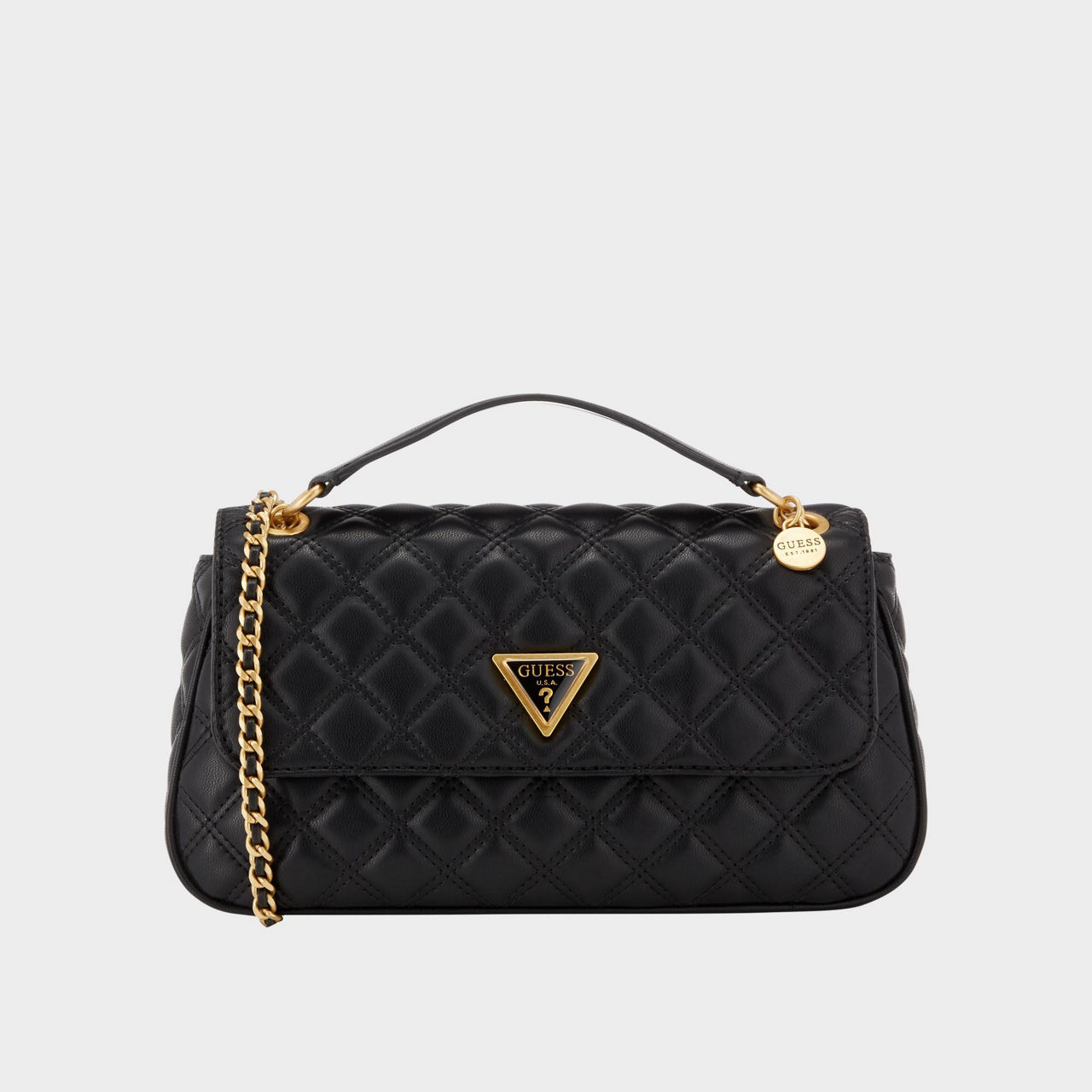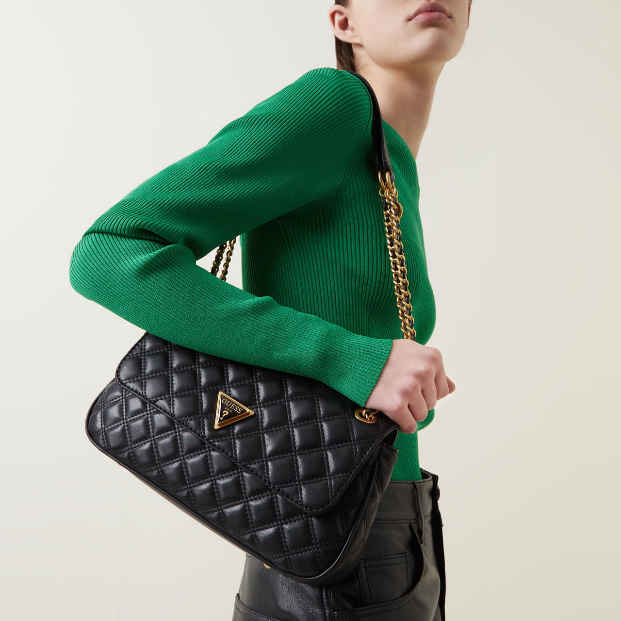 • Quilted, flap closure, logo detail, top handle, shoulder strap, magnetic fastenings