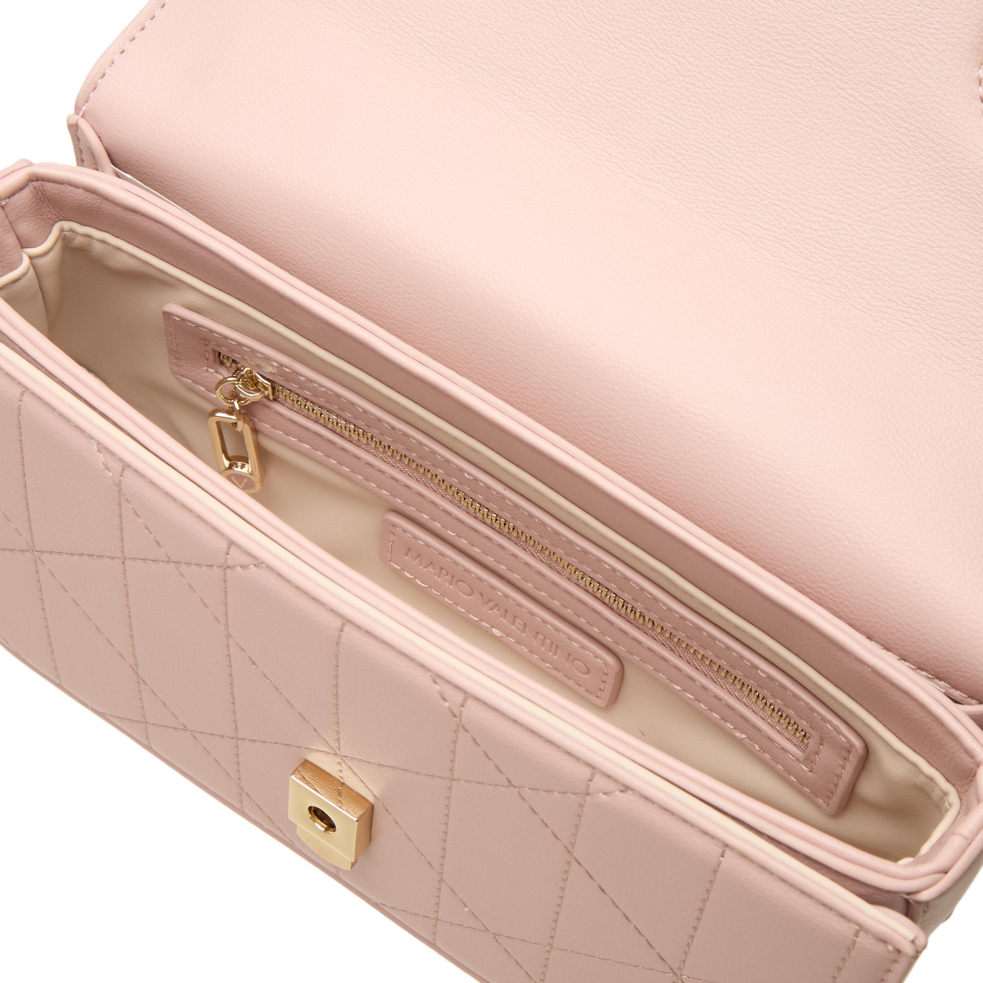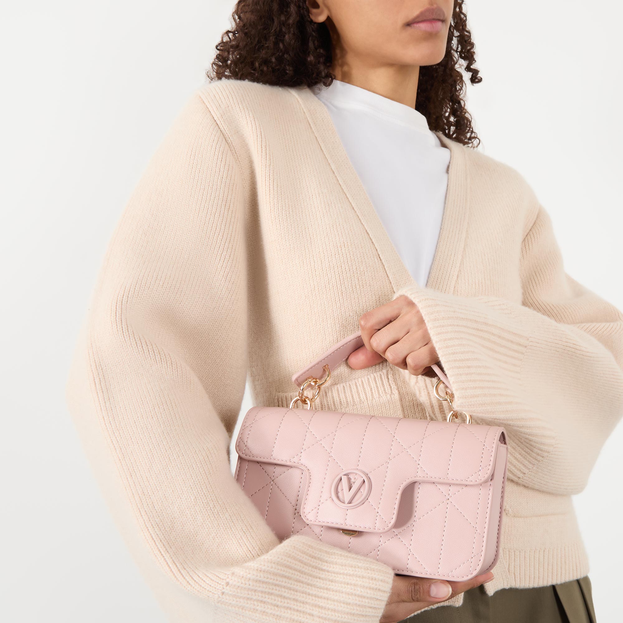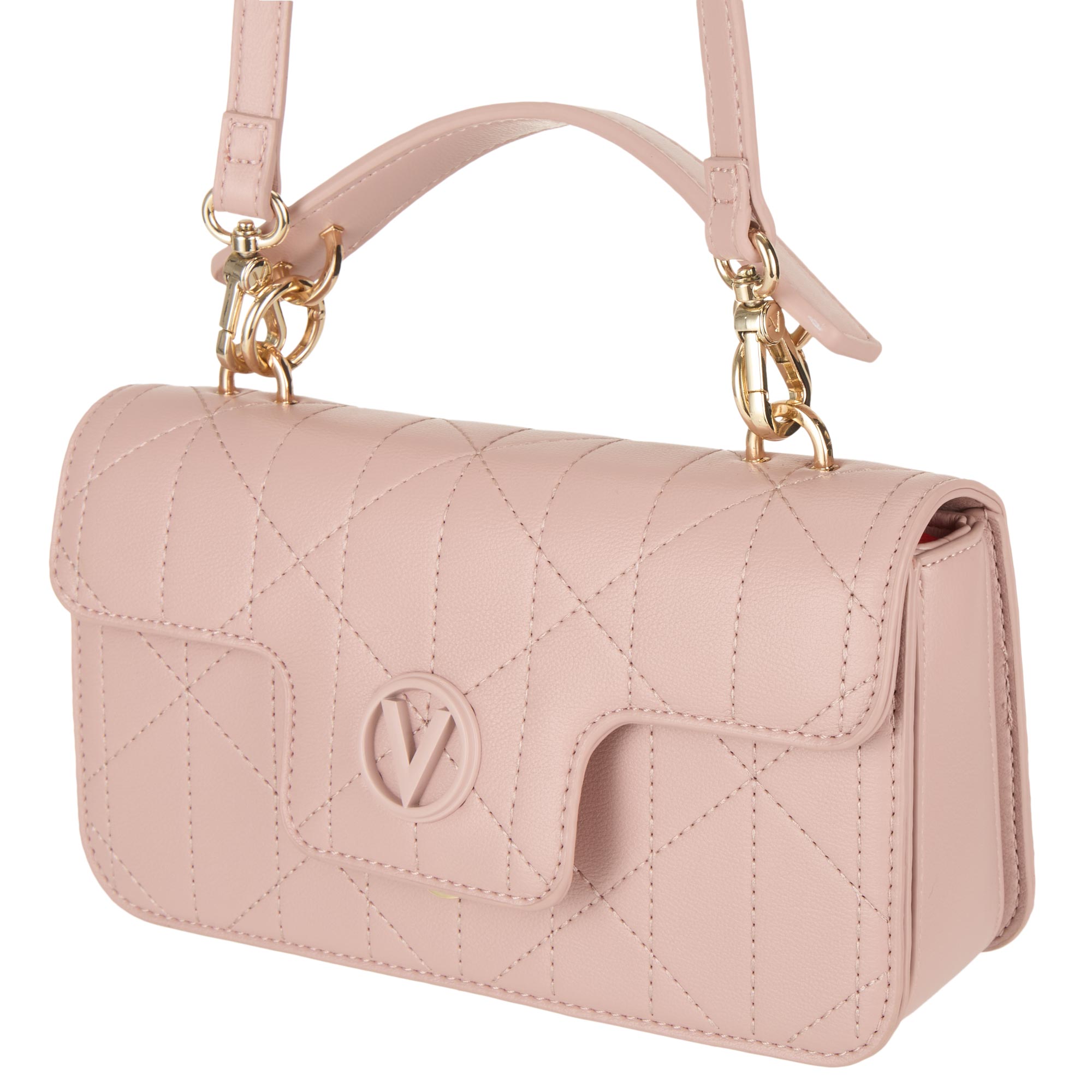 - Top carry handle, detachable adjustable crossbody strap, foldover flap closure with clasp closure, tonal V logo hardware, tonal stitching, grained finish