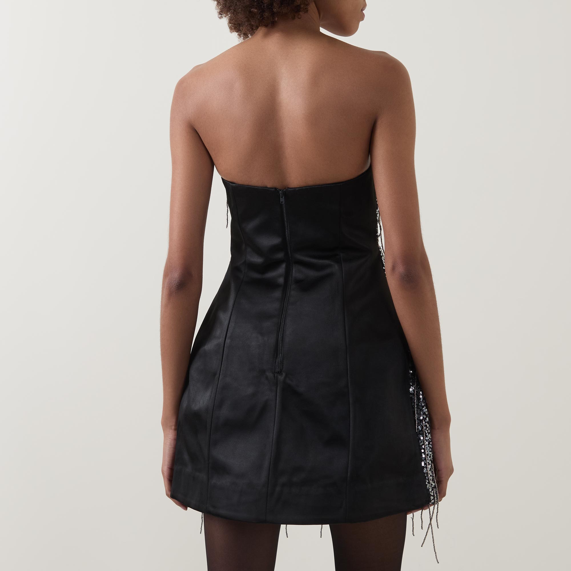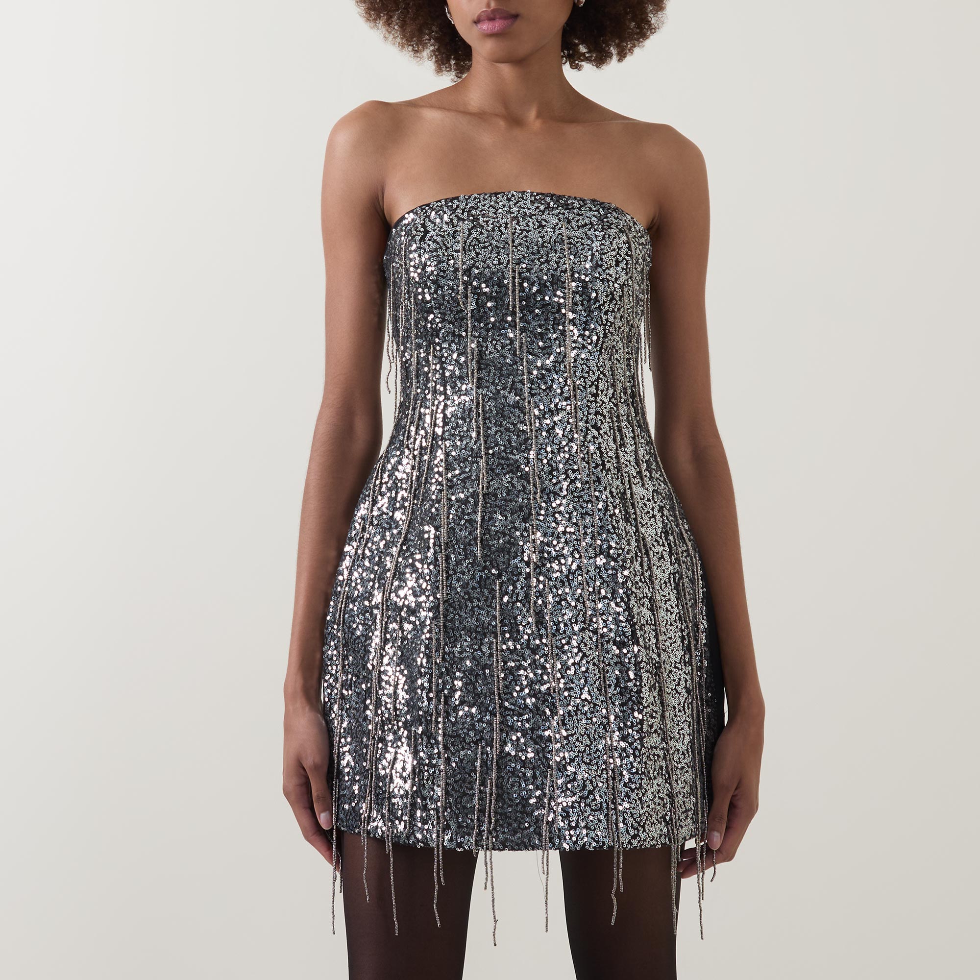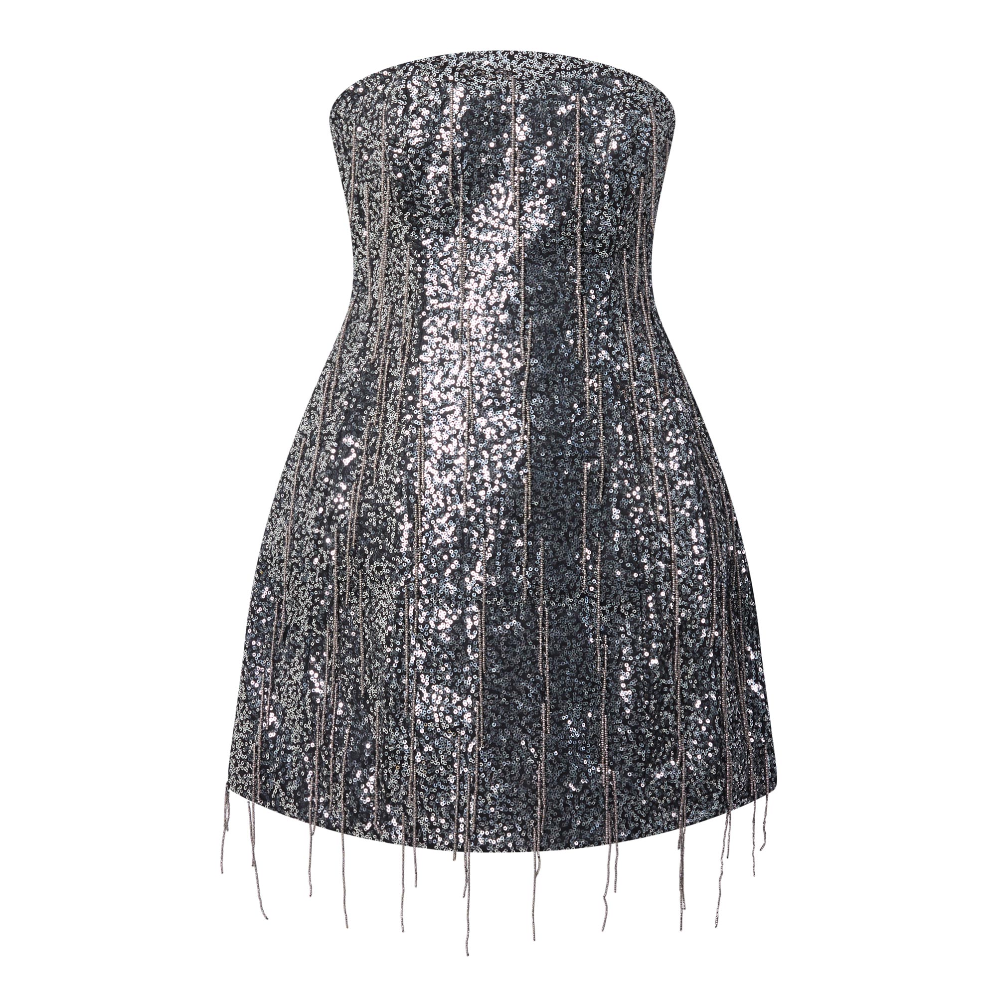 - Straight neckline, off the shoulder design, rear zip fastening, hourglass silhouette, curved hem, sequin embellished front with tassel detailing, satin back, mini length
