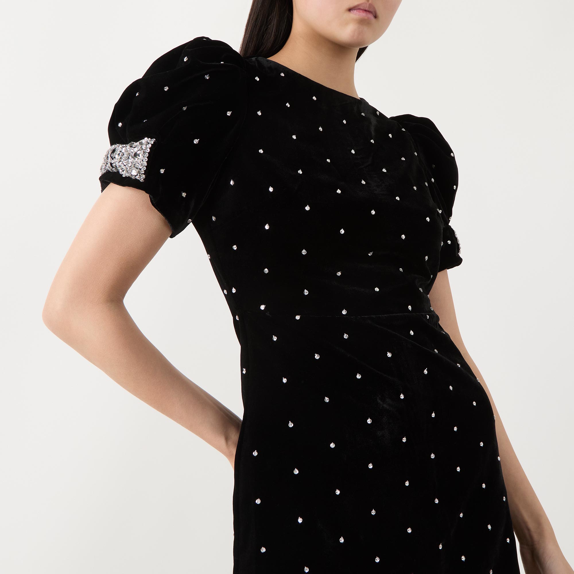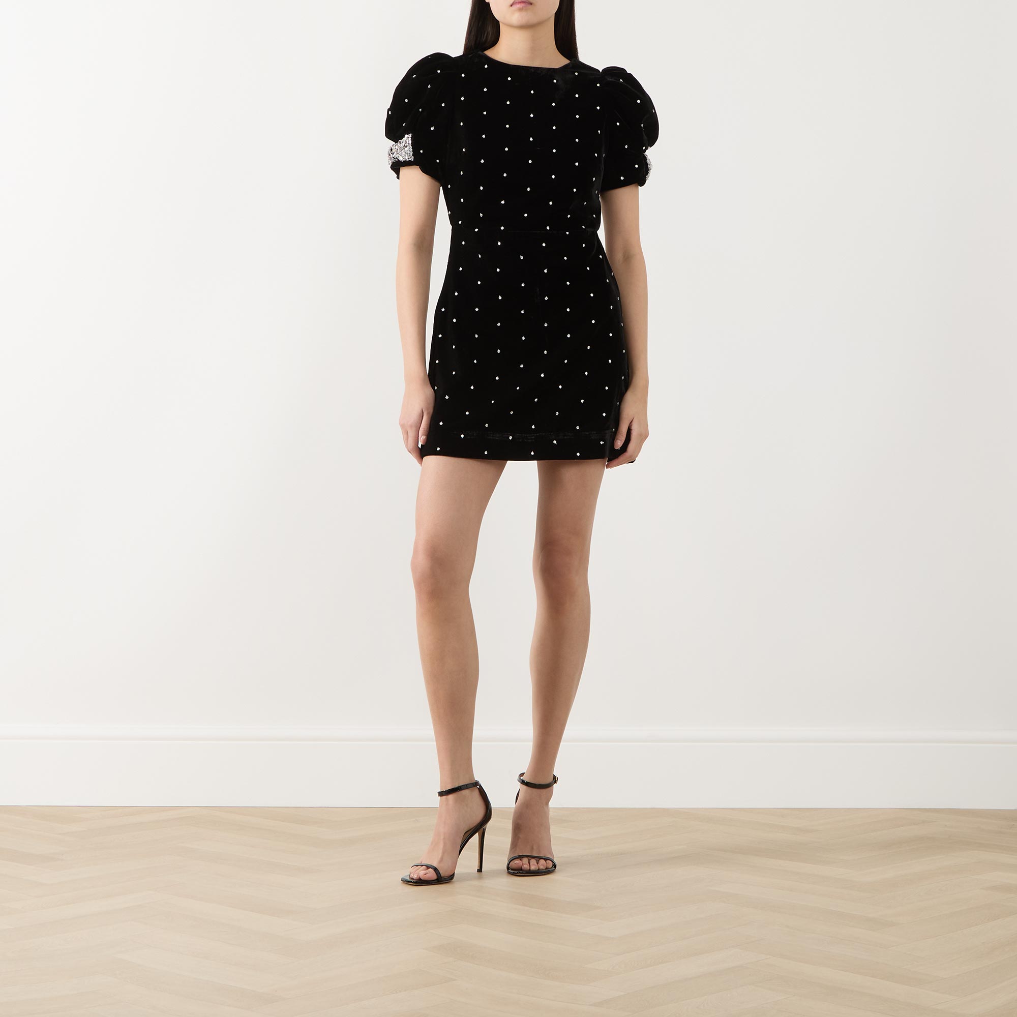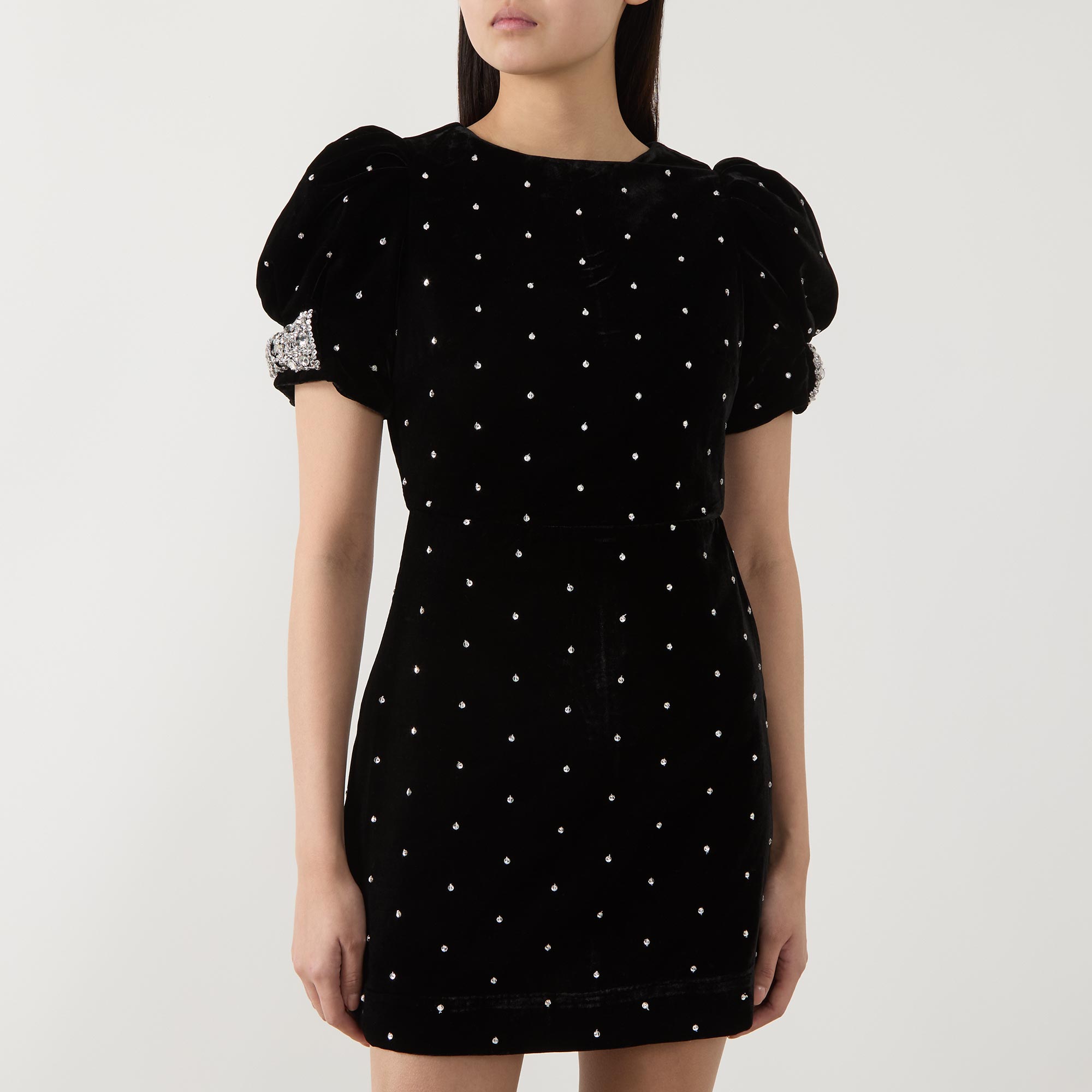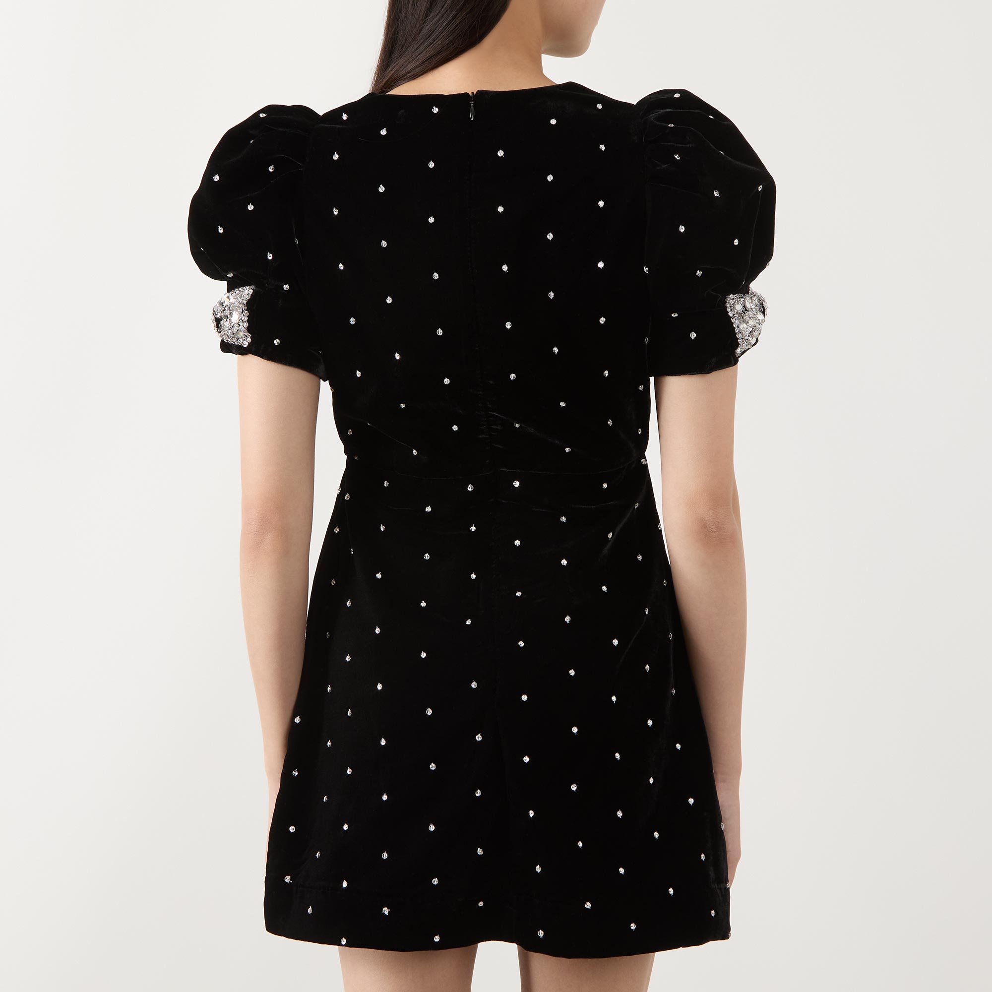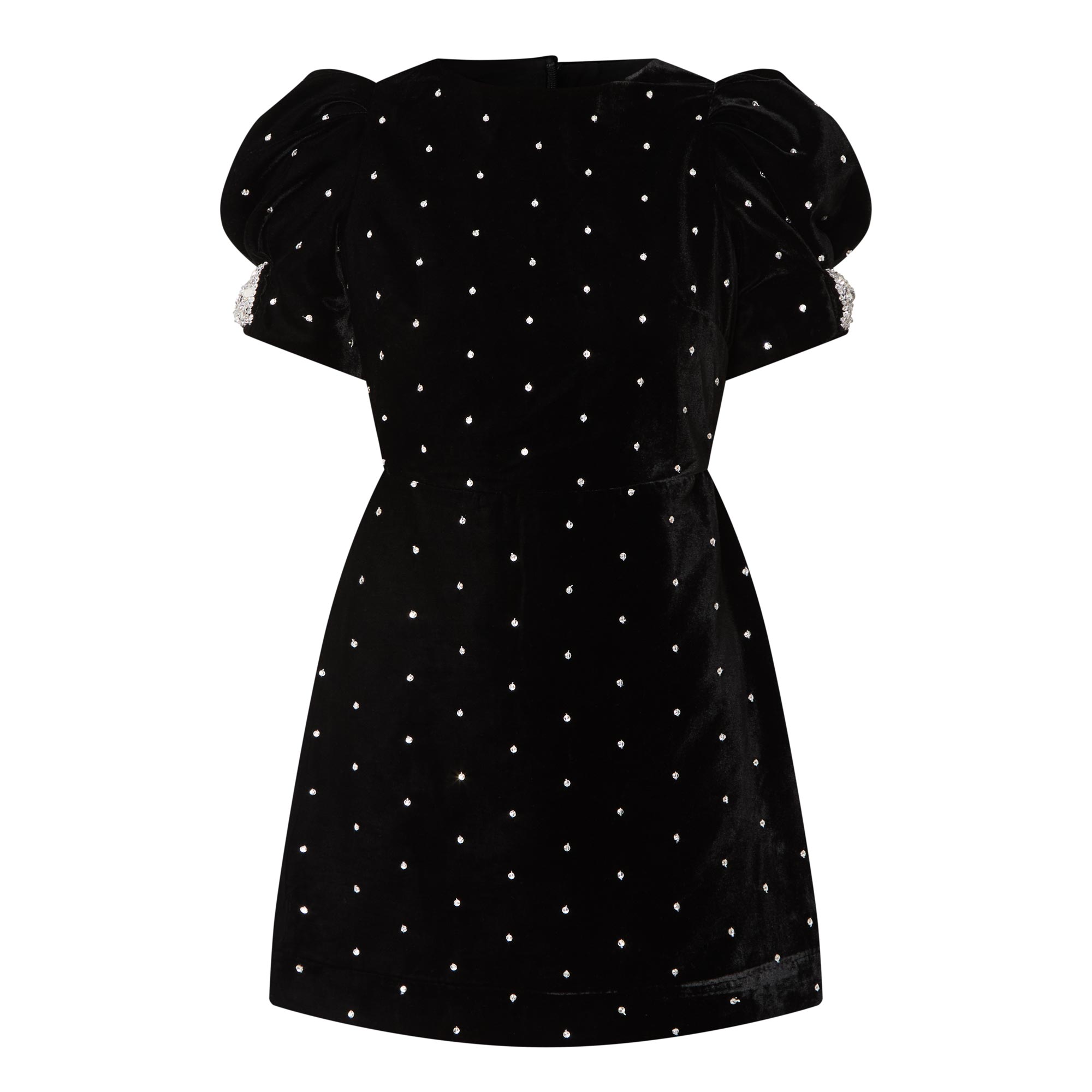 • Dotted, velvet design, short sleeves, mini length, bow embellished sleeves, back zip, fully lined