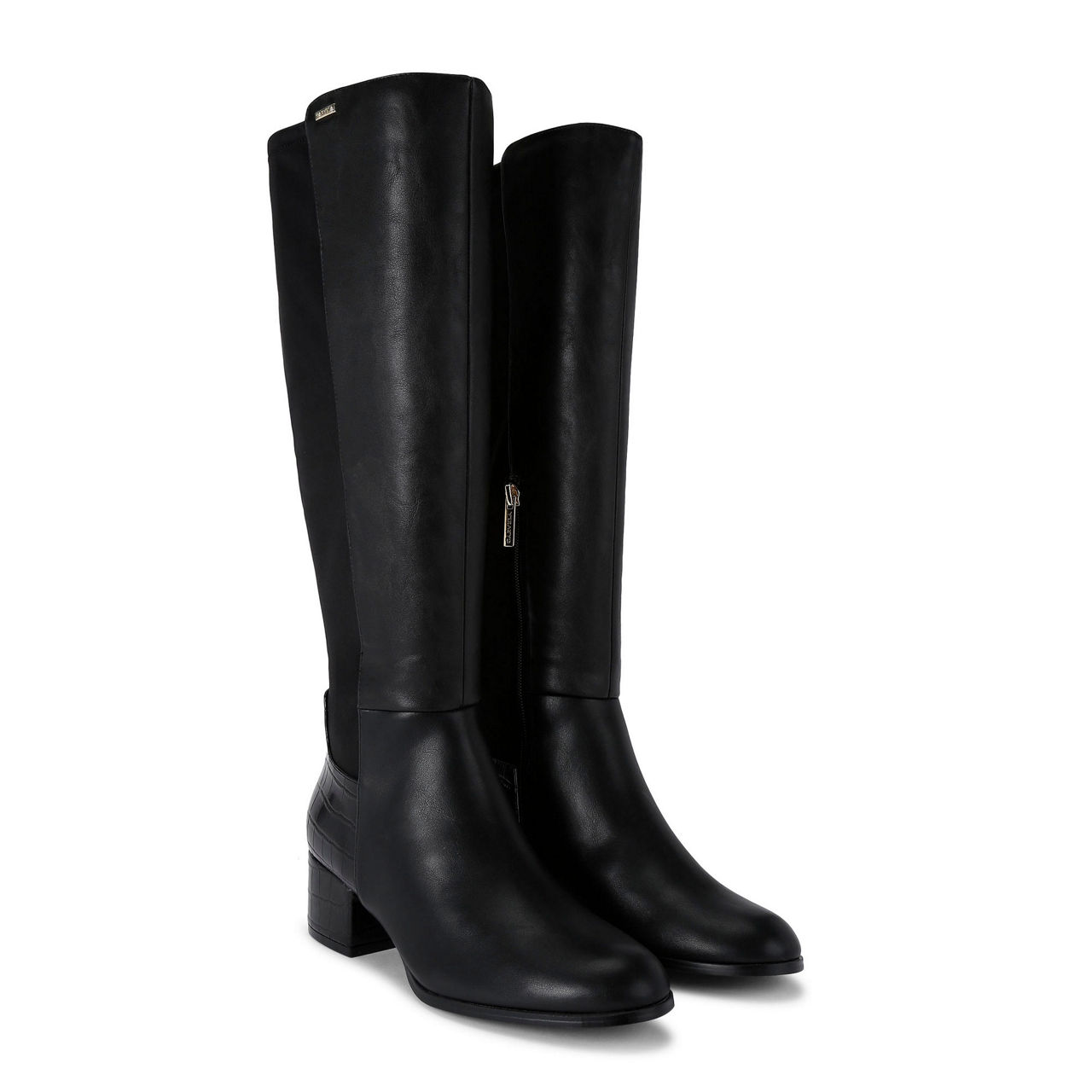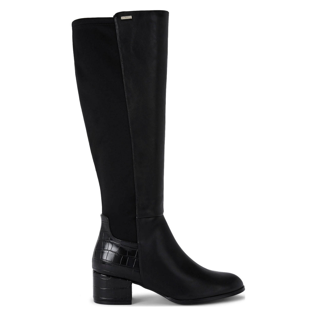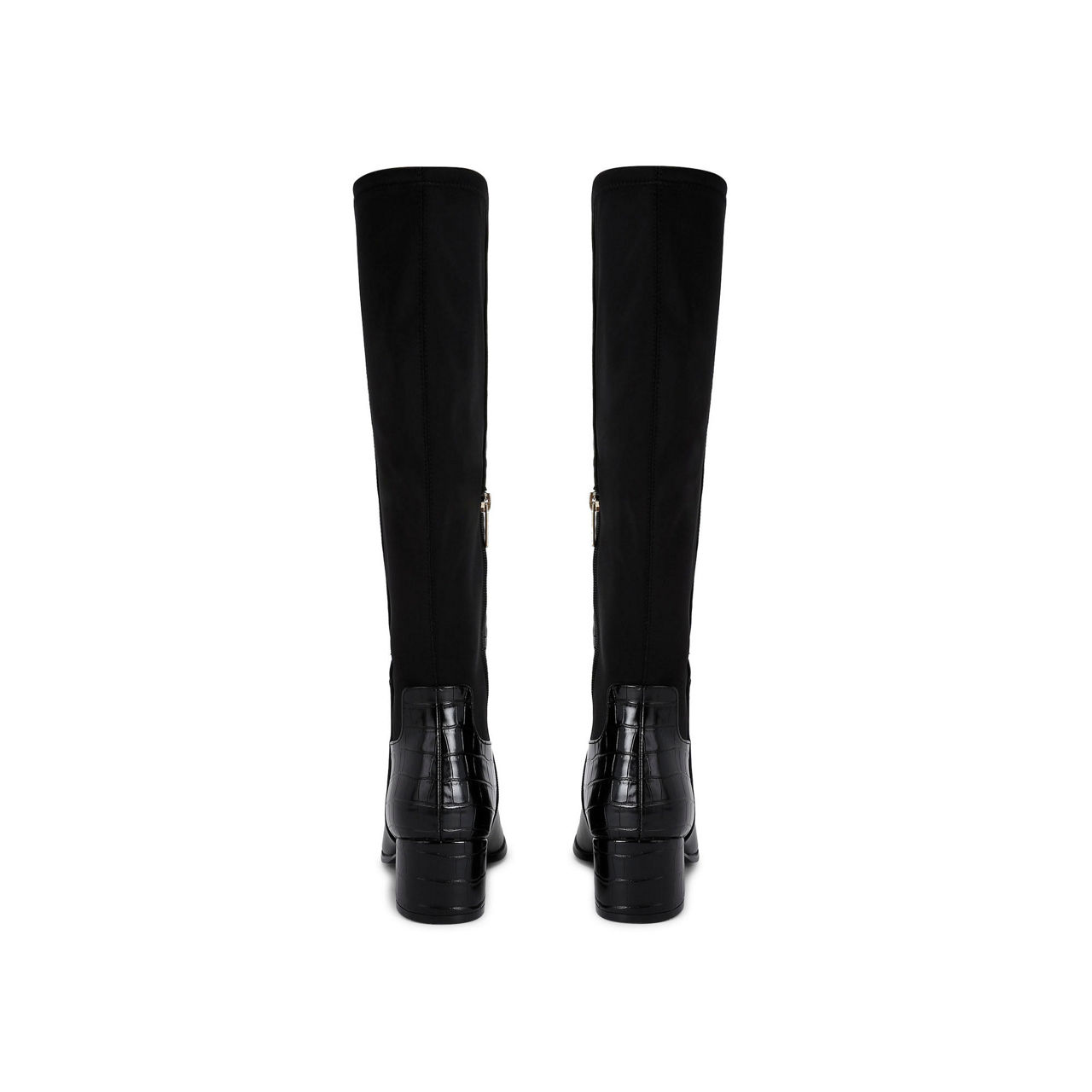 - Round toe, block heel, knee-high, shaped collar, side-zip fastening, elasticated panel at back, faux croc-embossed detailing, logo plate
