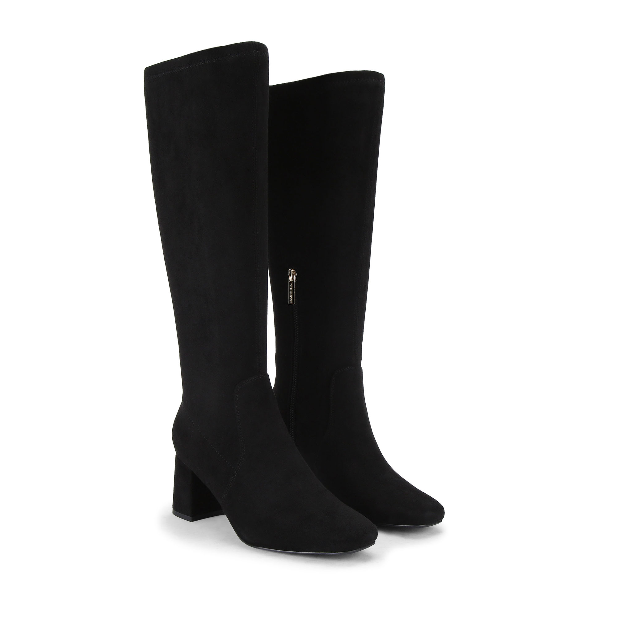 - Knee-high style, microsuede upper, soft shaft, squared toe, block heel