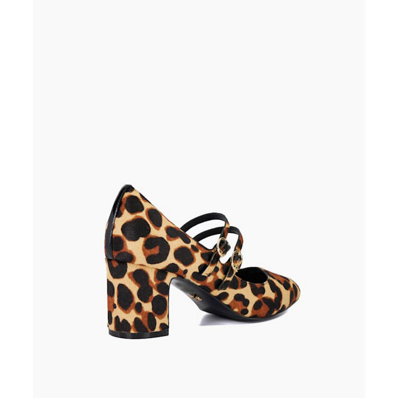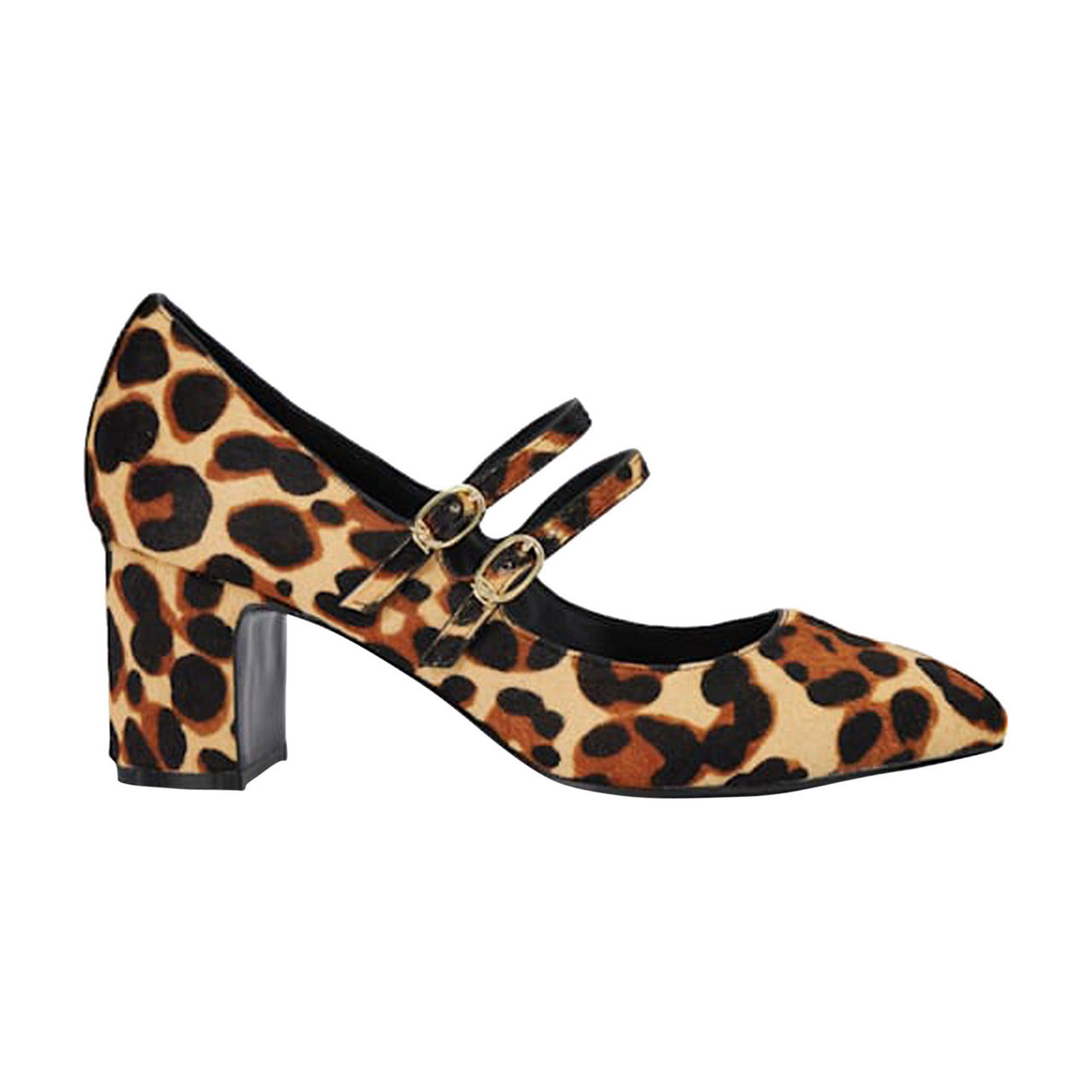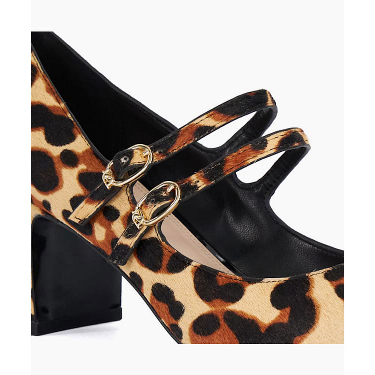 - Double straps, gold-tone buckle fastenings, leopard print, covered block heel, pointed toe