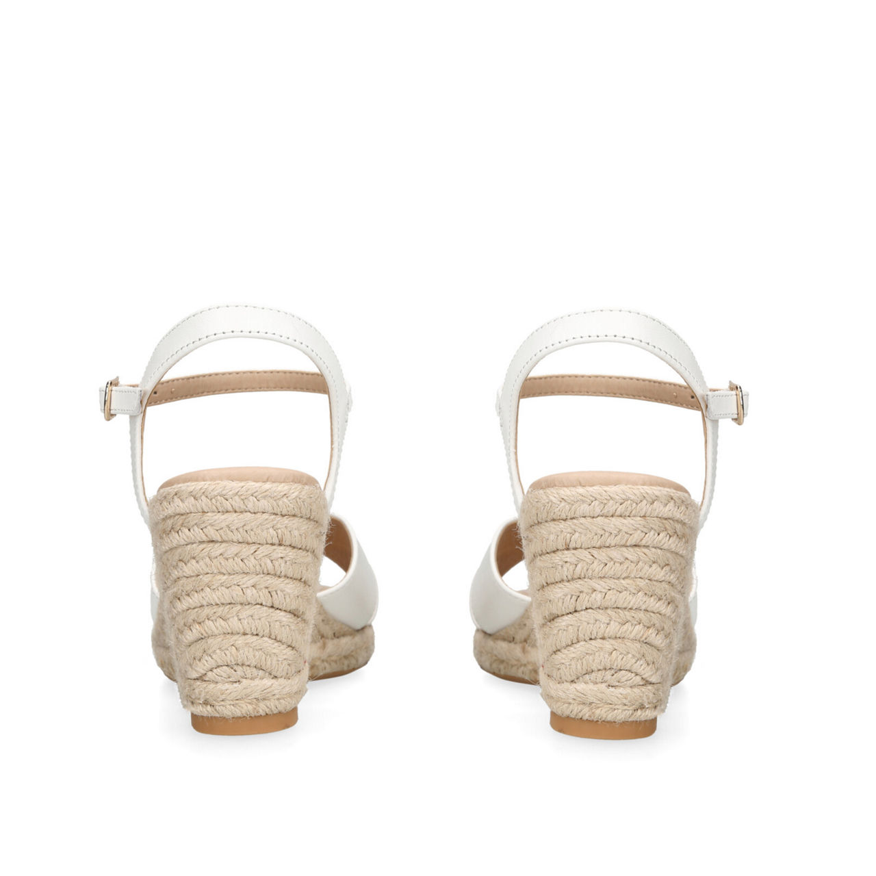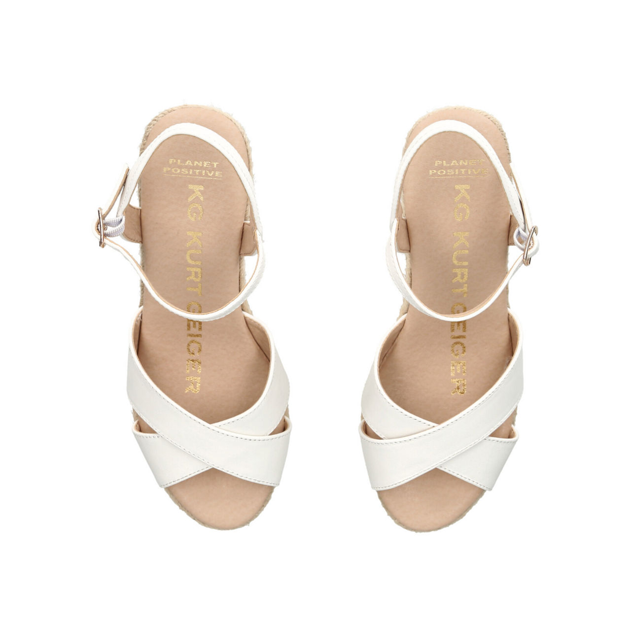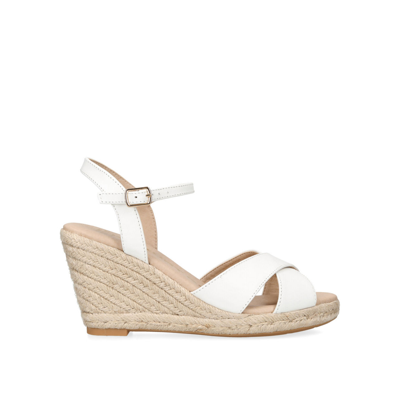 - Rope wedge, open toe, criss-cross strap, ankle strap, gold-tone buckle, padded footbed