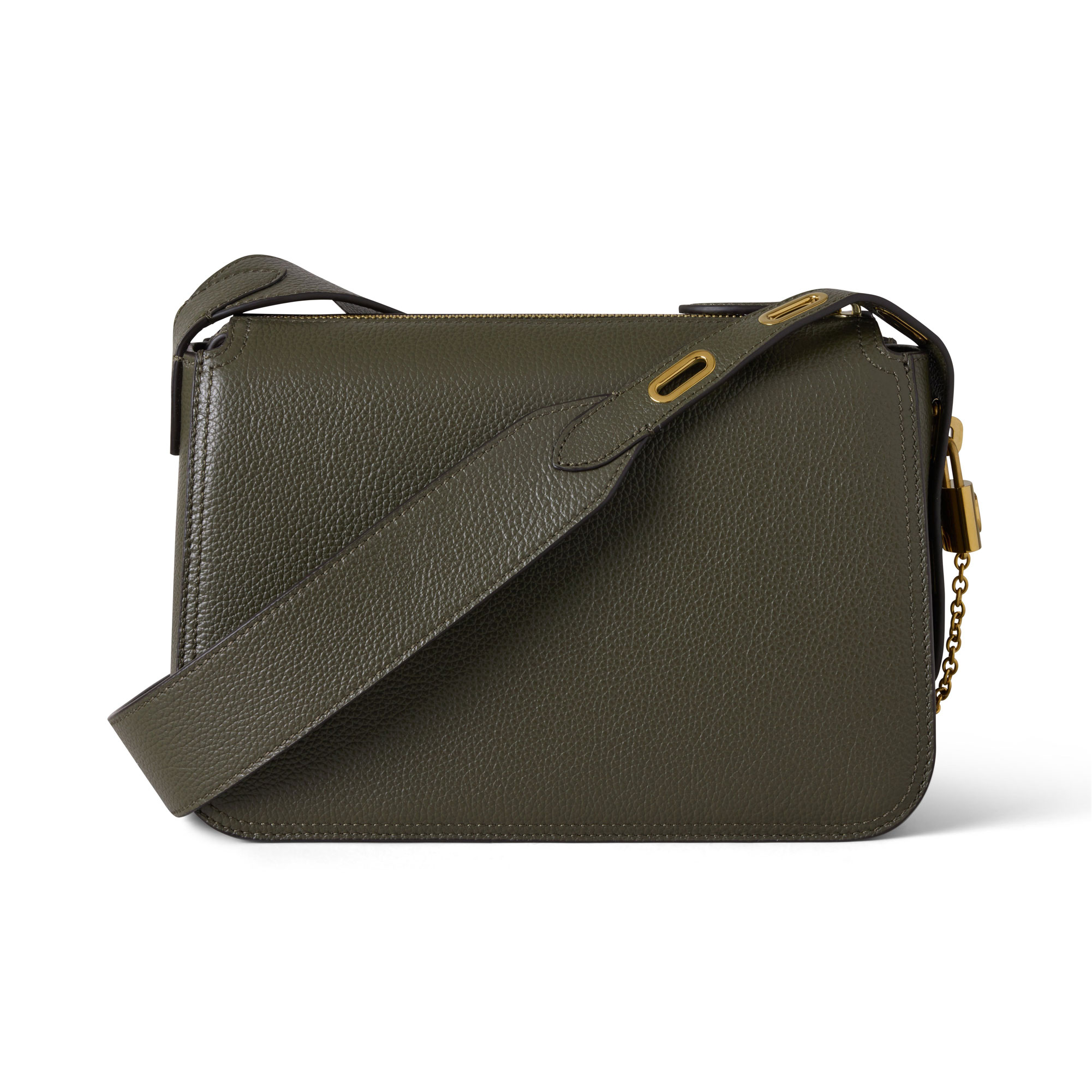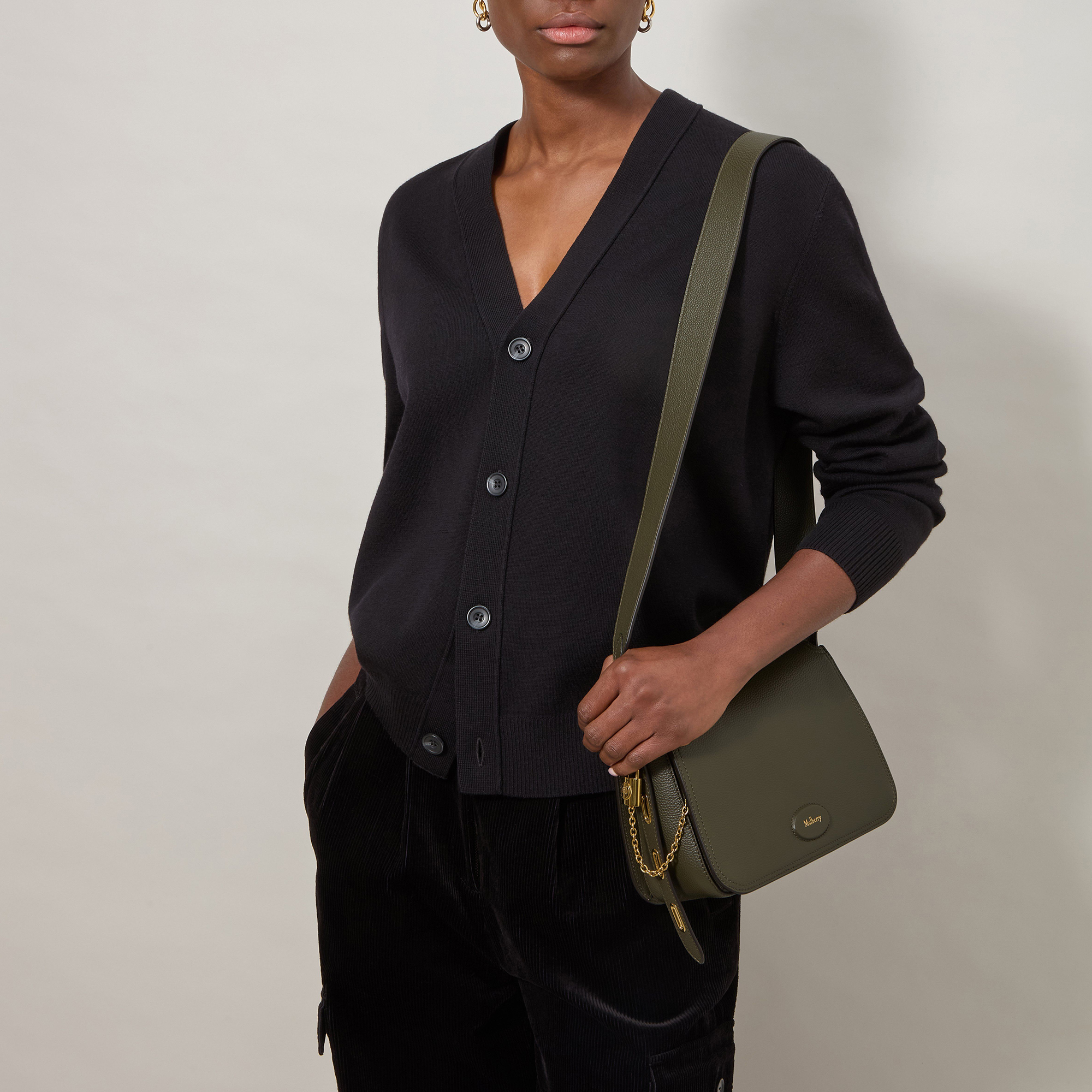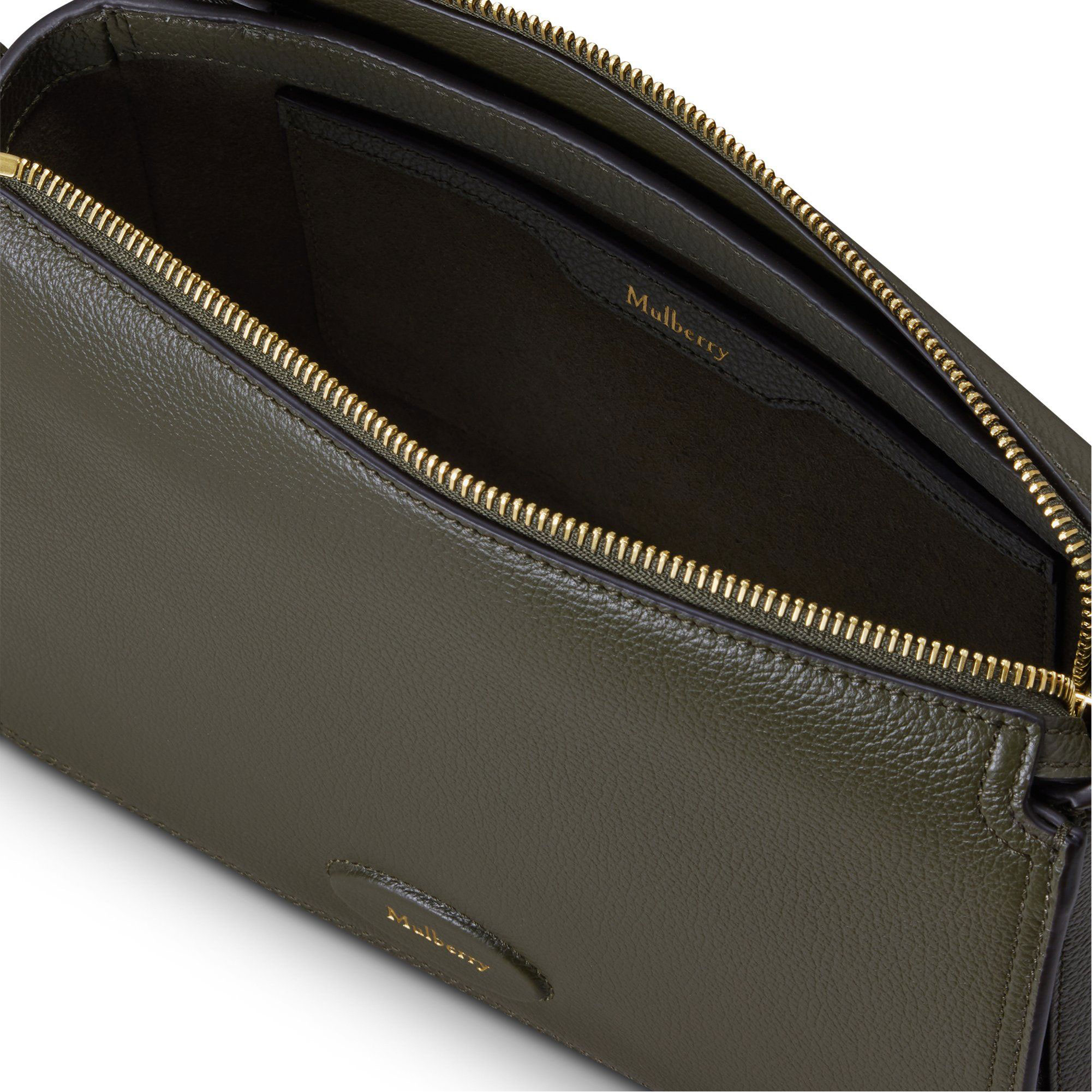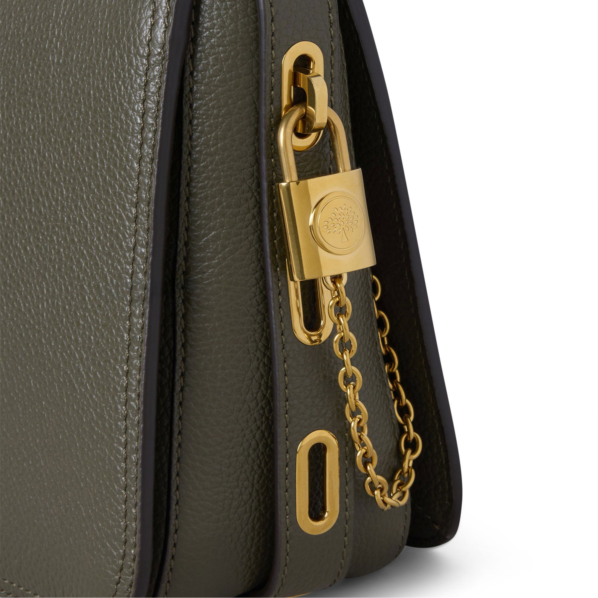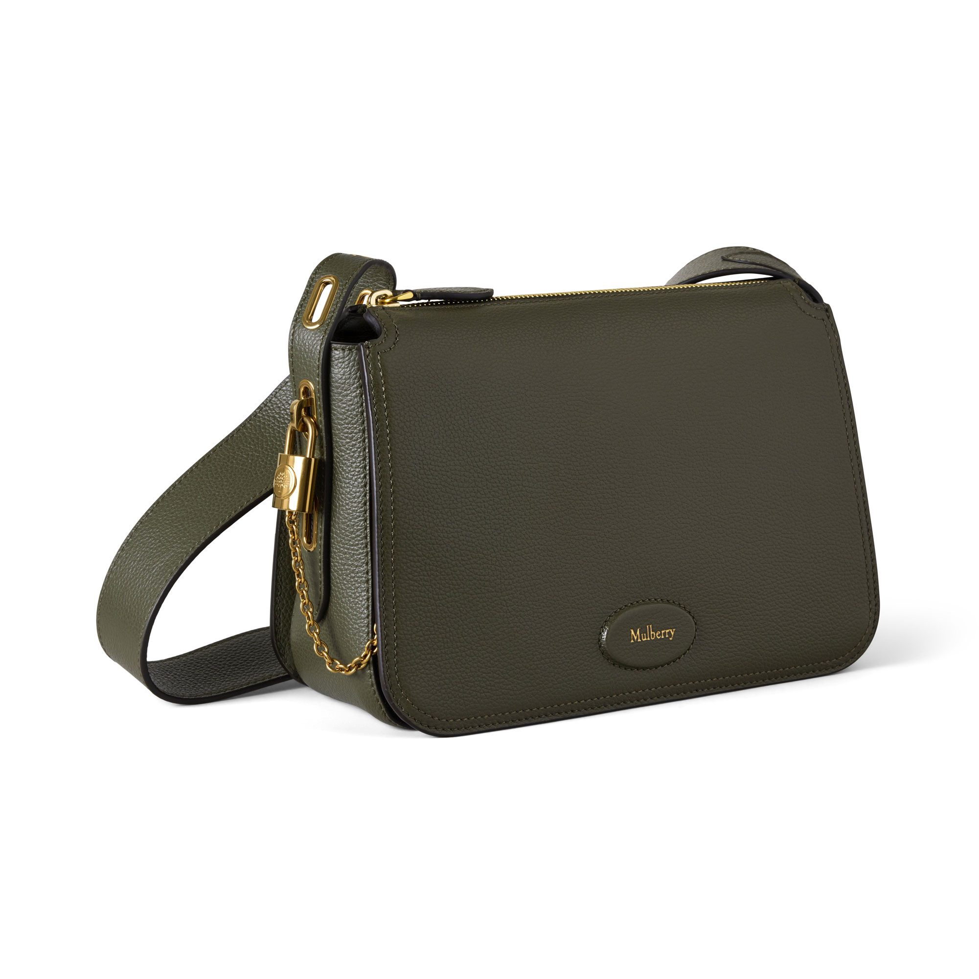 - Padlock signature with chain detail, softly slouched structure, zip closure, adjustable leather shoulder strap for crossbody wear, leather patch with foil-embossed Mulberry signature, brass hardware finish