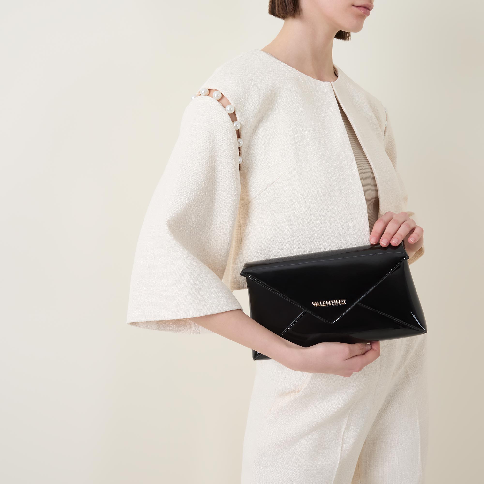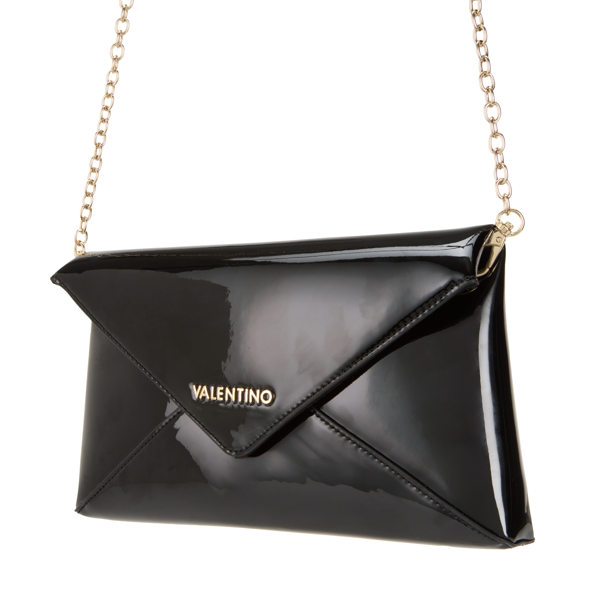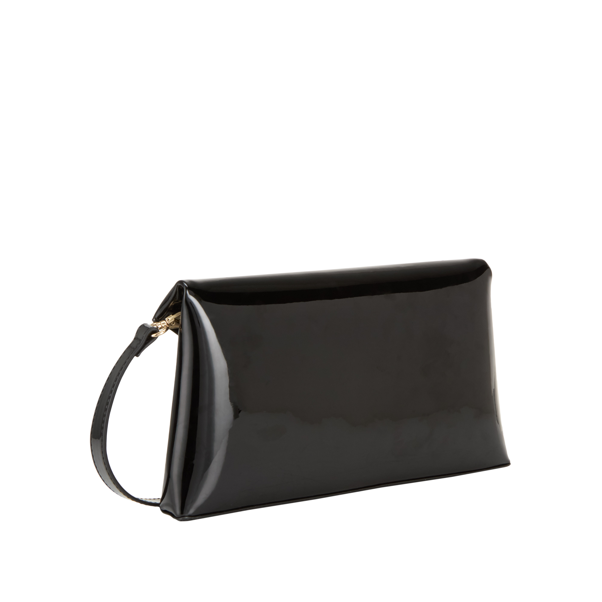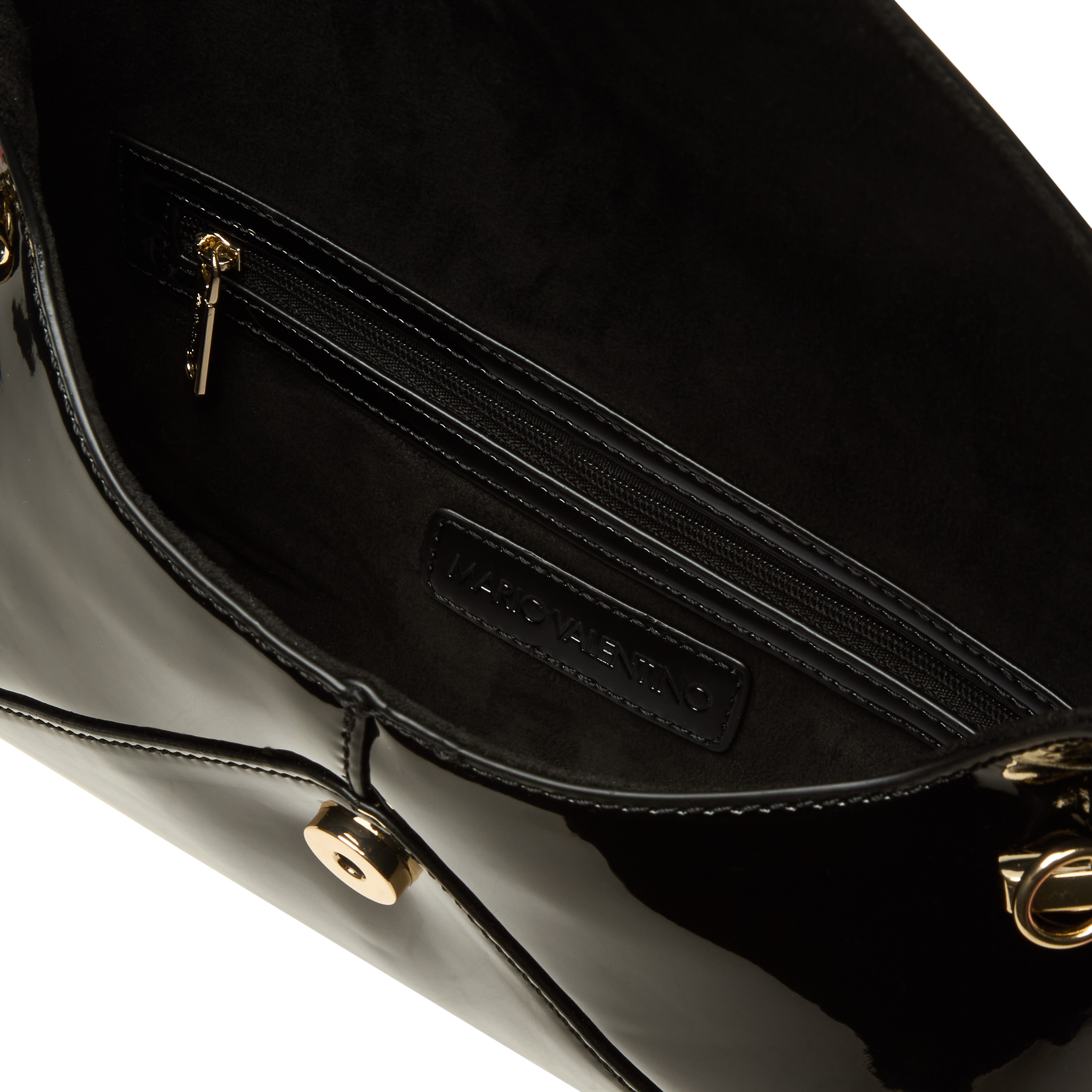 • Flap closure with magnetic snap fastening, detachable chain strap, detachable faux leather strap, logo lettering, gold-tone hardware, patent finish