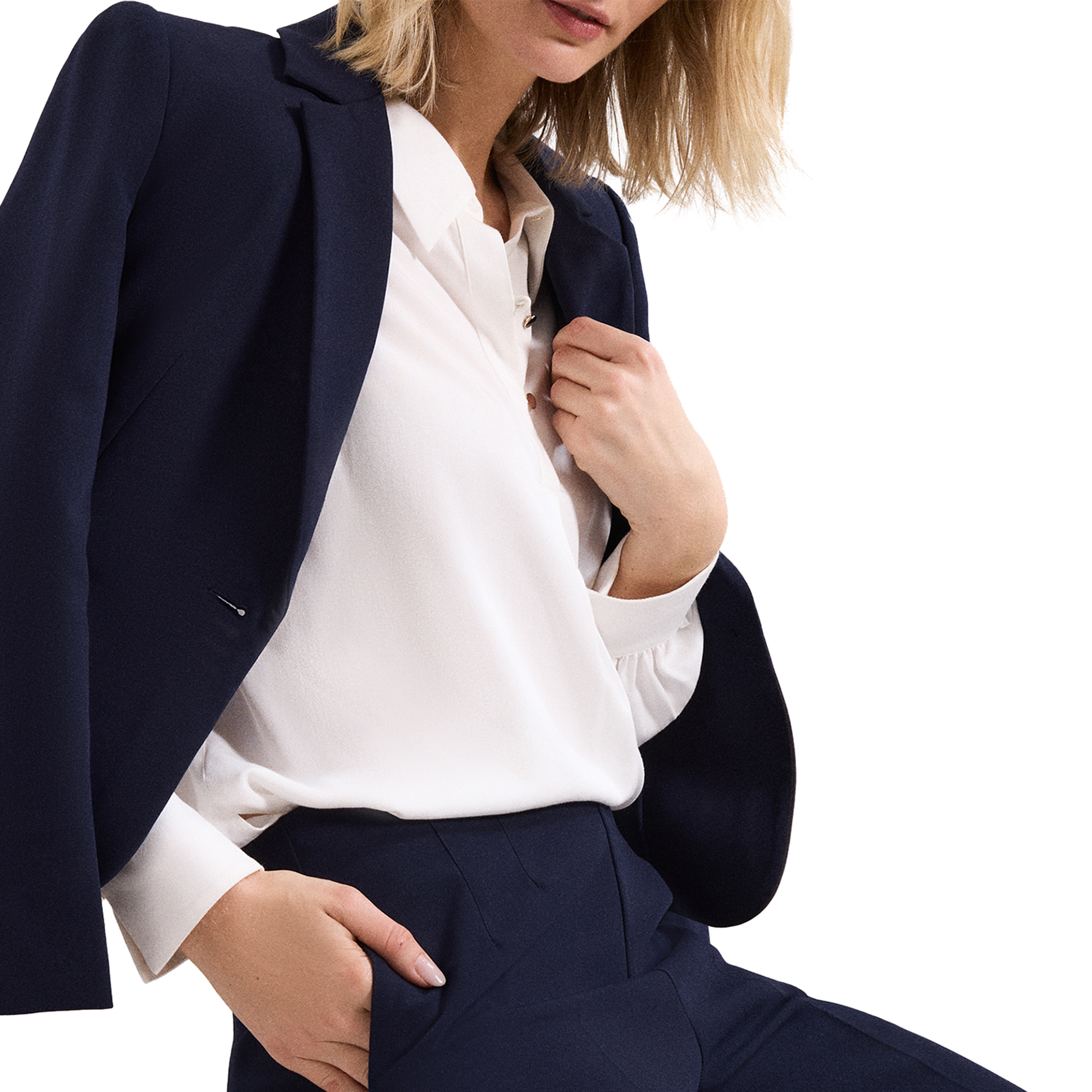- Composition and Care: 72% polyester, 22% viscose, 6% elastane. Delicate machine wash