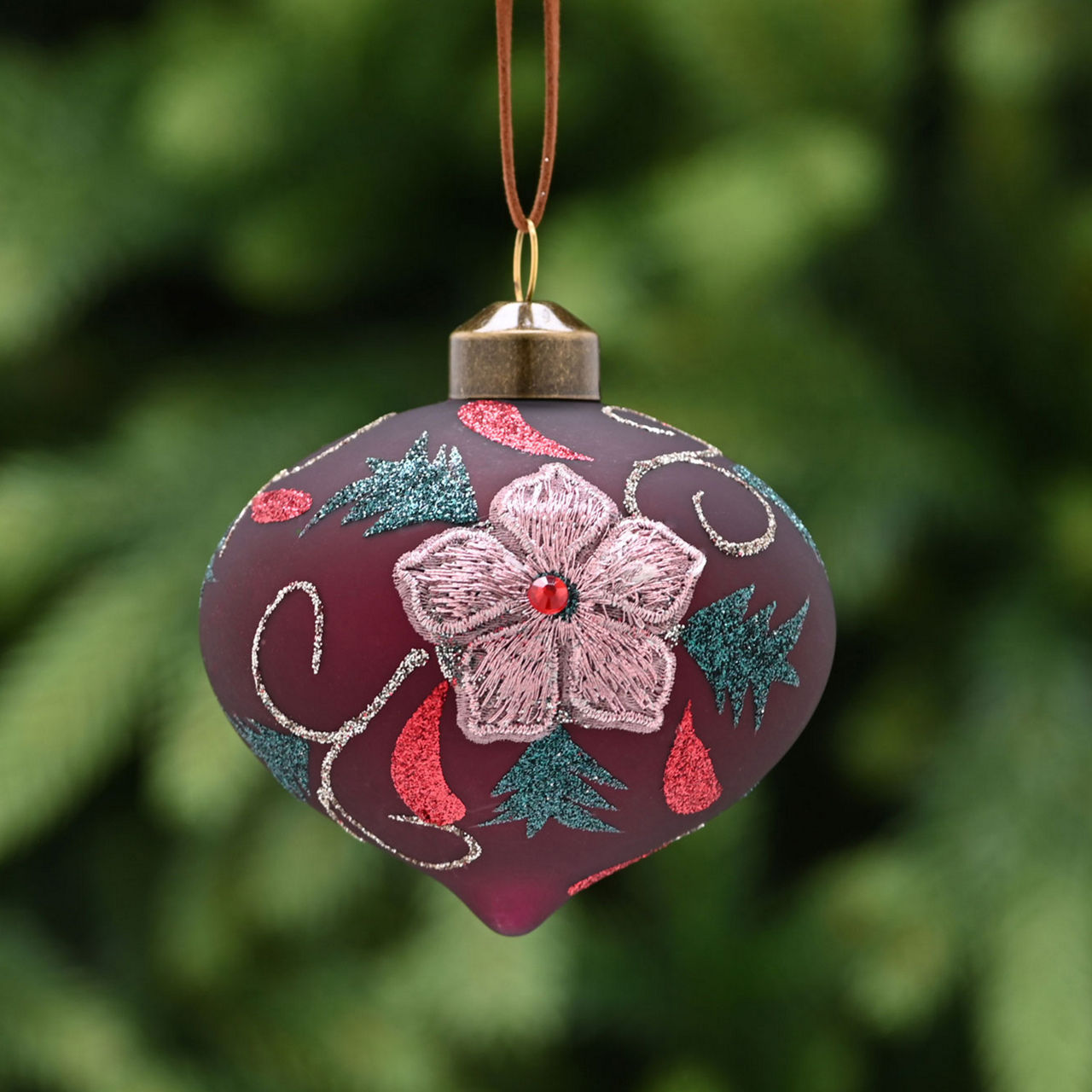 - Bulbous shape, poinsettia details, swing tag hanging loop